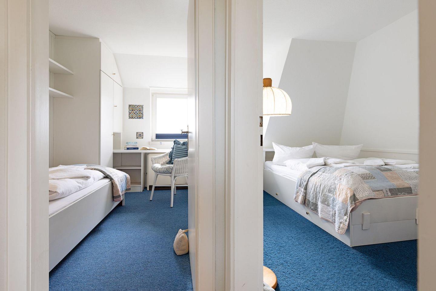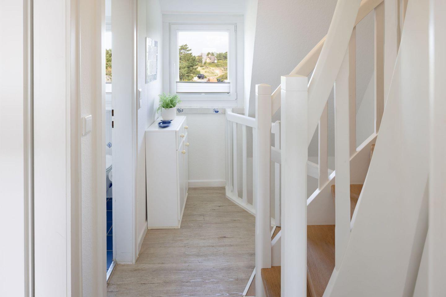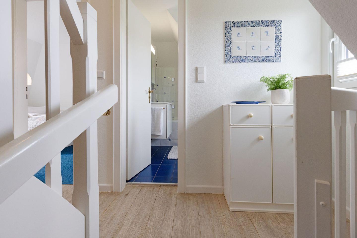 Das Haus verfügt im 1. OG (Wendeltreppe) über ein Schlafzimmer mit Doppelbett und ein Schlafzimmer mit Einzelbett. Im DG (stark ansteigende Treppe) befindet sich ein weiteres Schlafzimmer mit einem Einzelbett. Das geräumige Badezimmer verfügt über eine Duschbadewanne.