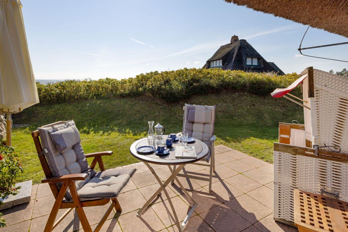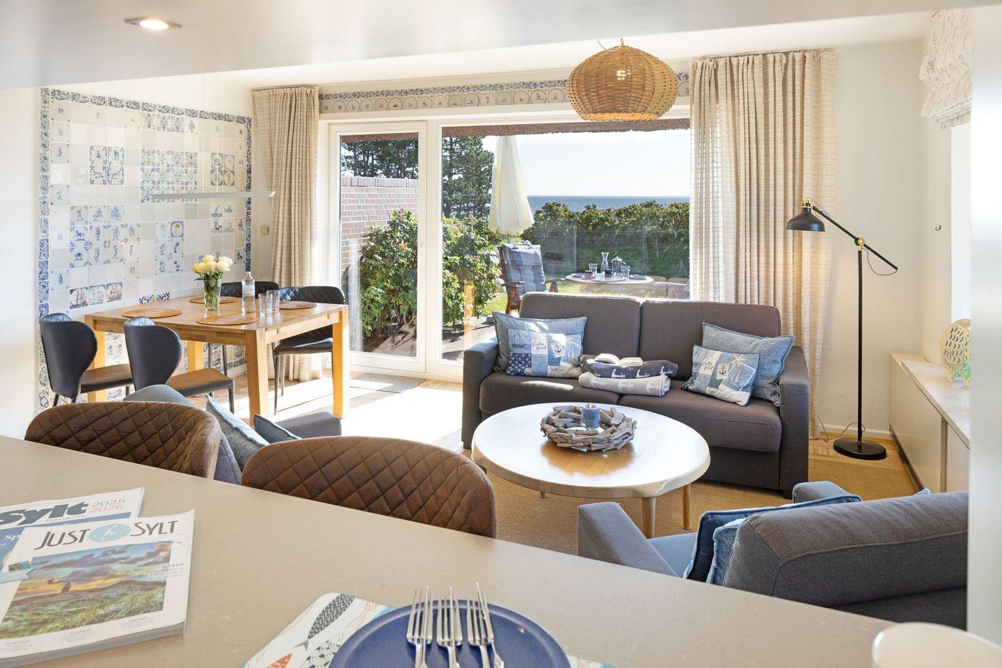Über die Terrassentür im Wohnbereich kommen Sie in den Garten mit Meerblick.