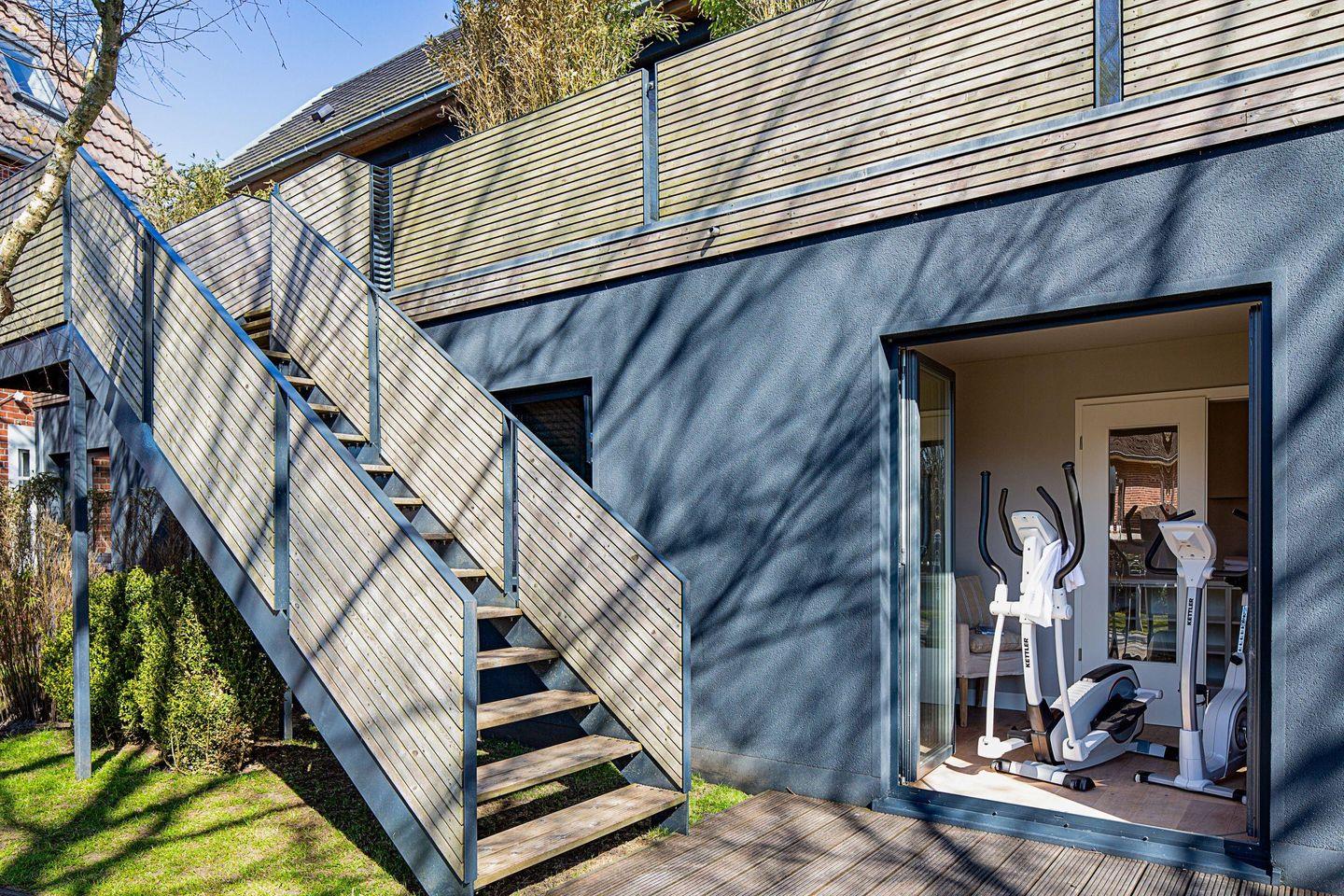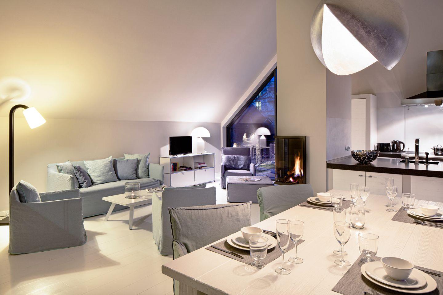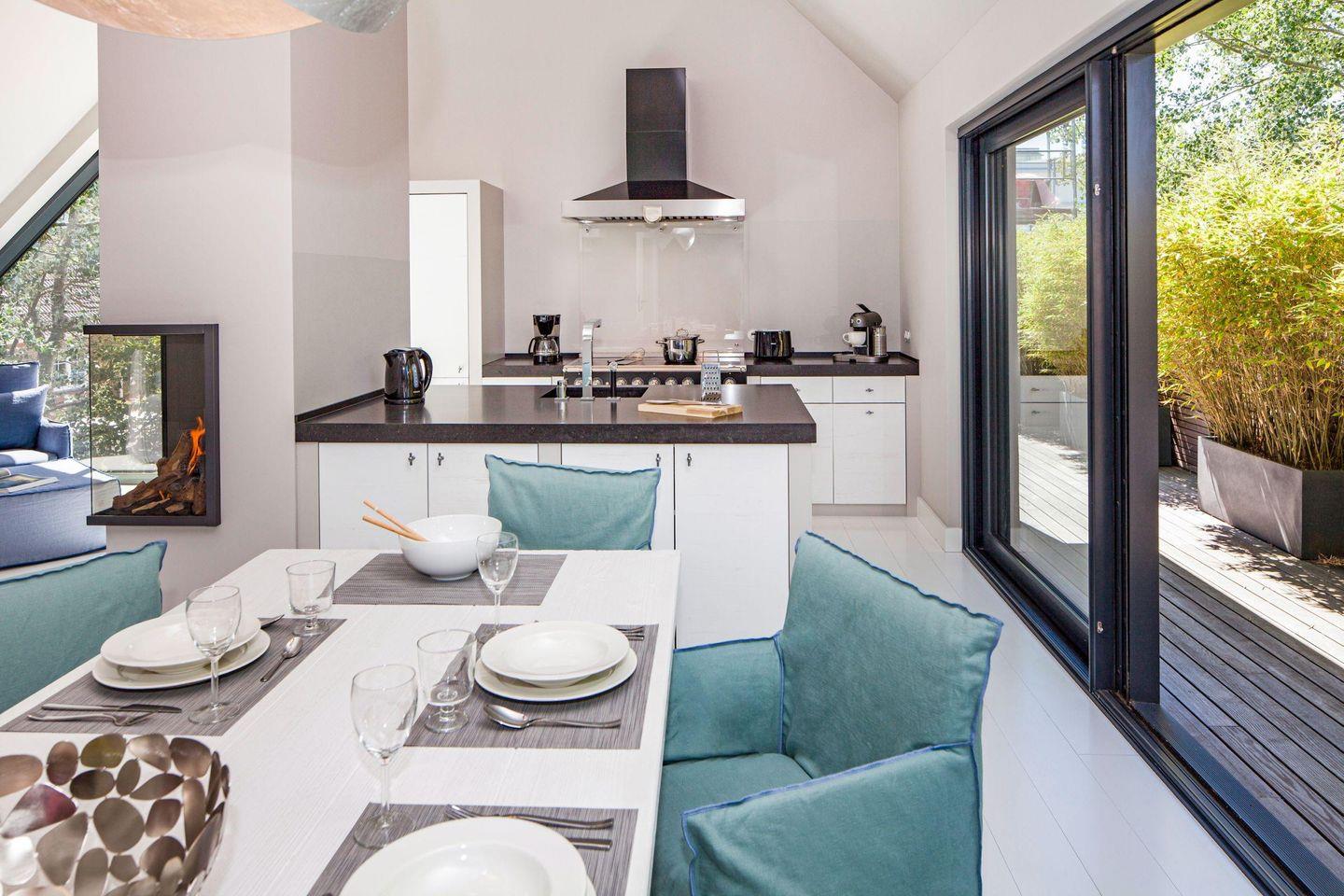 Modernes Feriendoppelhaus für bis zu vier Personen mit Kamin, Terrasse und Fitnessbereich.