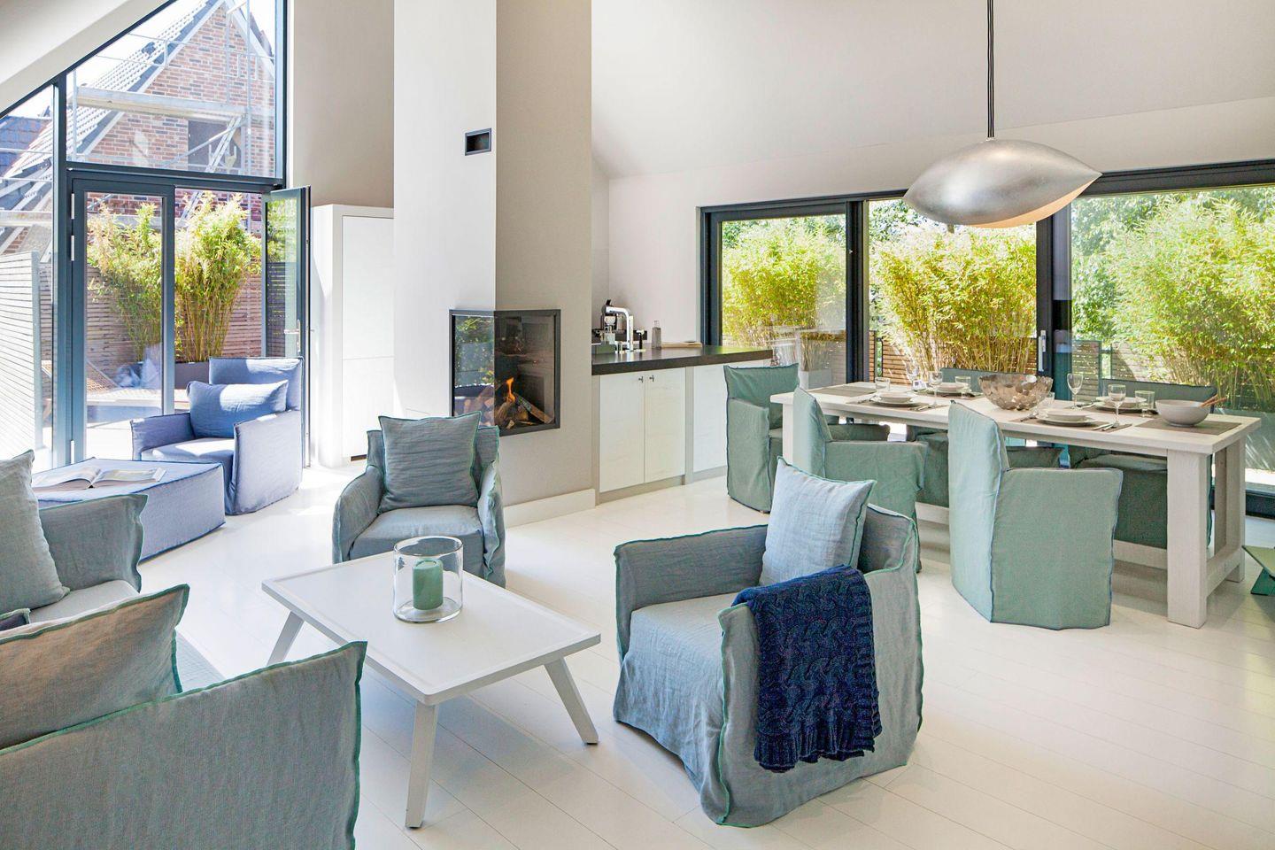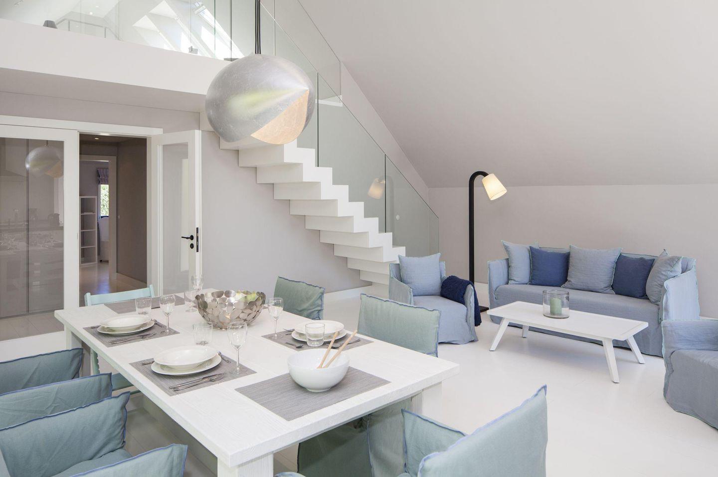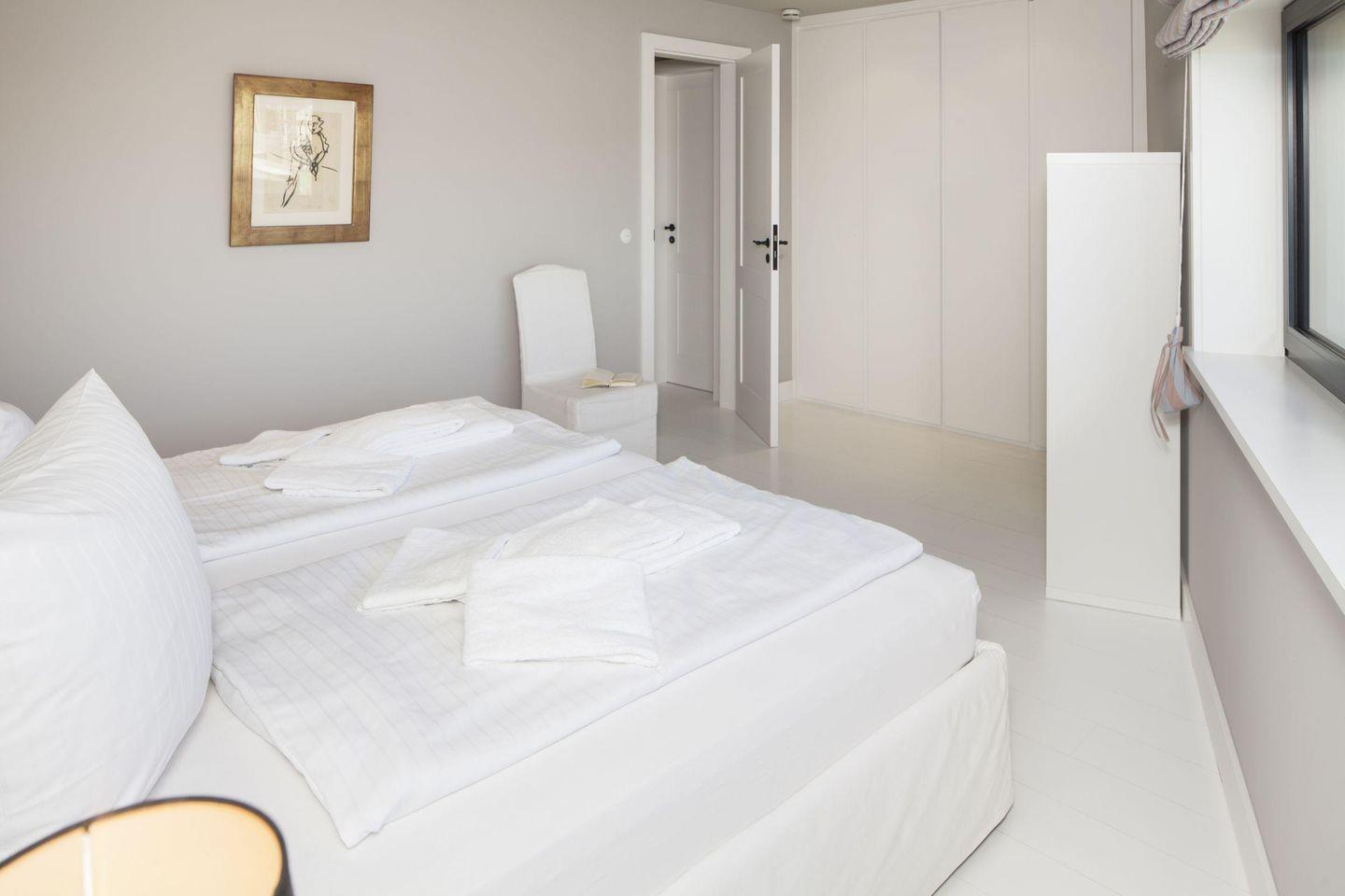 Eine Schlafcouch ist zusätzlich im Wohnzimmer vorhanden. Zwei Bäder, ebenfalls in der 1. Etage - eines mit freistehender Wanne - und Dusche, die nicht einsehbare Terrasse, sowie ein umfangreicher Fitnessbereich ergänzen dieses außergewöhnliche Feriendomizil.