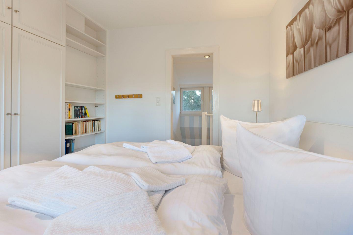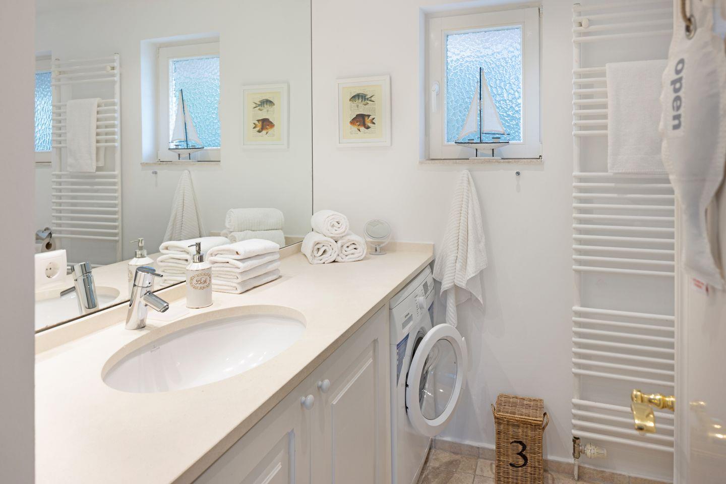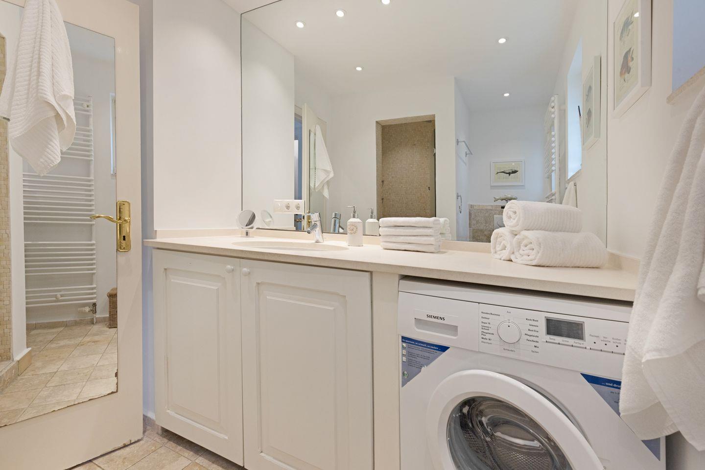 Im ersten Stock liegen drei weitere Schlafräume, jeweils mit Doppelbett und ein Bad mit Badewanne. Eine Waschmaschine steht zur Verfügung.