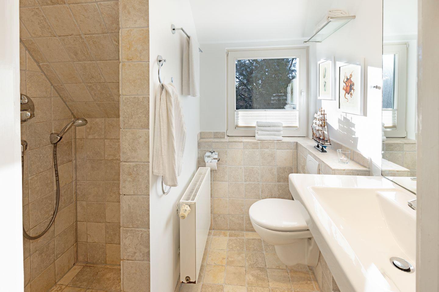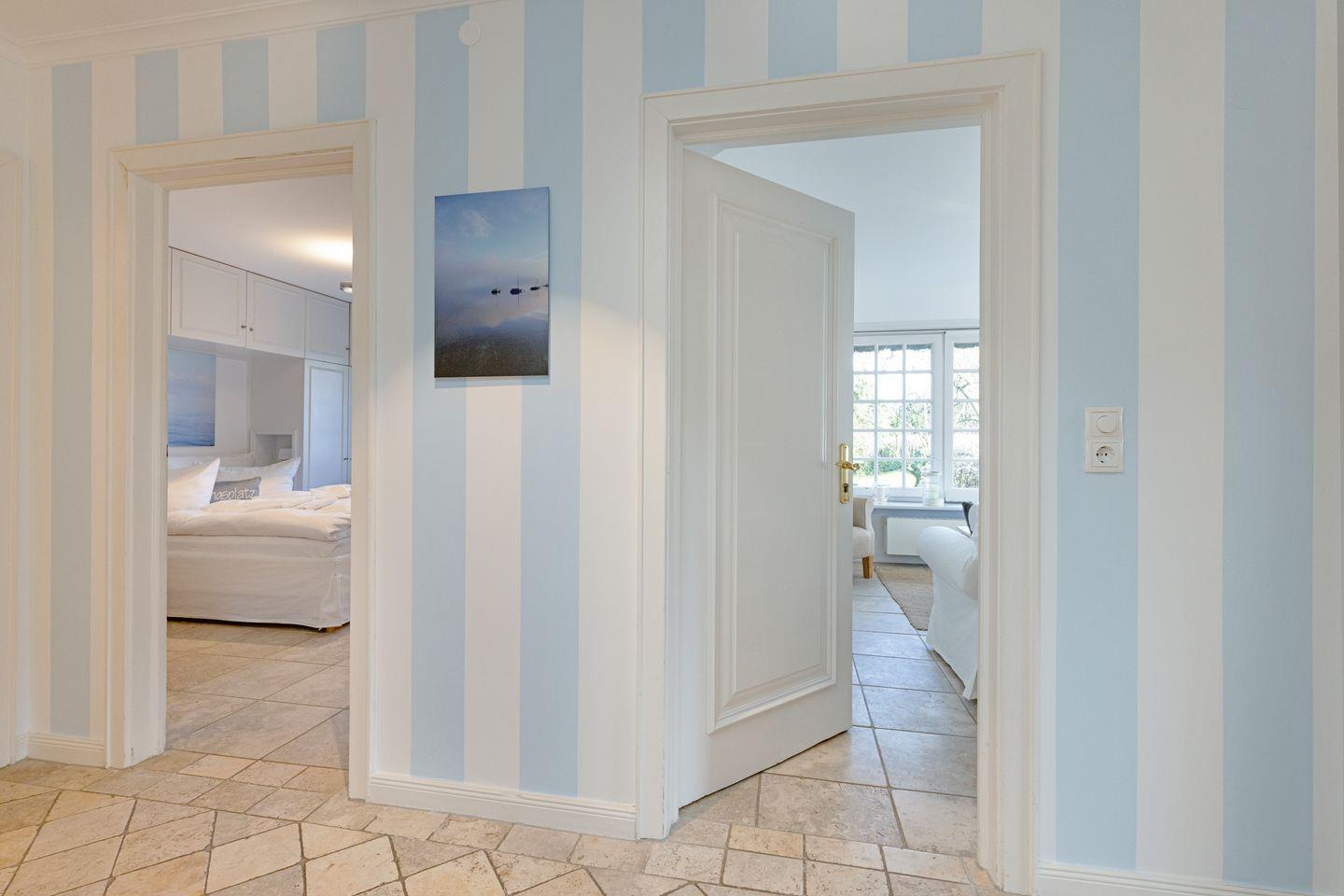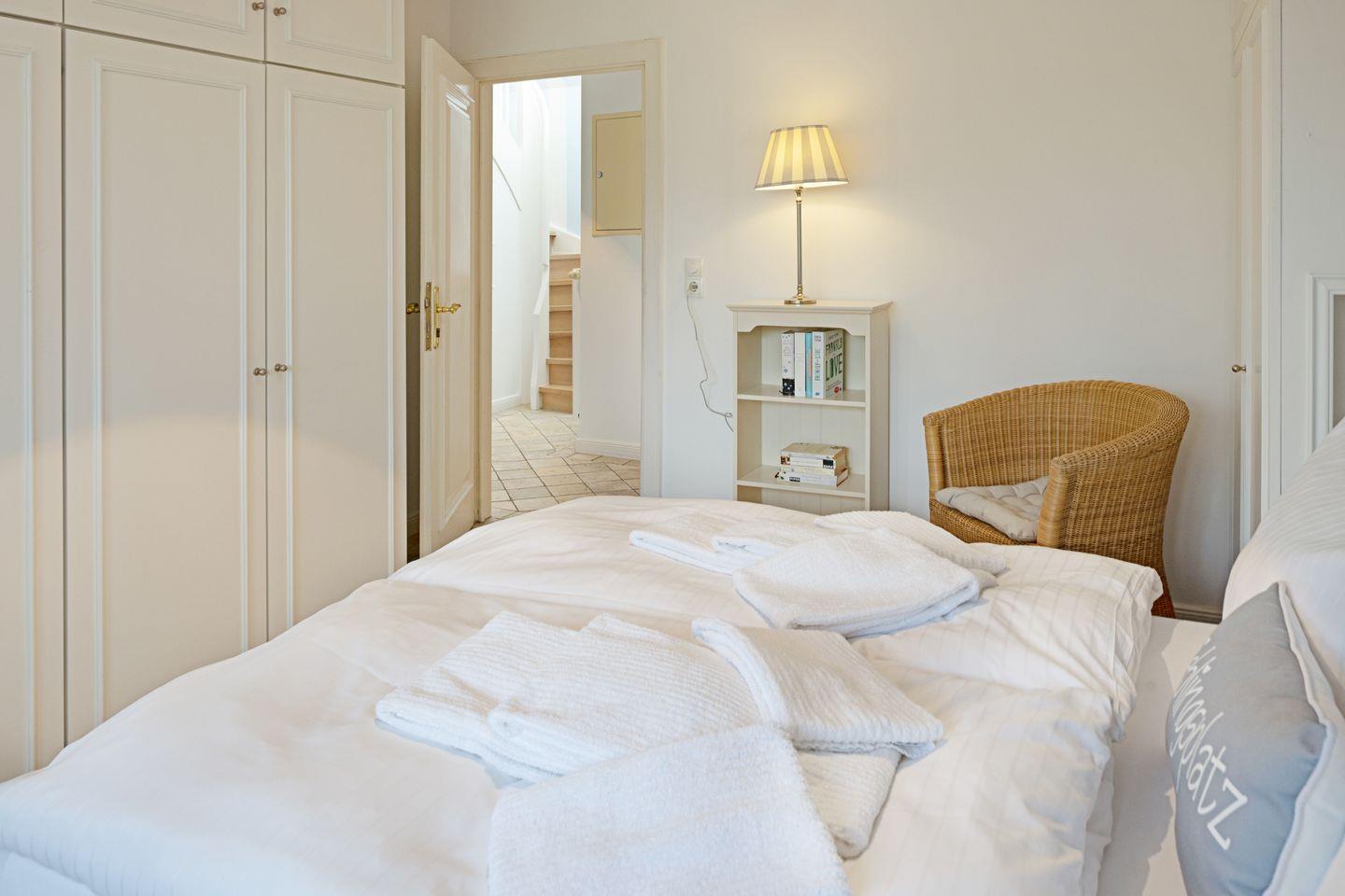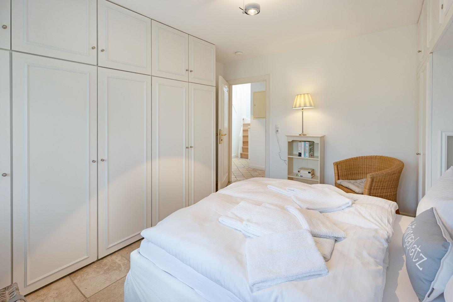 Im ersten Stock liegen drei weitere Schlafräume, jeweils mit Doppelbett und ein Bad mit Badewanne. Eine Waschmaschine steht zur Verfügung.