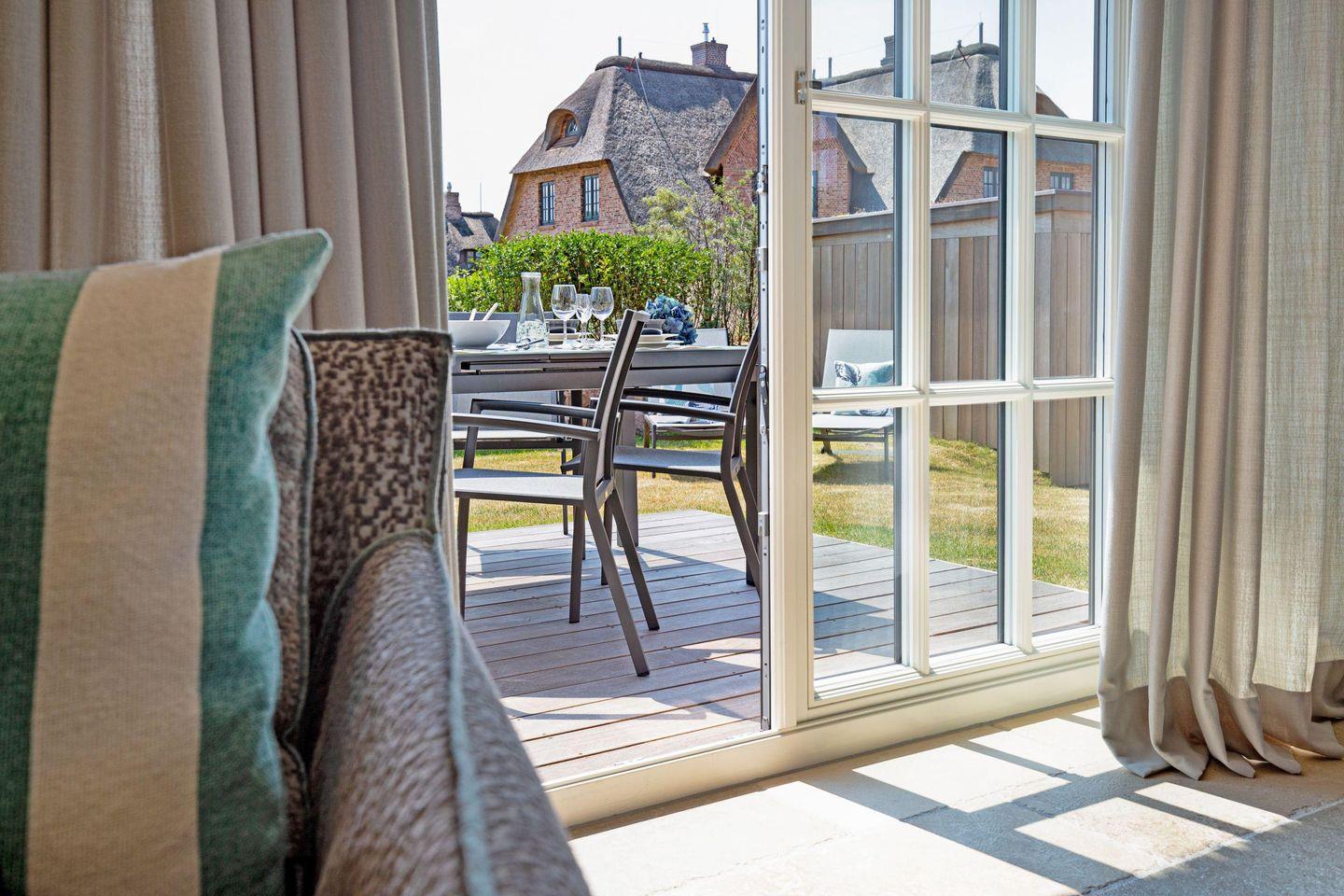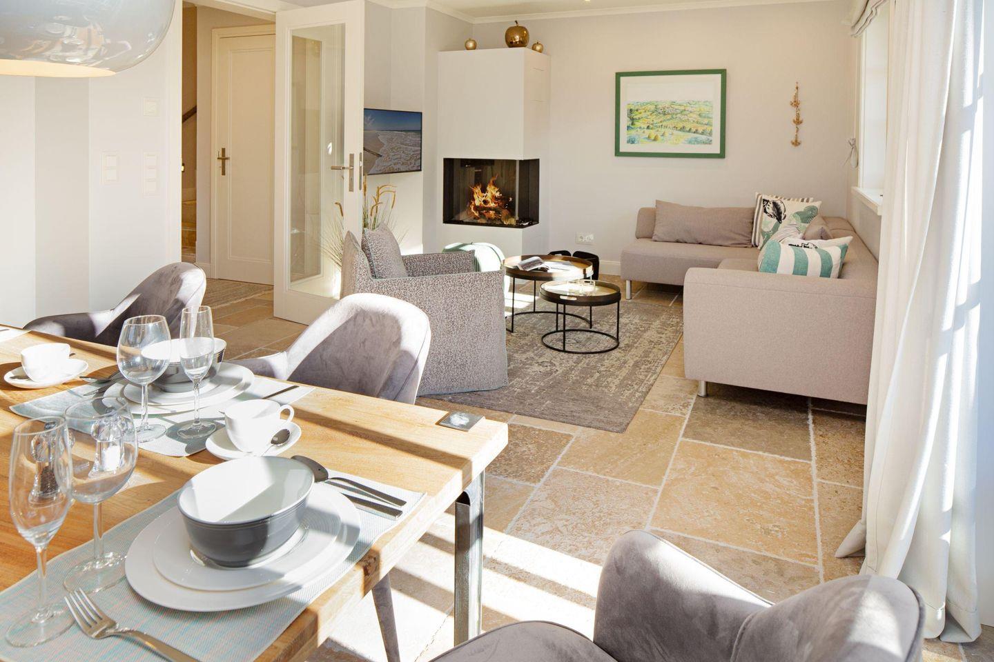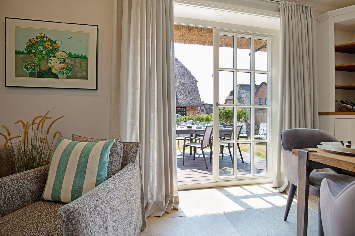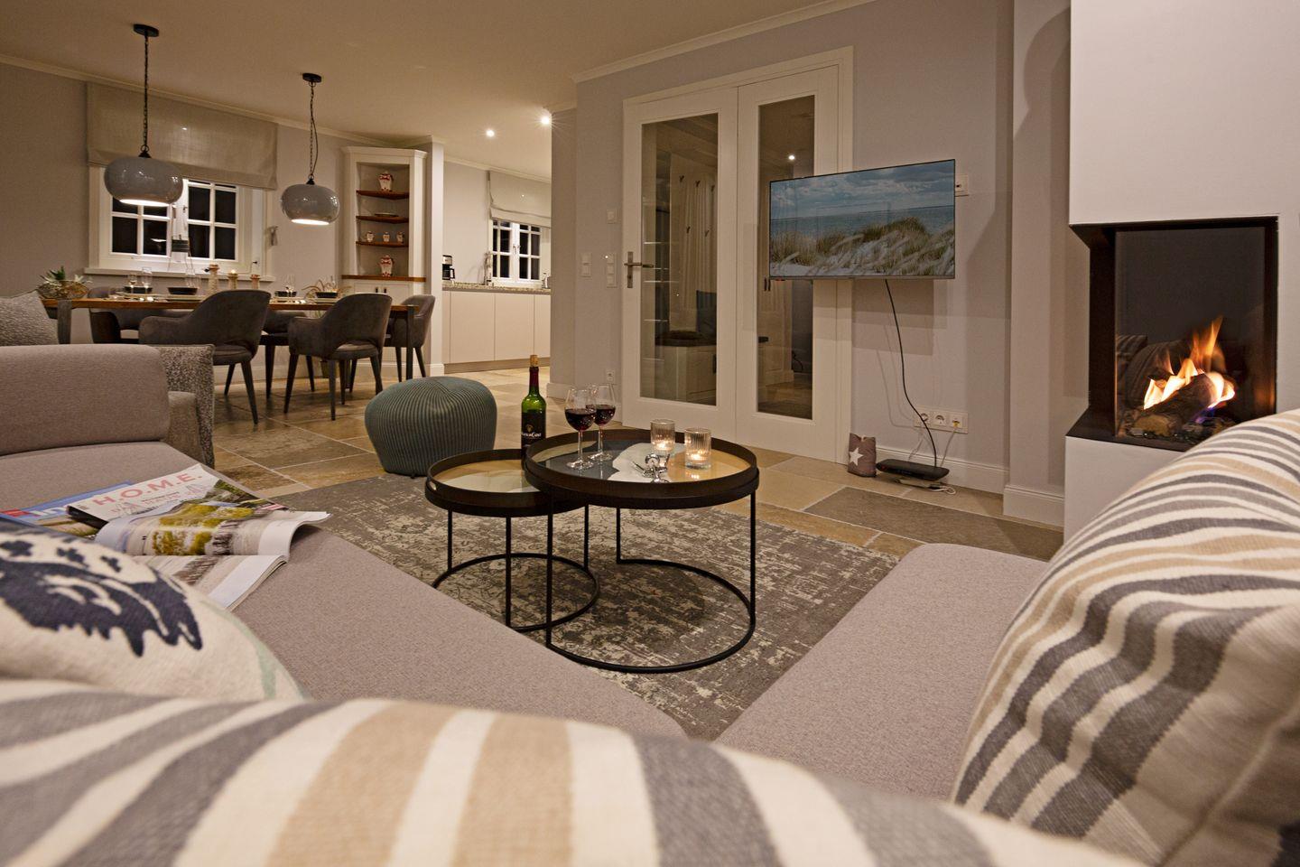 Großzügiges Feriendoppelhaus unter Reet für bis zu sechs Personen mit Gaskamin, Garten und Terrasse in Strandnähe.