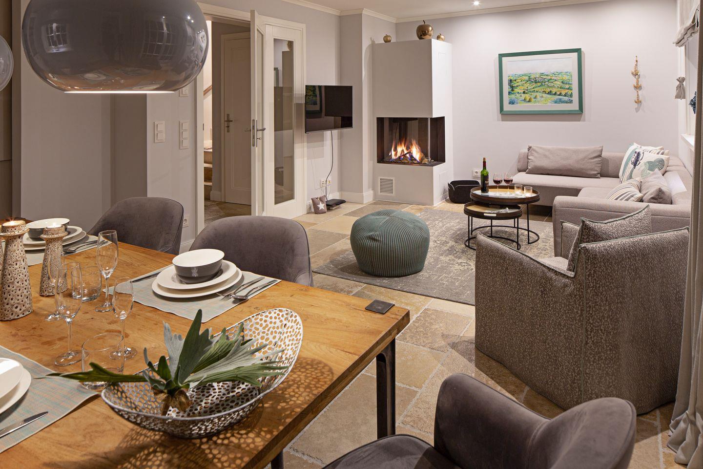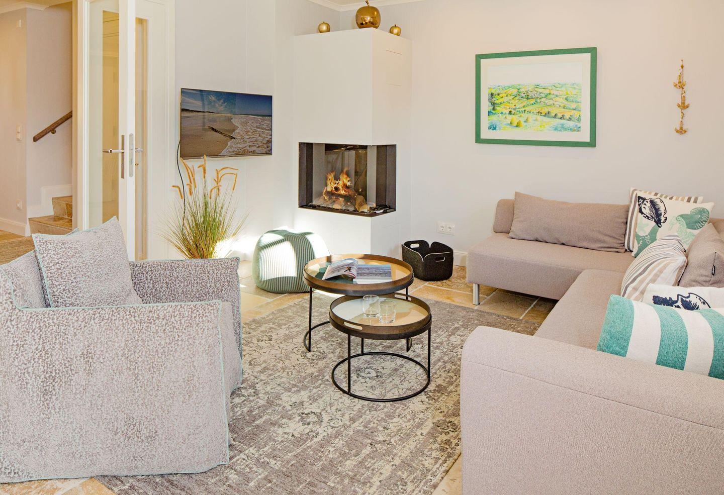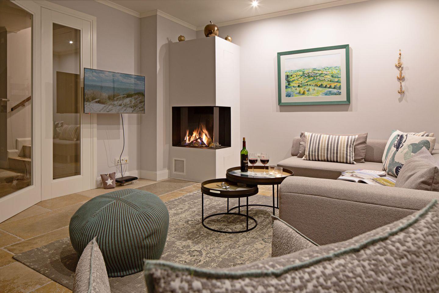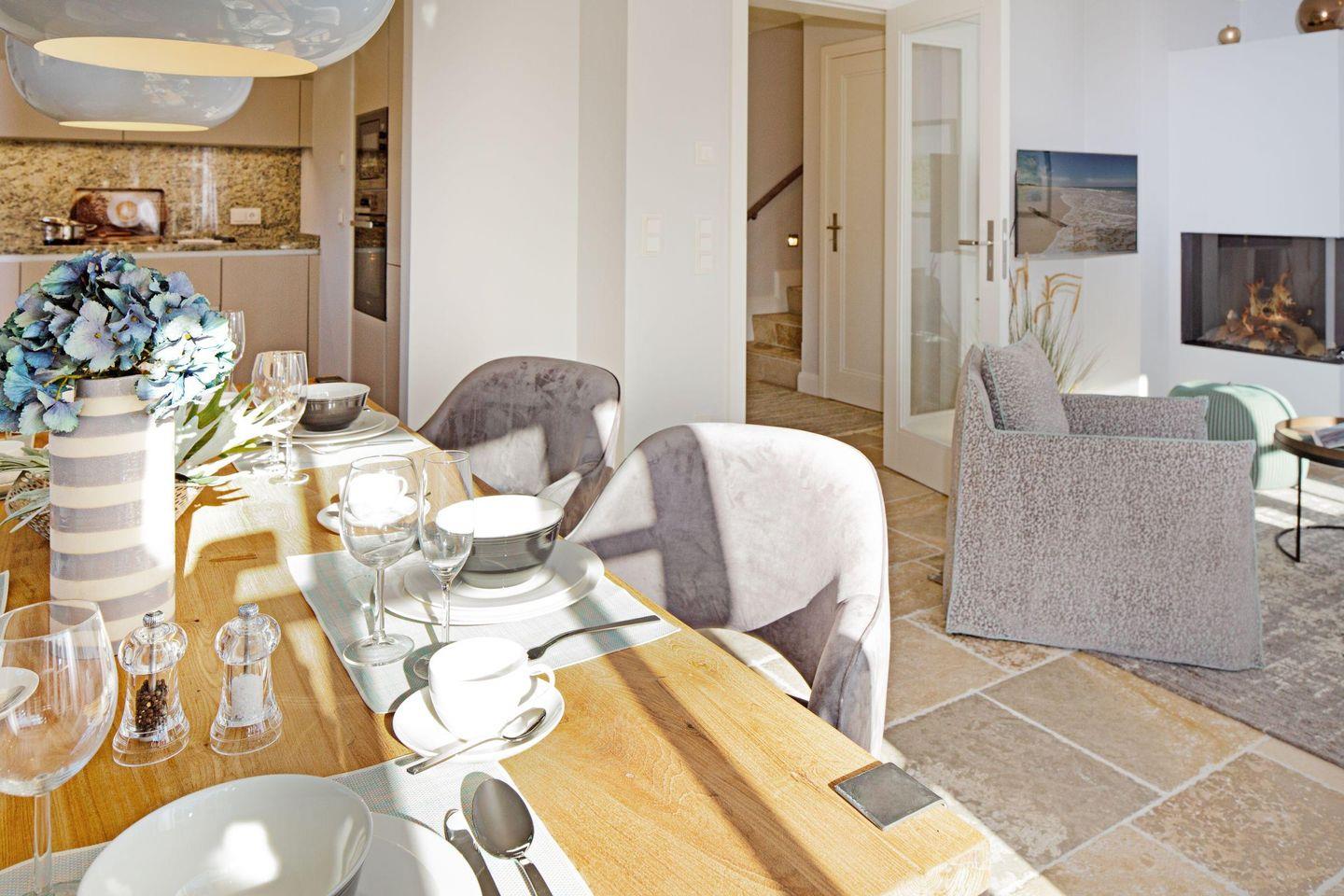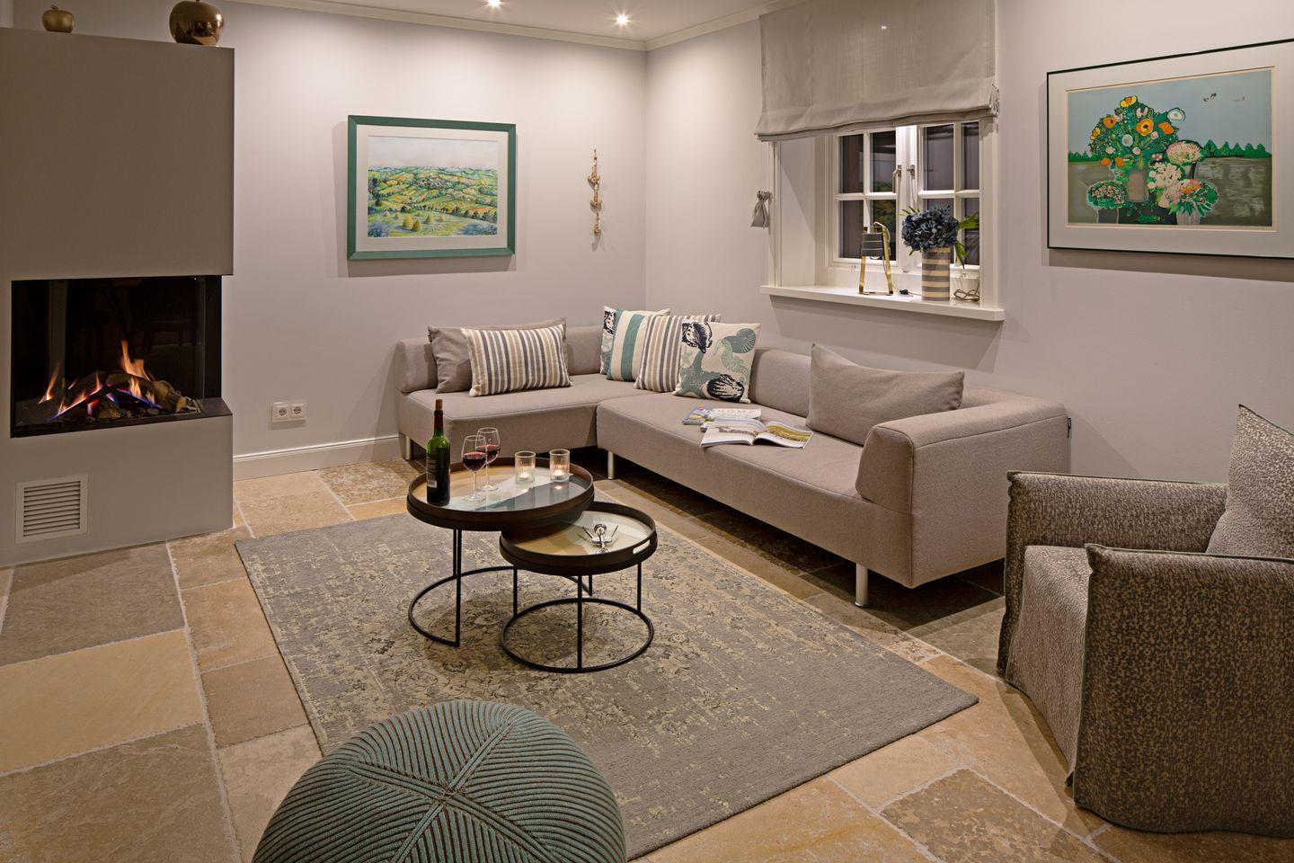Großzügiges Feriendoppelhaus unter Reet für bis zu sechs Personen mit Gaskamin, Garten und Terrasse in Strandnähe.