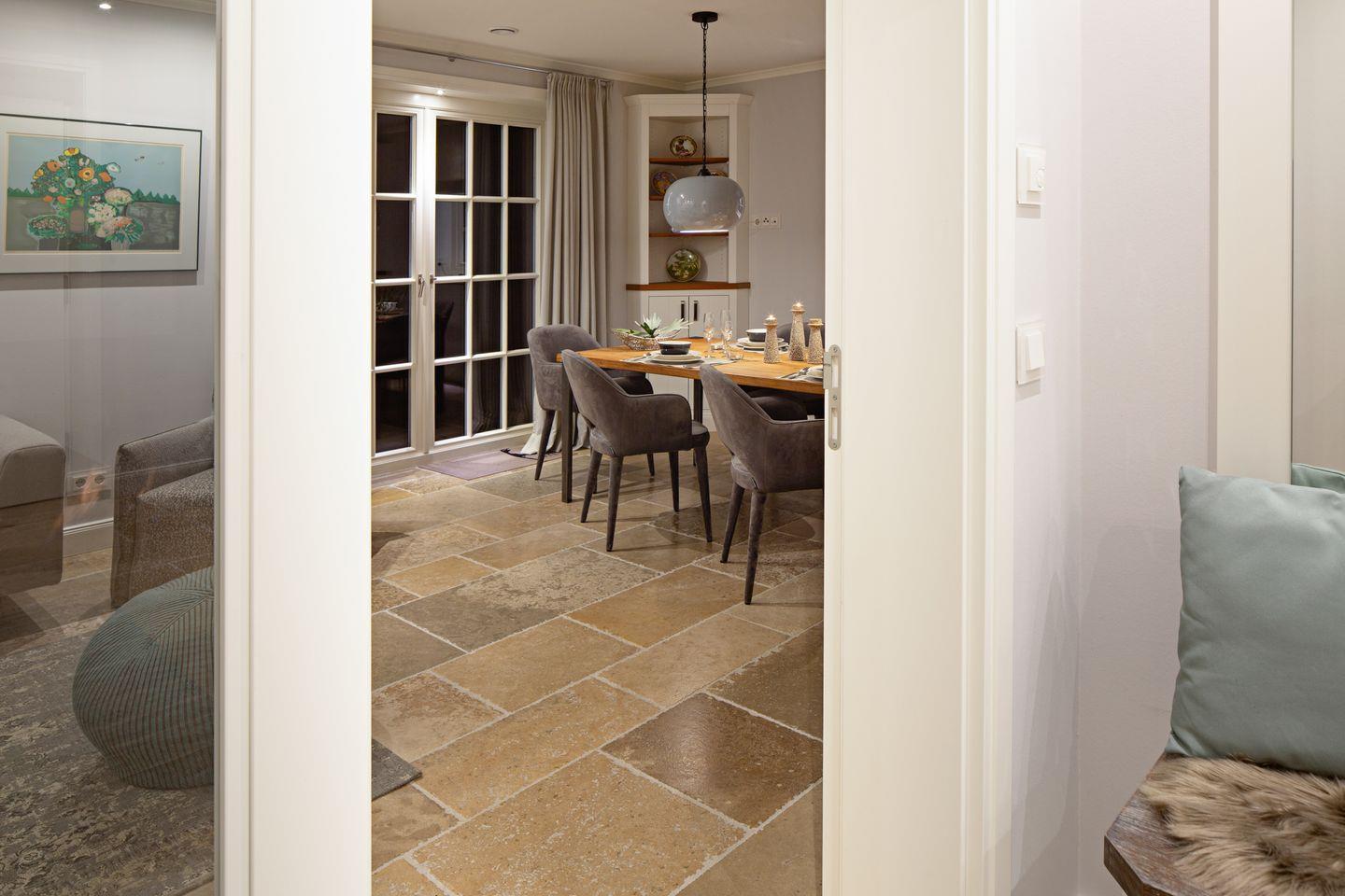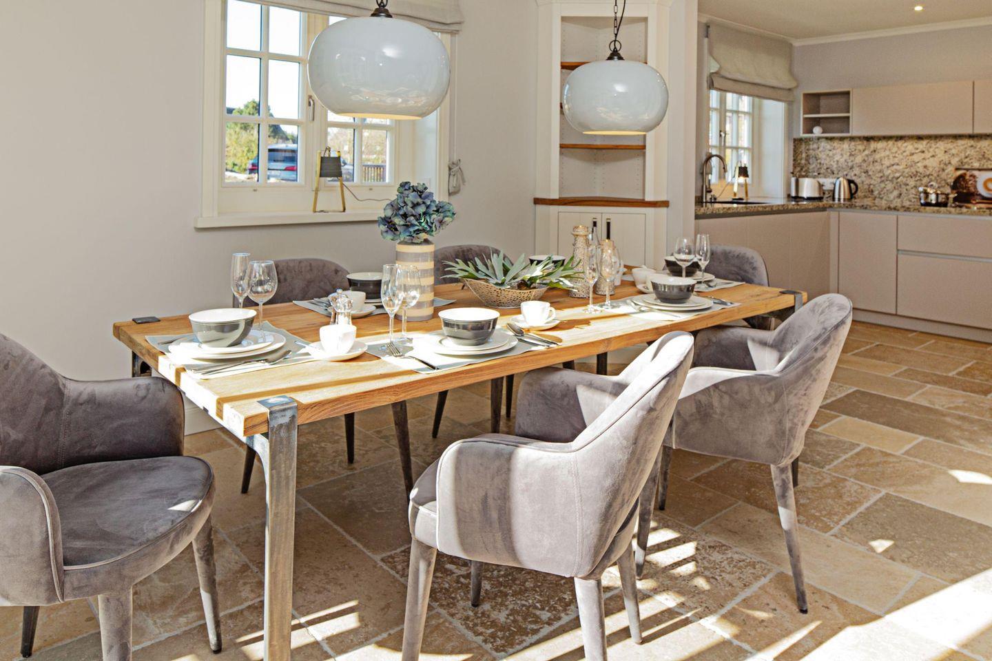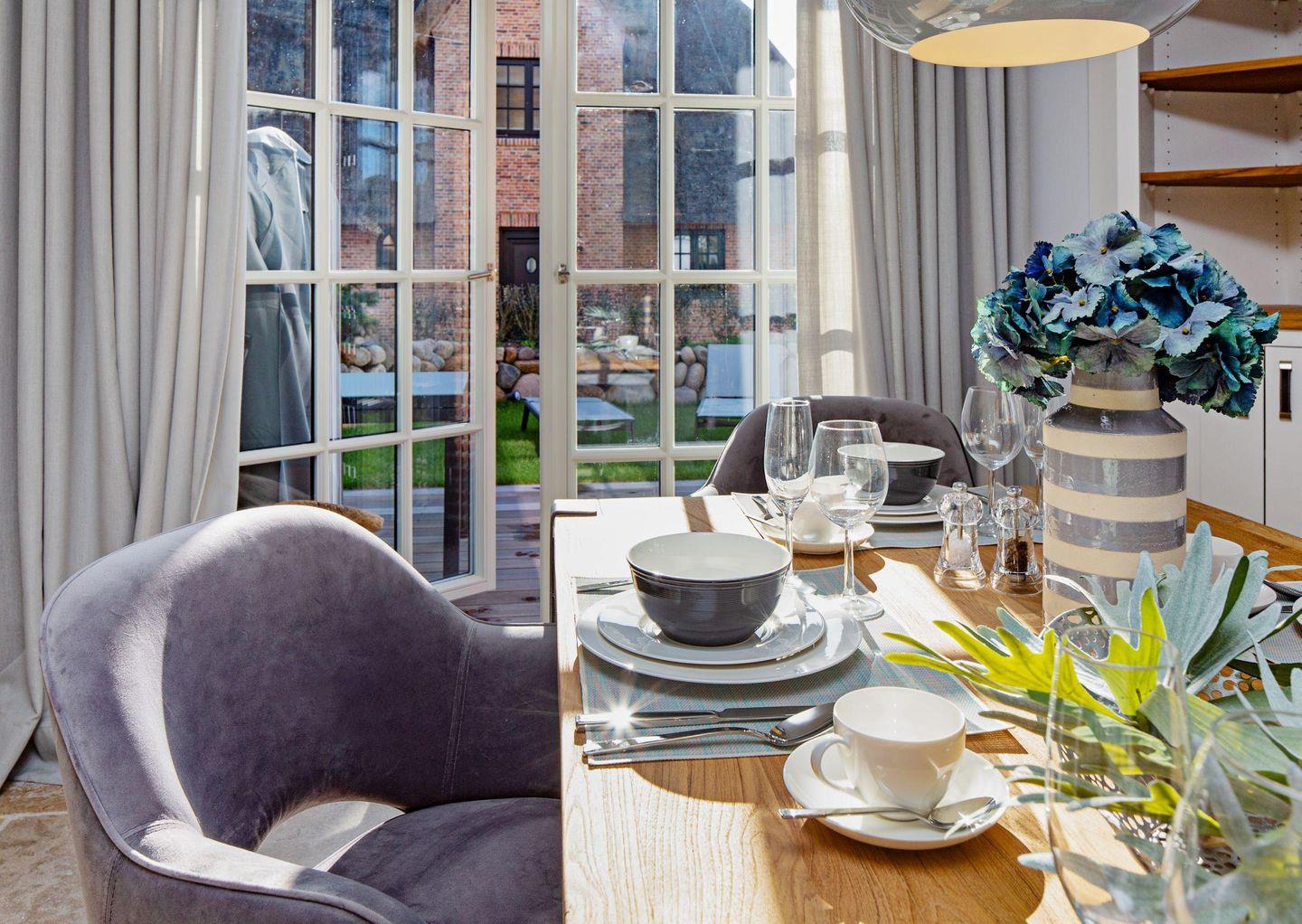 Im Wohnzimmer mit angrenzender offener Küche ist Platz für bis zu vier Personen. Vom Essbereich erreichen Sie den Garten mit Terrasse.