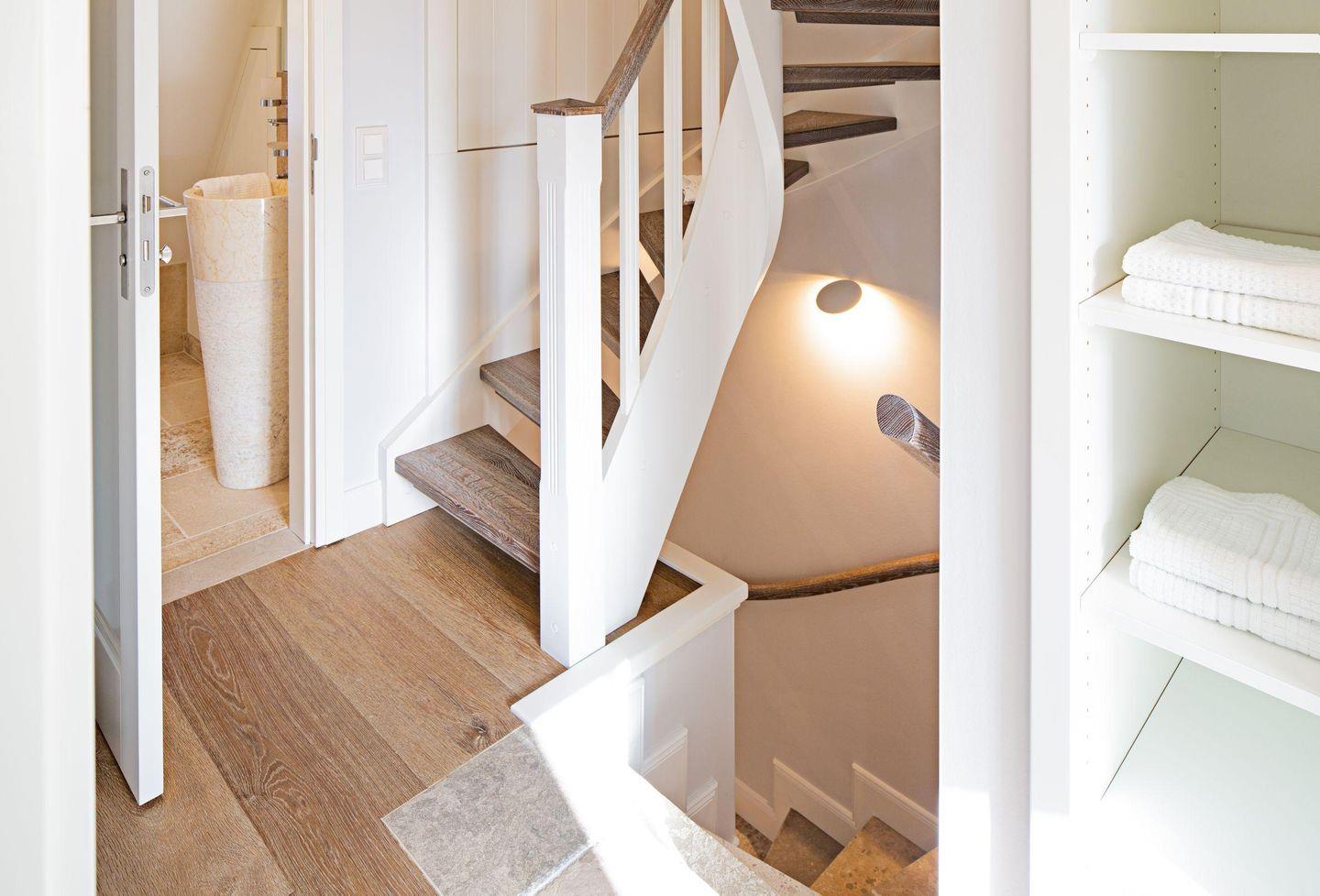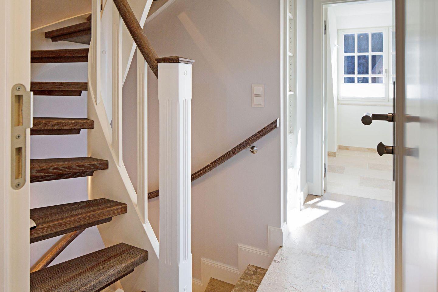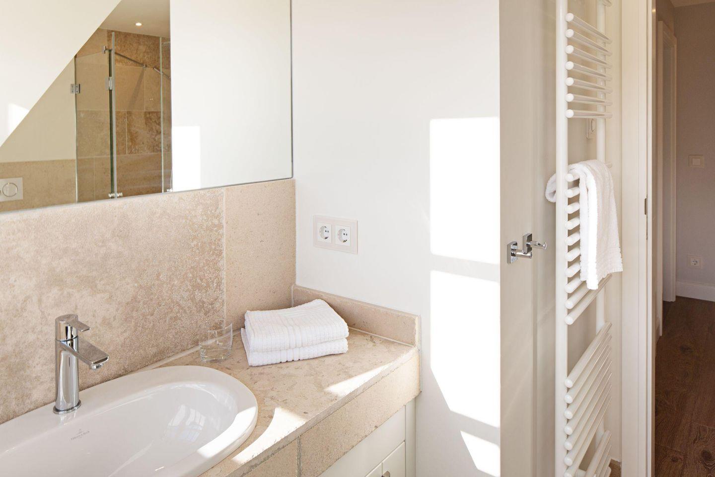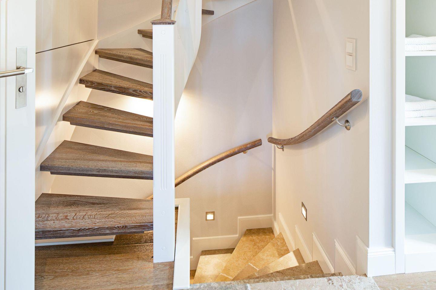 In der ersten Etage befinden sich zwei Schlafzimmer, jeweils mit Doppelbett und jeweils mit eigenem Bad und ein weiteres Schlafzimmer mit 2 Einzelbetten.