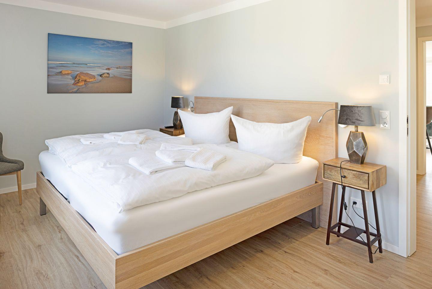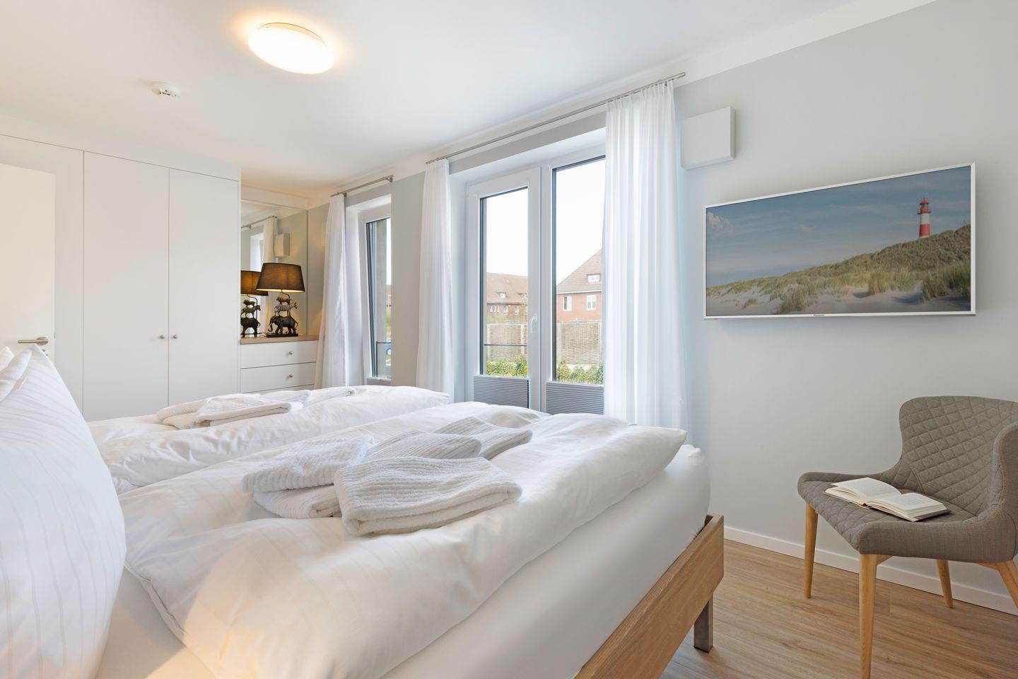 Das große Schlafzimmer verfügt über ein Doppelbett (180 x 200 cm), einen Fernseher, eine Sitzbank, einen großzügigen Kleiderschrank sowie einen Safe.
