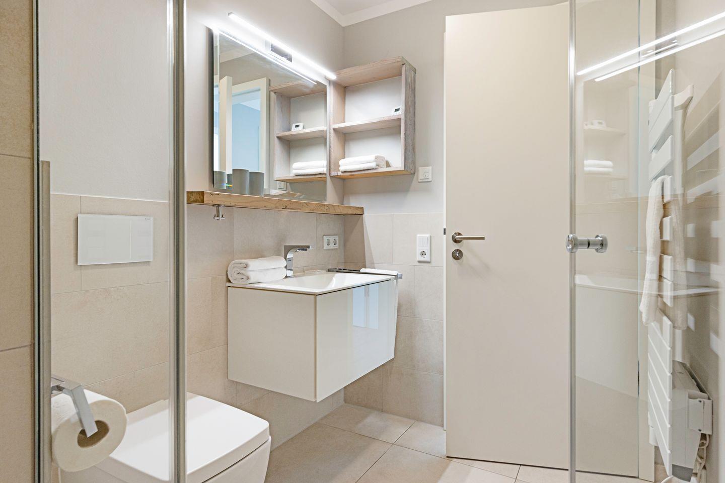 Das Badezimmer ist modern mit einer bodengleichen Dusche, Waschbecken, Toilette und einer Handtuchheizung ausgestattet.