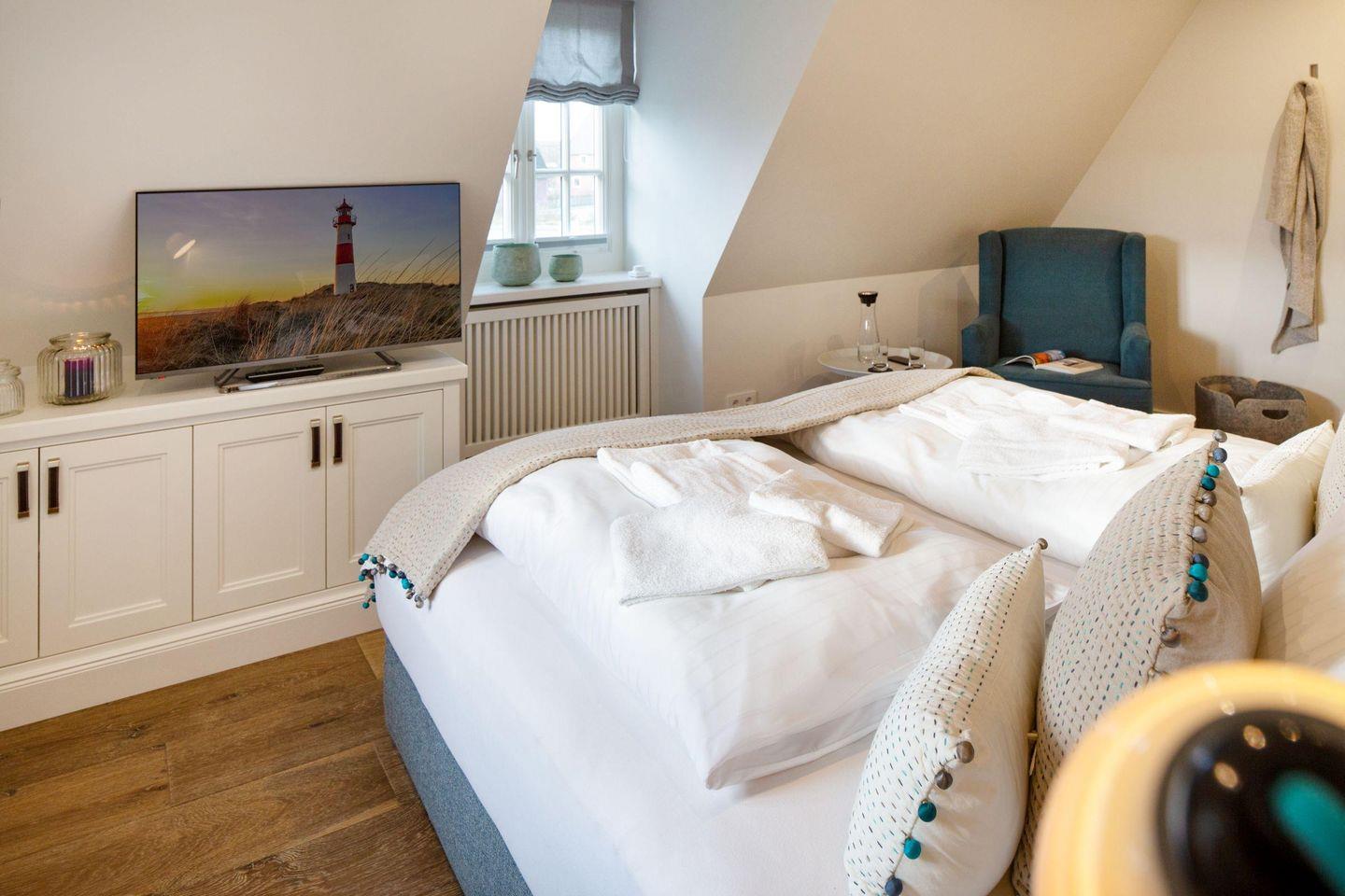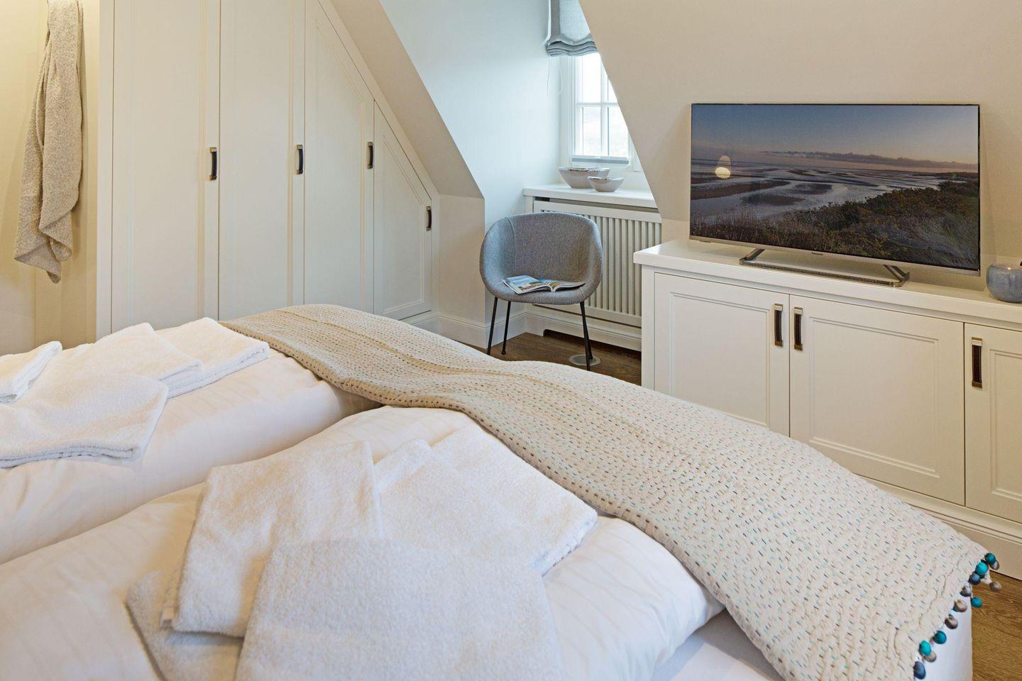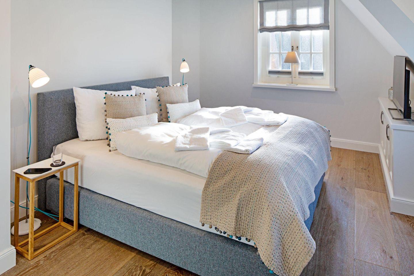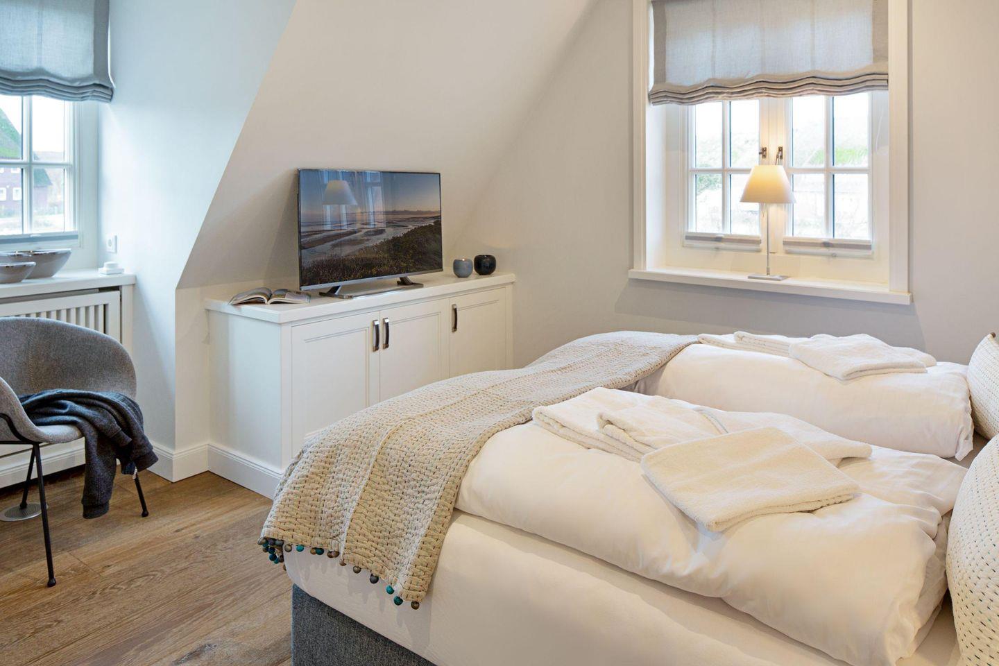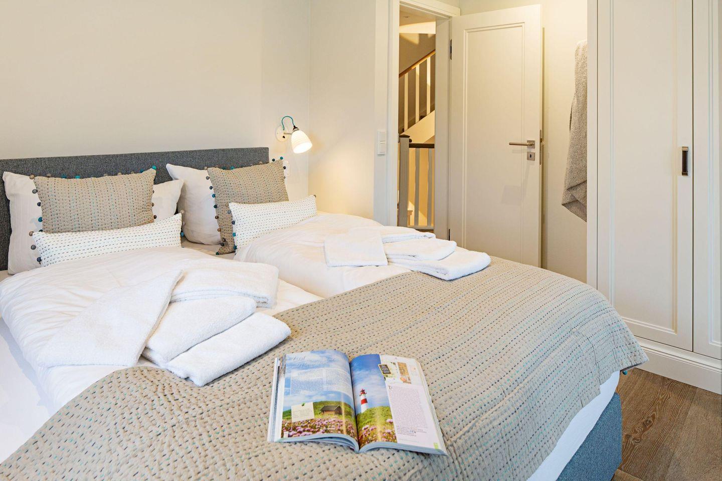 Es gibt eine Sonos-Soundanlage, einen Weinkühlschrank und einen Saunabereich mit Wellnessdusche, der das Wohlbefinden im Haus abrundet. Es stehen Ihnen in der ersten Etage zwei Schlafzimmer mit Boxspring-Doppelbetten ein Gäste-WC und ein Bad mit Badewanne zur Verfügung. Im Souterrain befinden sich ein weiteres Schlafzimmer mit mit Boxspring-Doppelbett und ein SZ mit zwei Einzelbetten, sowie ein weiteres Badezimmer.