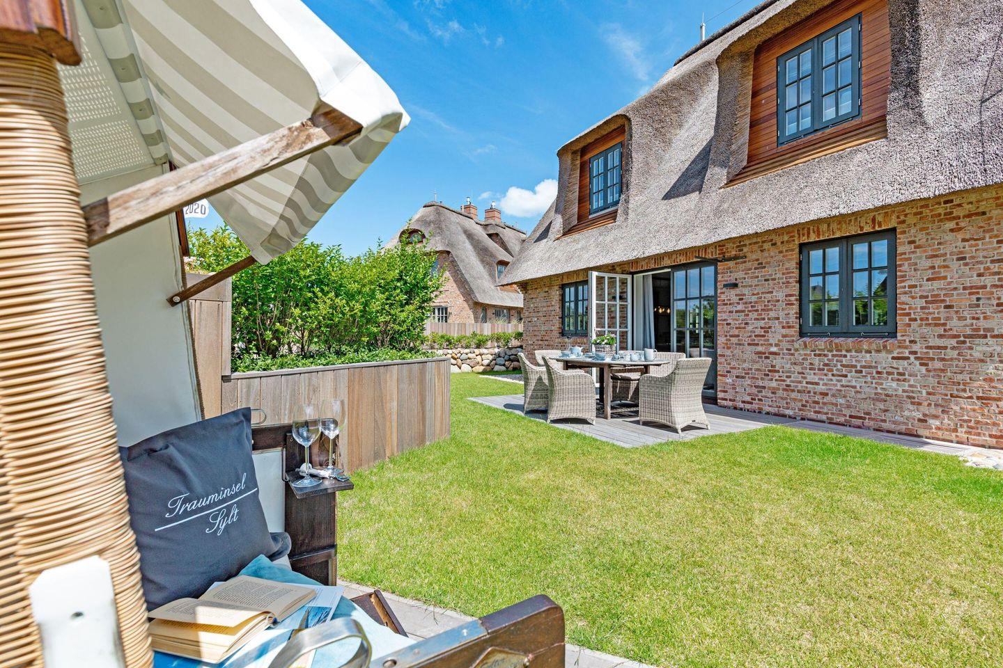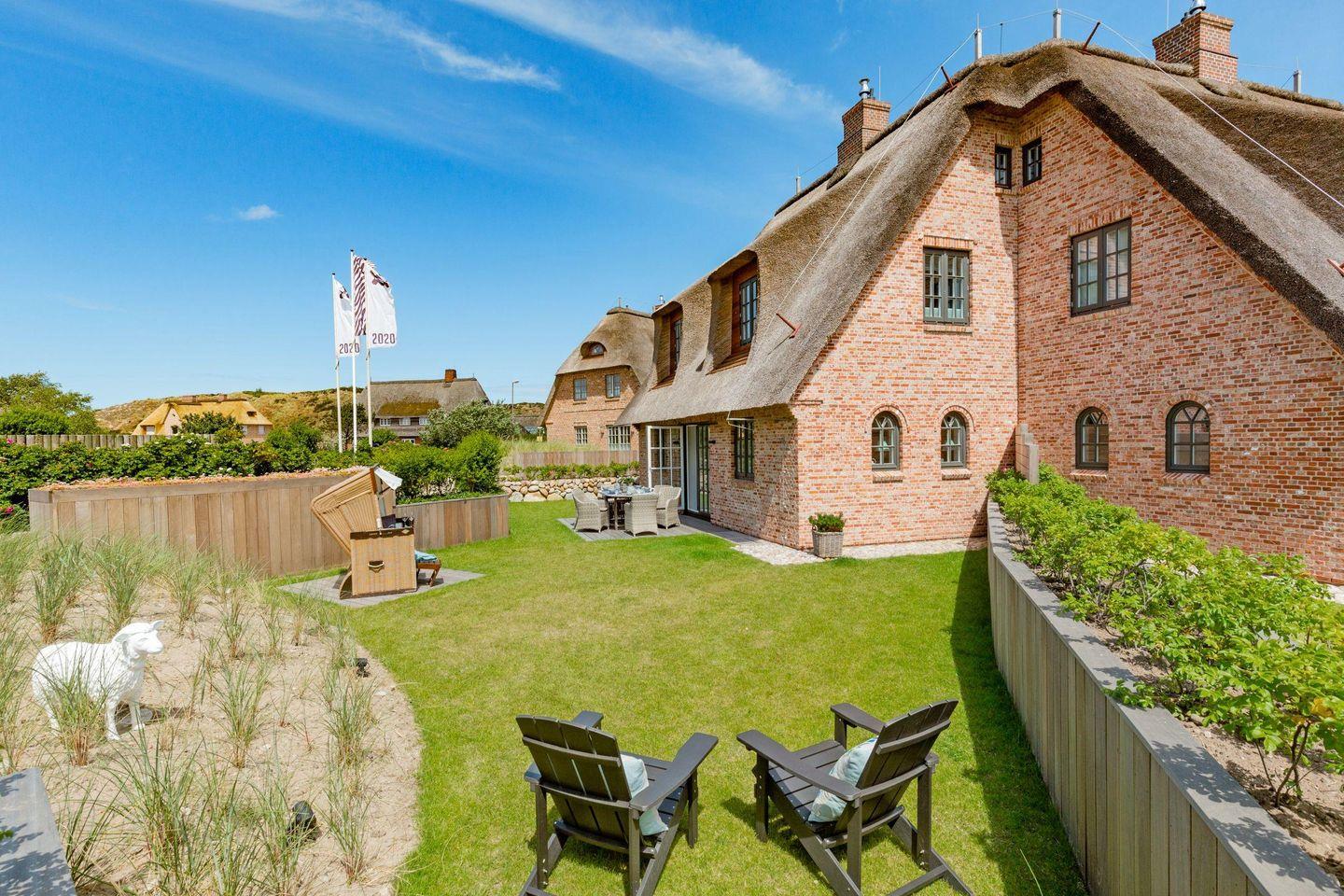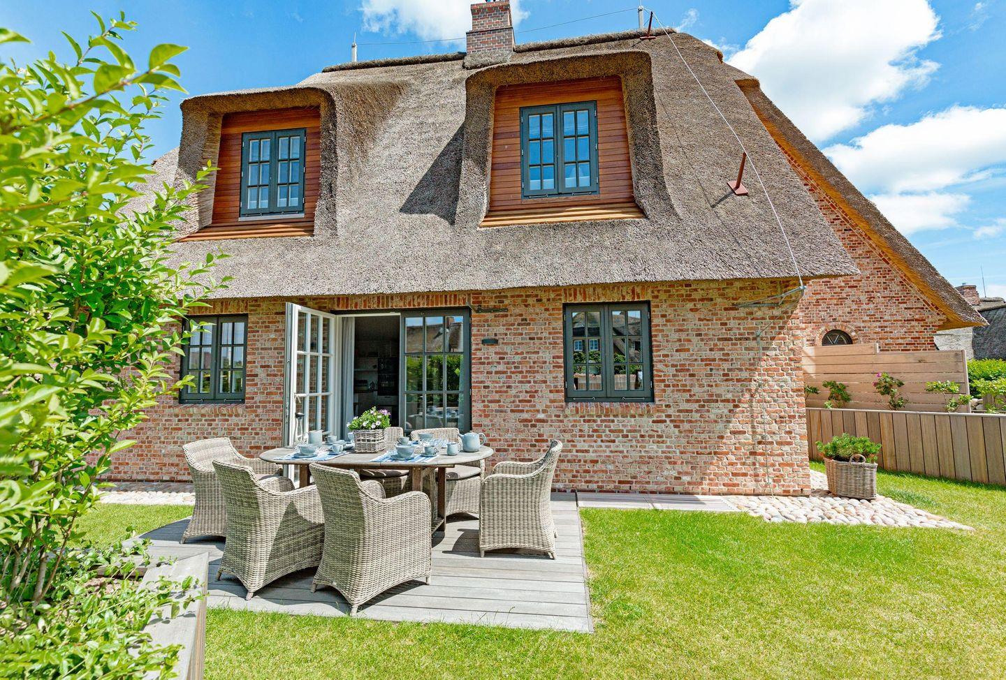 Hochwertig ausgestattetes Feriendoppelhaus unter Reet für bis zu acht Personen mit Saunalandschaft, Gas-Kamin, Garten und Terrasse in Strandnähe.