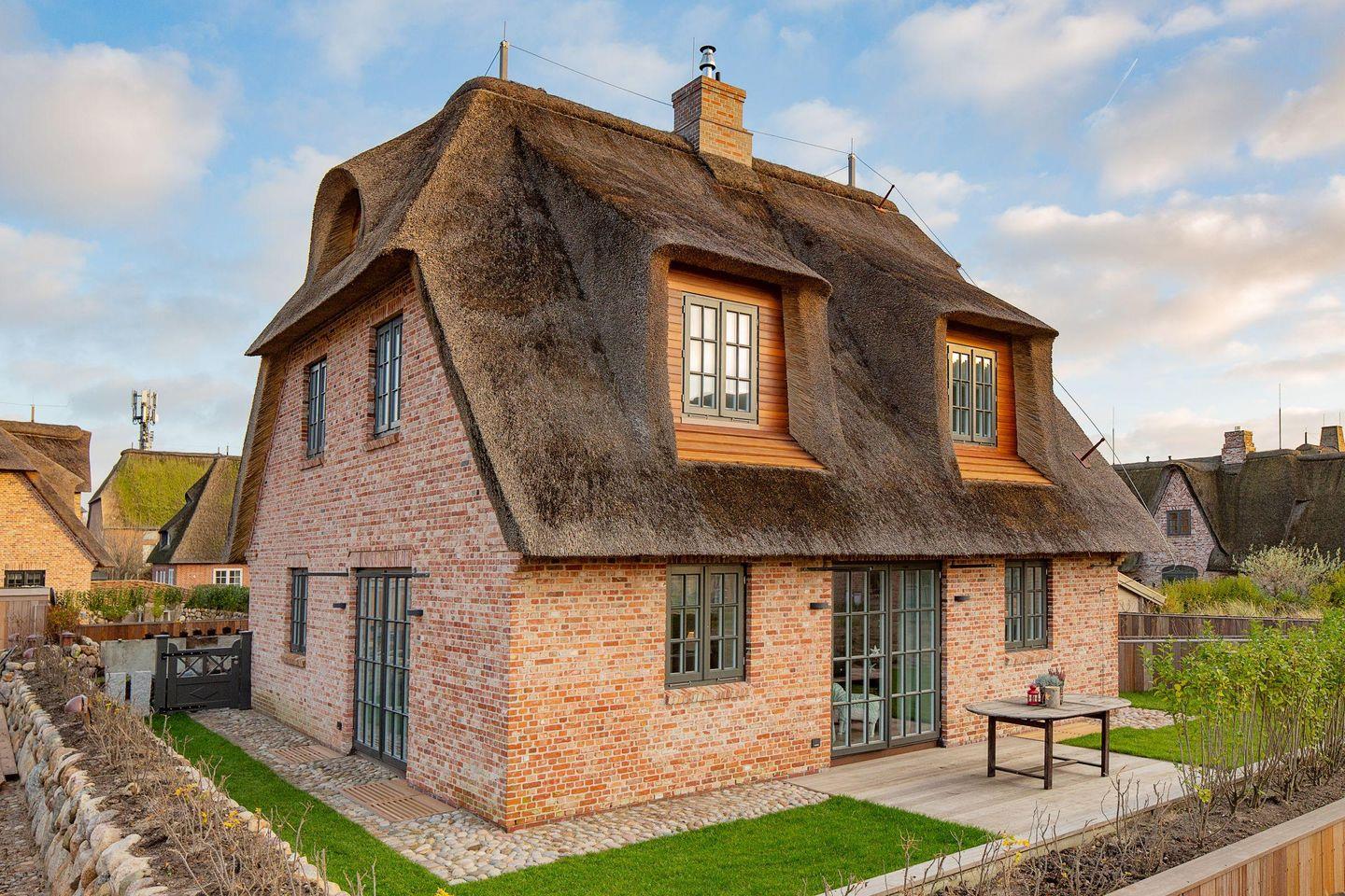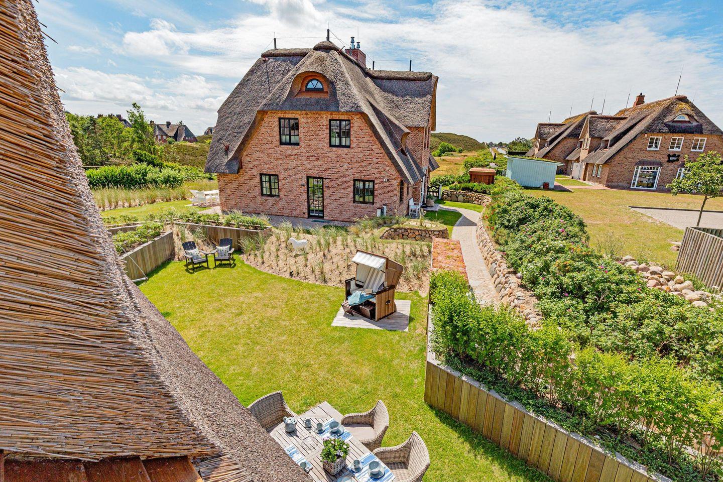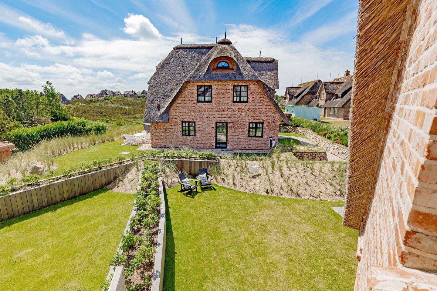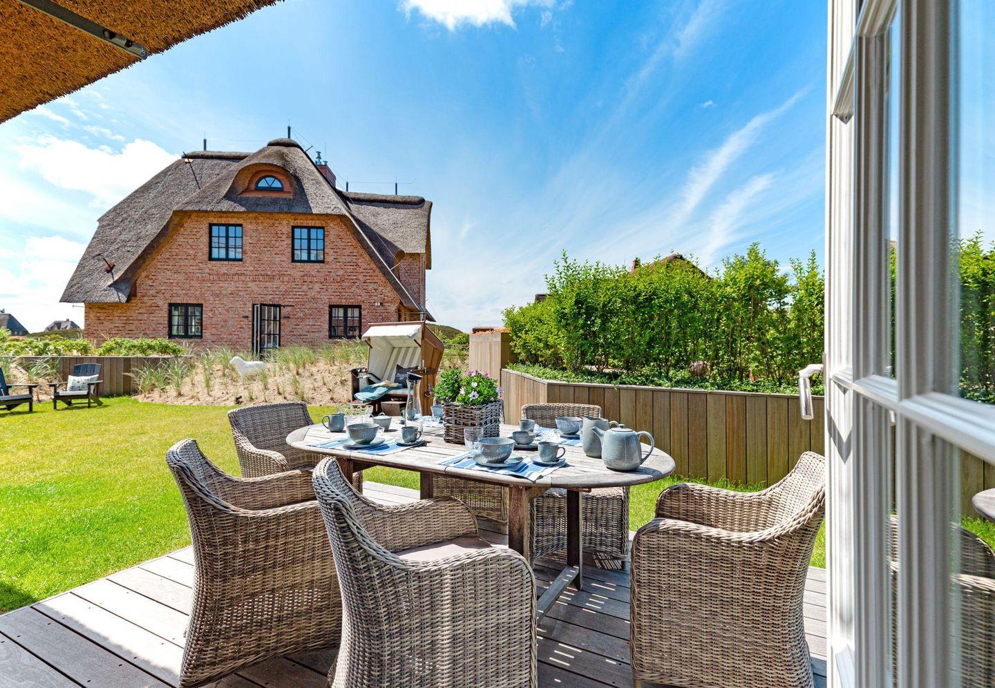 Hochwertig ausgestattetes Feriendoppelhaus unter Reet für bis zu acht Personen mit Saunalandschaft, Gas-Kamin, Garten und Terrasse in Strandnähe.