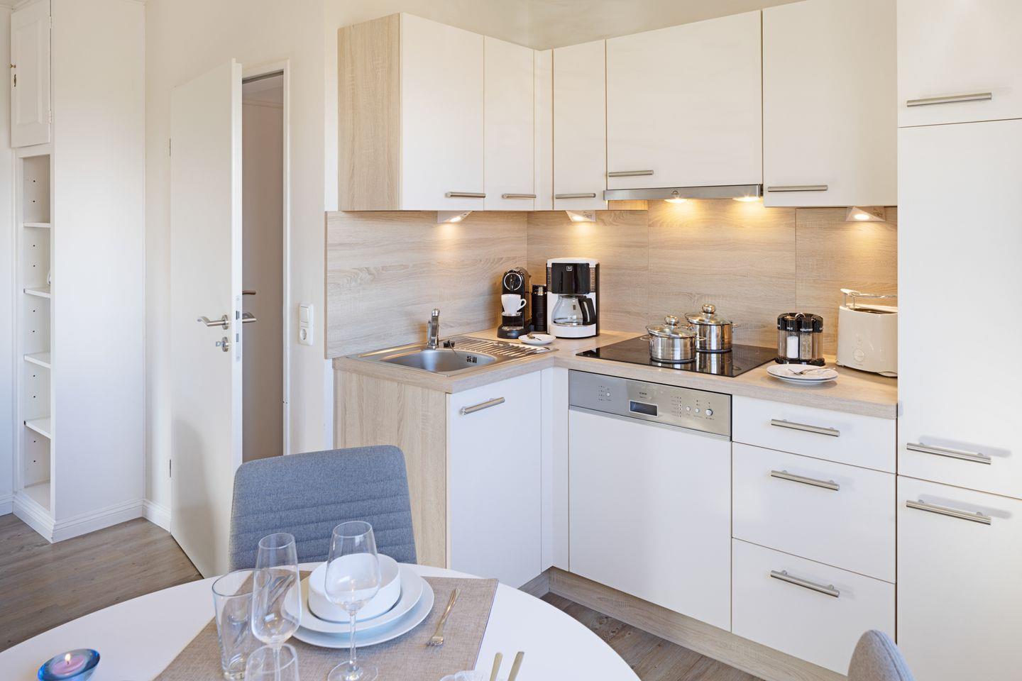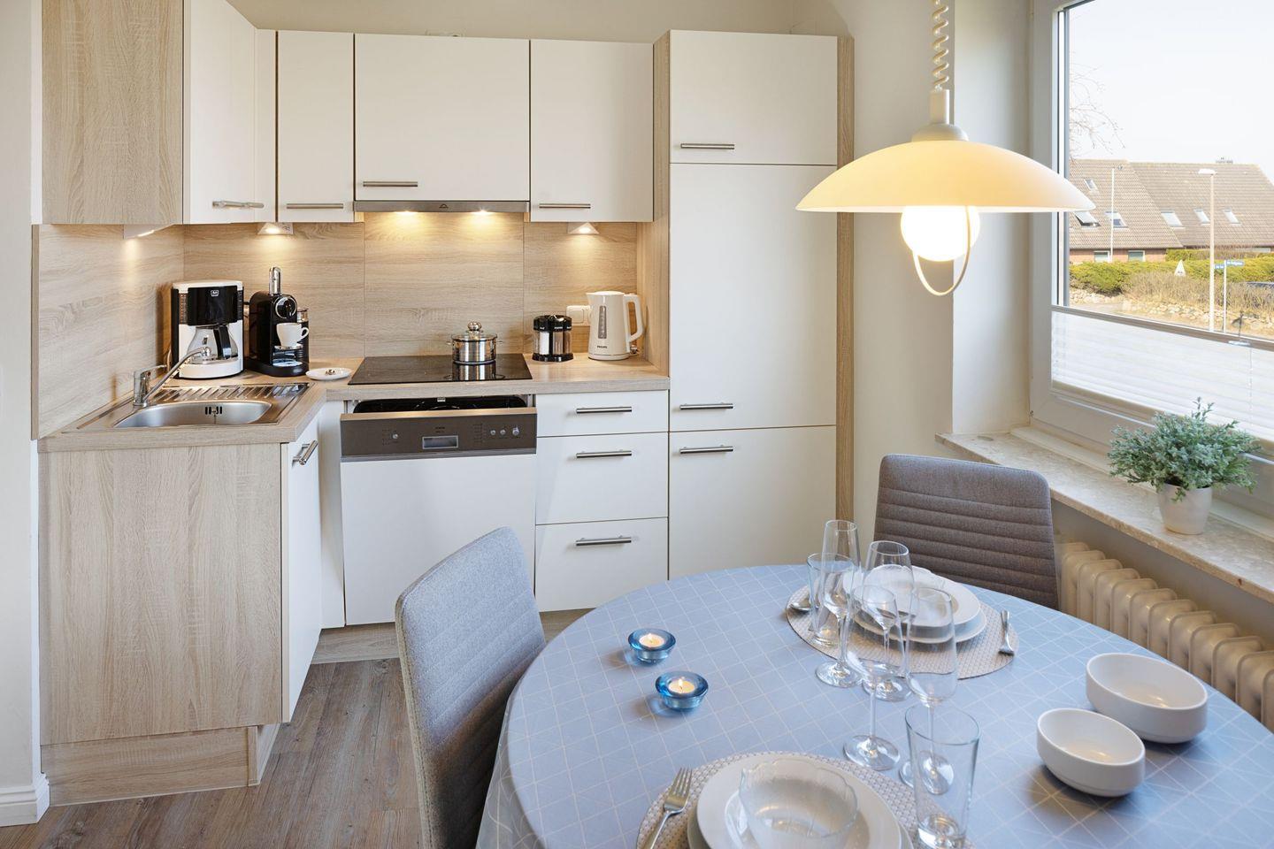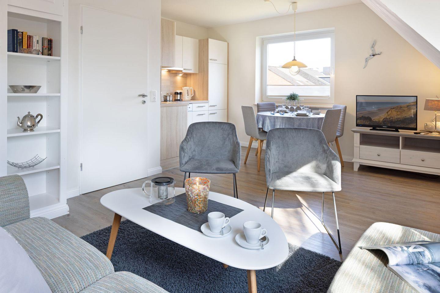 Die modern eingerichtete Ferienwohnung hat ein Wohnzimmer mit offener Küche und Essplatz und ein separates Schlafzimmer mit Doppelbett.