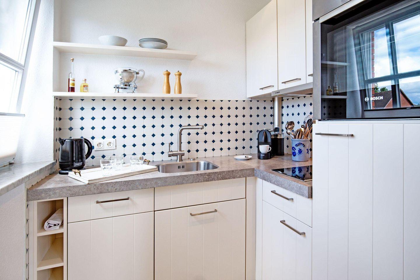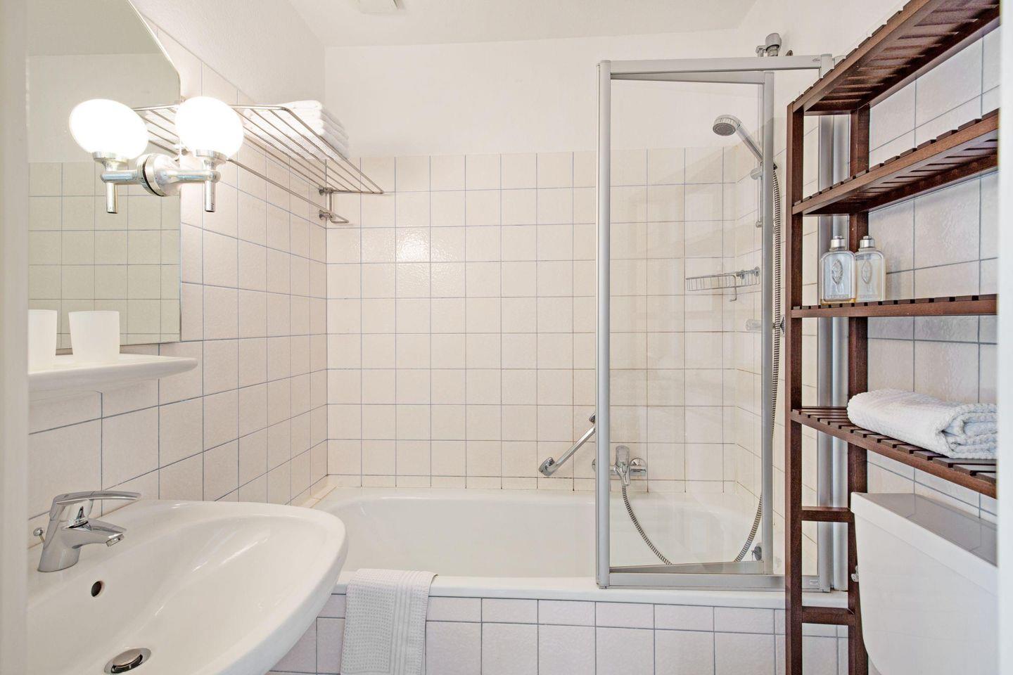 Die Ferienwohnung verfügt über ein komfortables Schlafzimmer mit hochwertiger Bettwäsche und ein stilvolles Badezimmer mit einer modernen Dusche und einer Badewanne für entspannende Stunden nach einem aktiven Tag. Der offene Wohnbereich ist hell und einladend gestaltet – ausgestattet mit einem bequemen Sofa, (das zusätzlich als Schlafsofa dient), einem Essbereich und einem gemütlichen Sessel, der zum Verweilen einlädt. Ein TV sorgt für Unterhaltung, während die praktische Küchenzeile alles bietet, was Sie für die Zubereitung köstlicher Mahlzeiten benötigen. Hier finden Sie unter anderem einen Backofen, eine Spülmaschine, eine Nespresso-Espressomaschine und viele weitere Küchenutensilien, die keine Wünsche offenlassen.