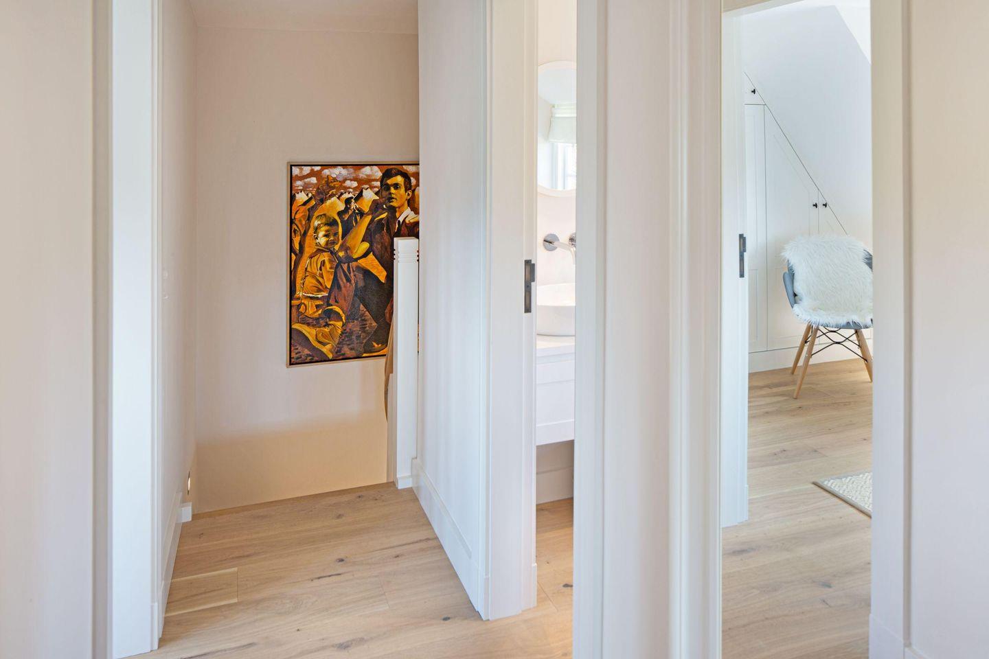 Zwei Schlafzimmer mit Doppelbetten befinden sich im Obergeschoss, ein weiteres Schlafzimmer mit Doppelbett und eigenem Duschbad (ohne WC) im Untergeschoss. Für entspannte Stunden sorgen Kamin, Sauna sowie der schöne Garten mit möblierter Terrasse ein Rückzugsort zu jeder Jahreszeit.