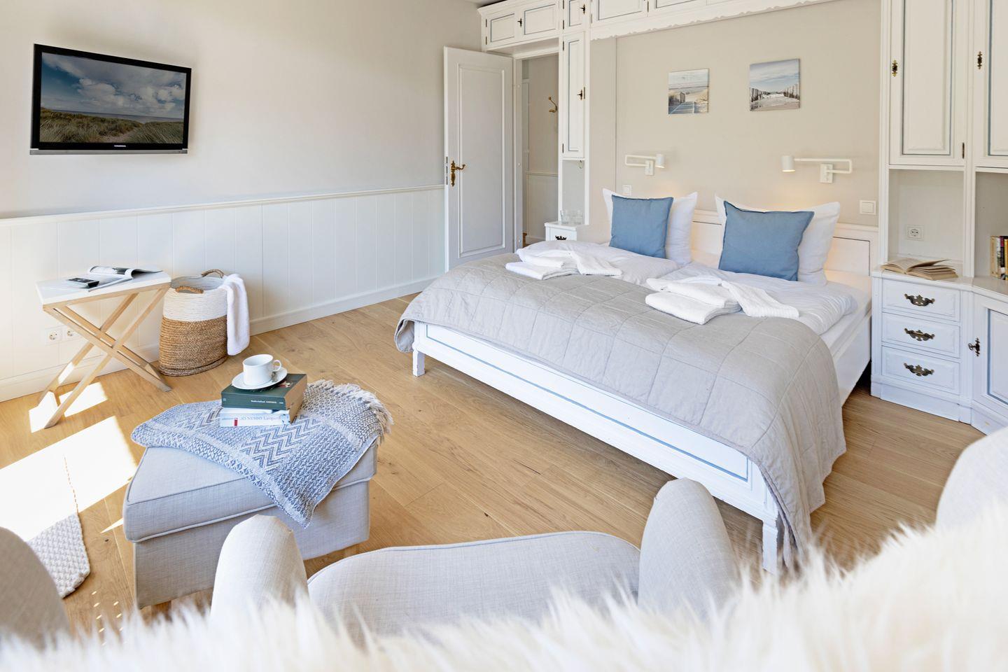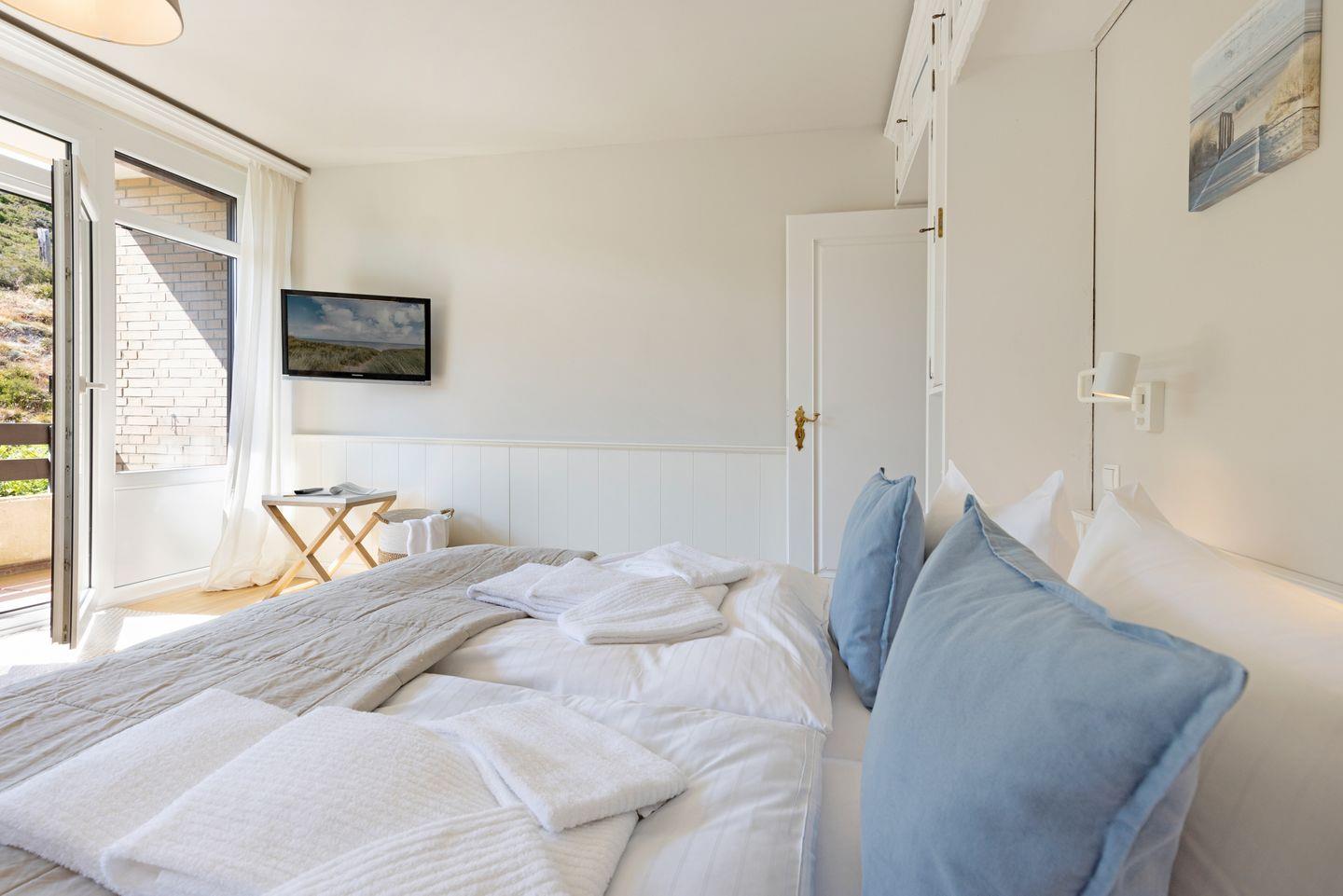 Willkommen in Ihrem Appartement "Heideblick" direkt am Naturschutzgebiet Königshafen. Die im Hochparterre liegende 60m² große Ferienwohnung für bis zu 4 Personen hat ein separates Schlafzimmer mit Doppelbett und ein im Wohnzimmer befindliches Doppel-Schrankbett. Vom Wohnzimmer kommen Sie auf den Balkon mit Blick auf die Dünen.