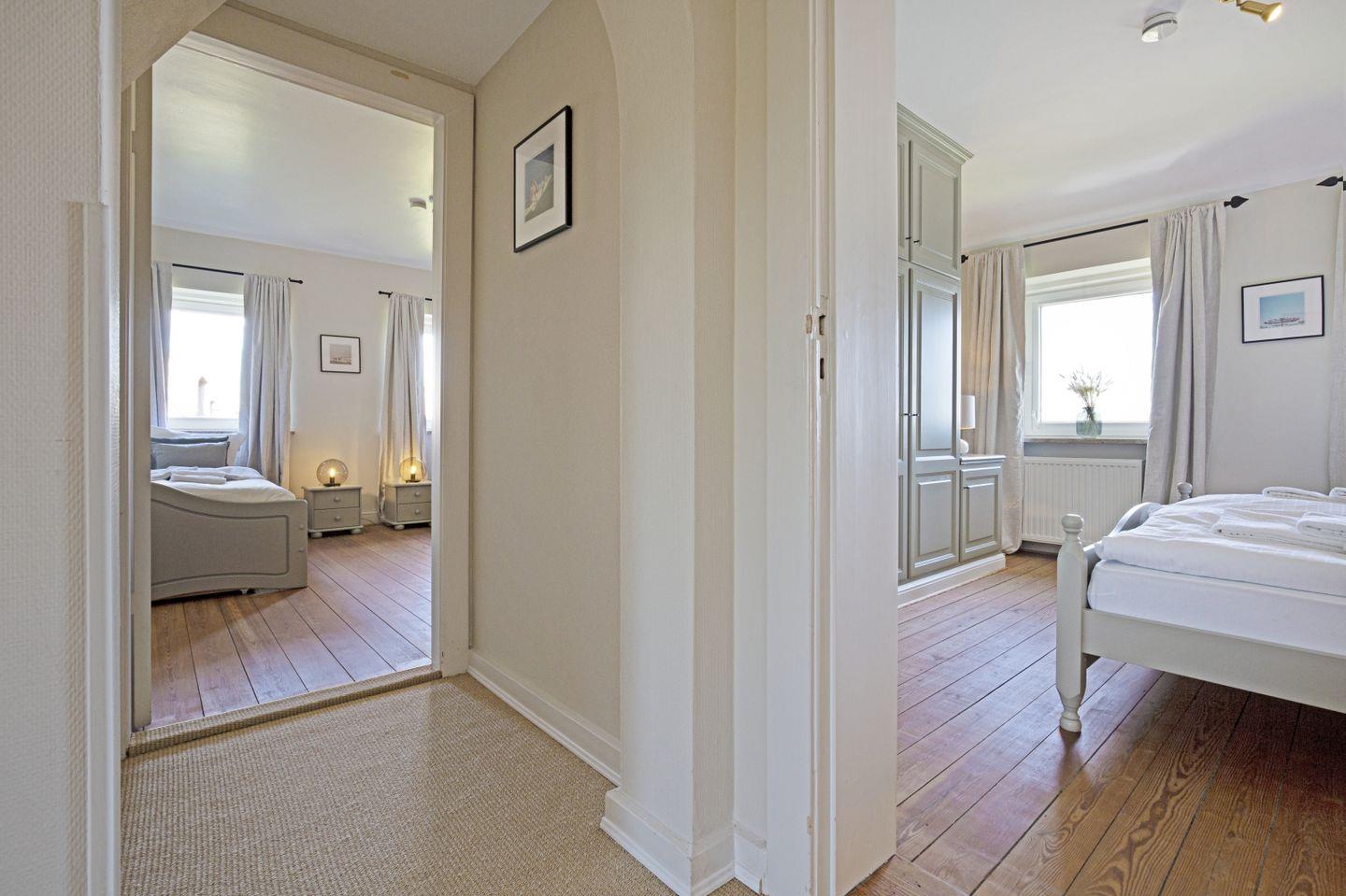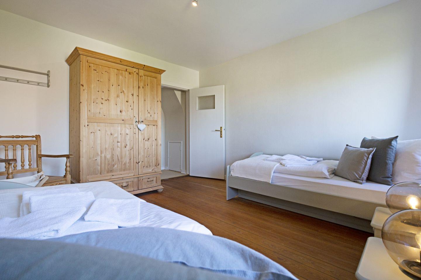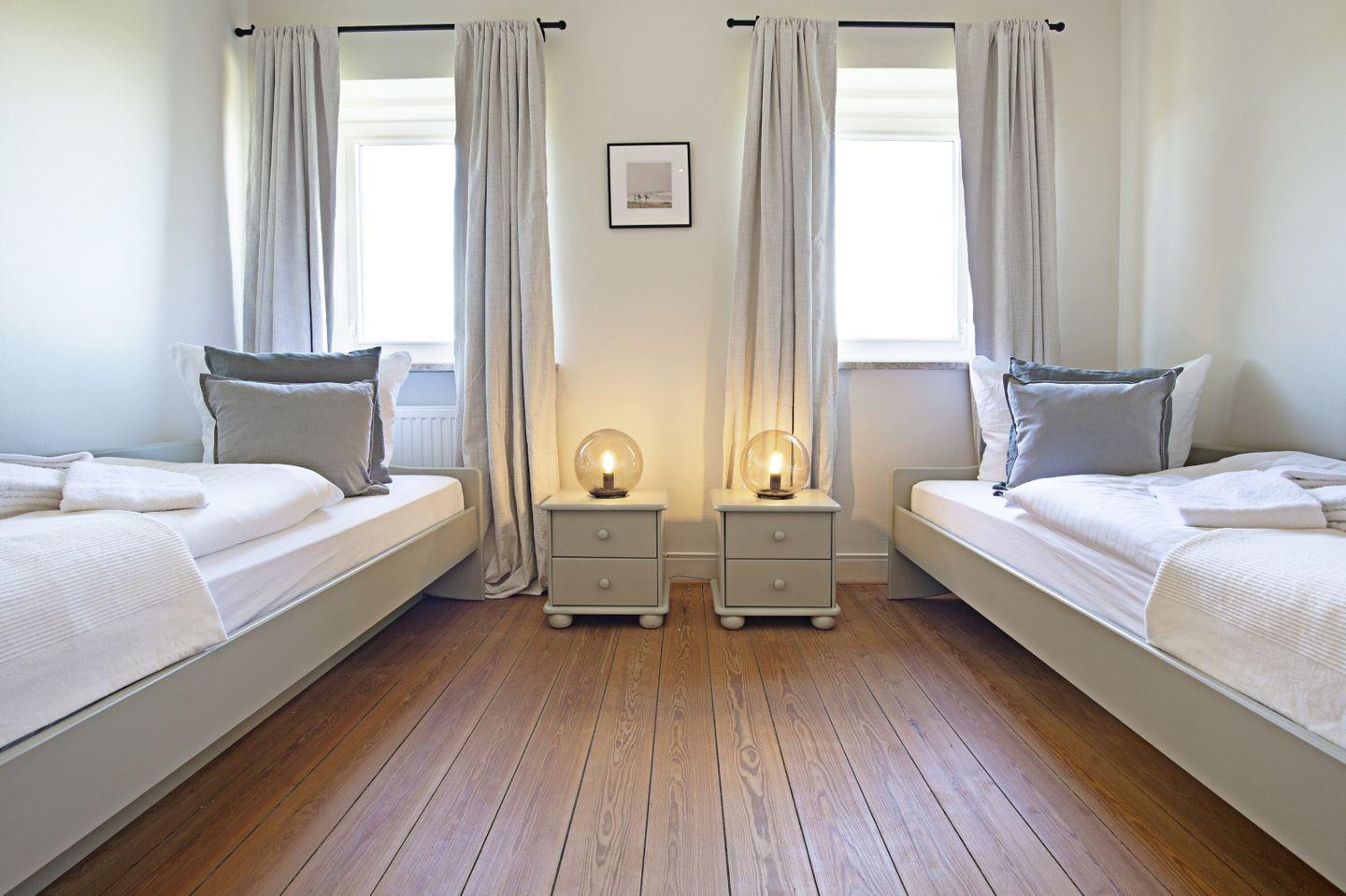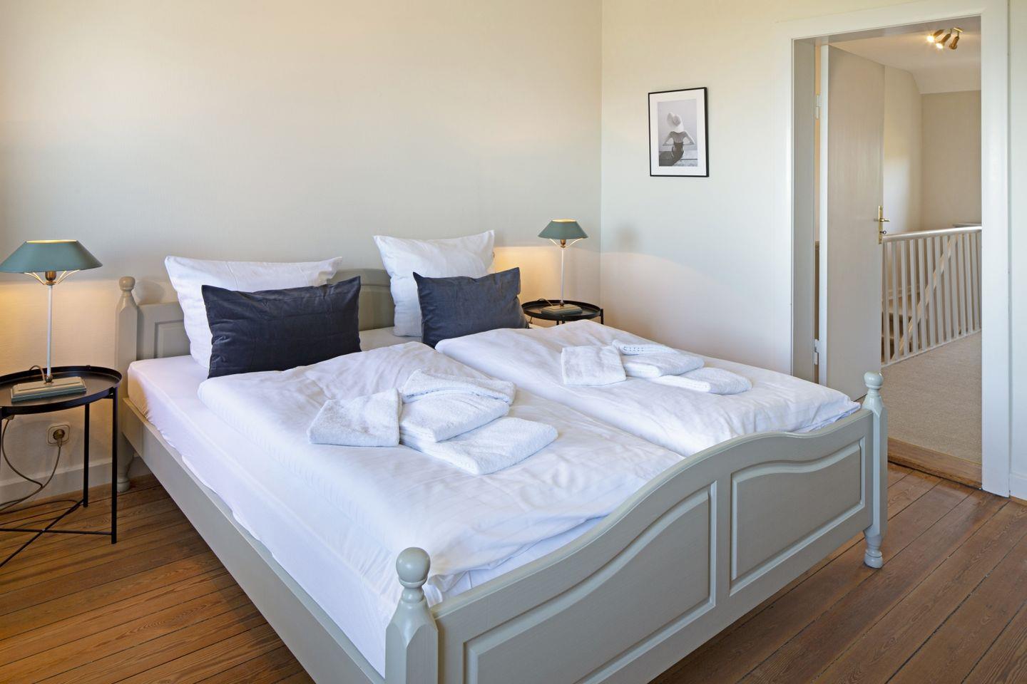 Das Feriendoppelhaus (160 m²) für bis zu 6 Personen verfügt über ein hell eingerichtetes Wohnzimmer, eine große geschlossene Küche, ein separates Schlafzimmer mit Doppelbett und zwei Schlafzimmer mit Einzelbetten. Alle Schlafräume befinden sich in der 1. Etage.