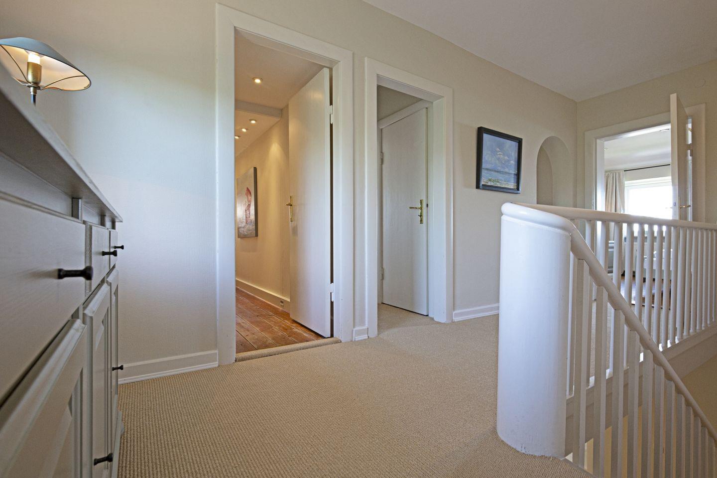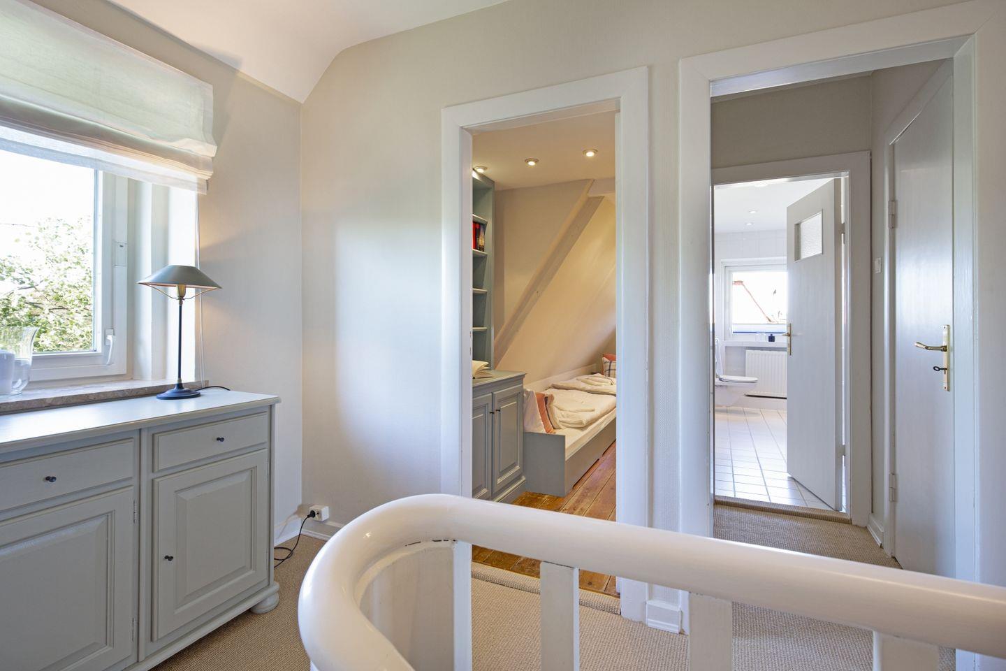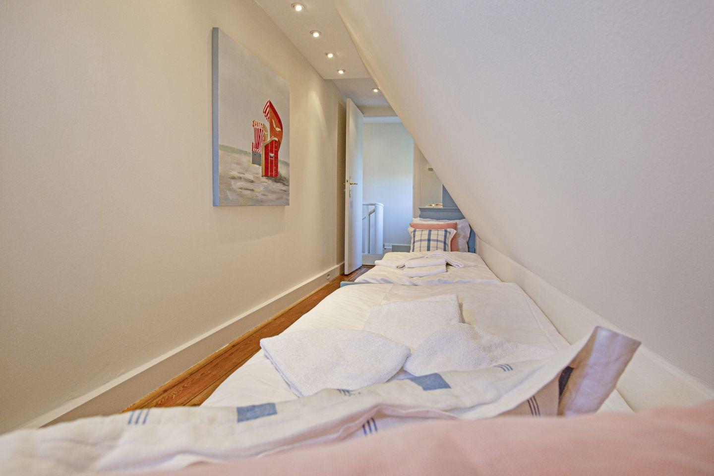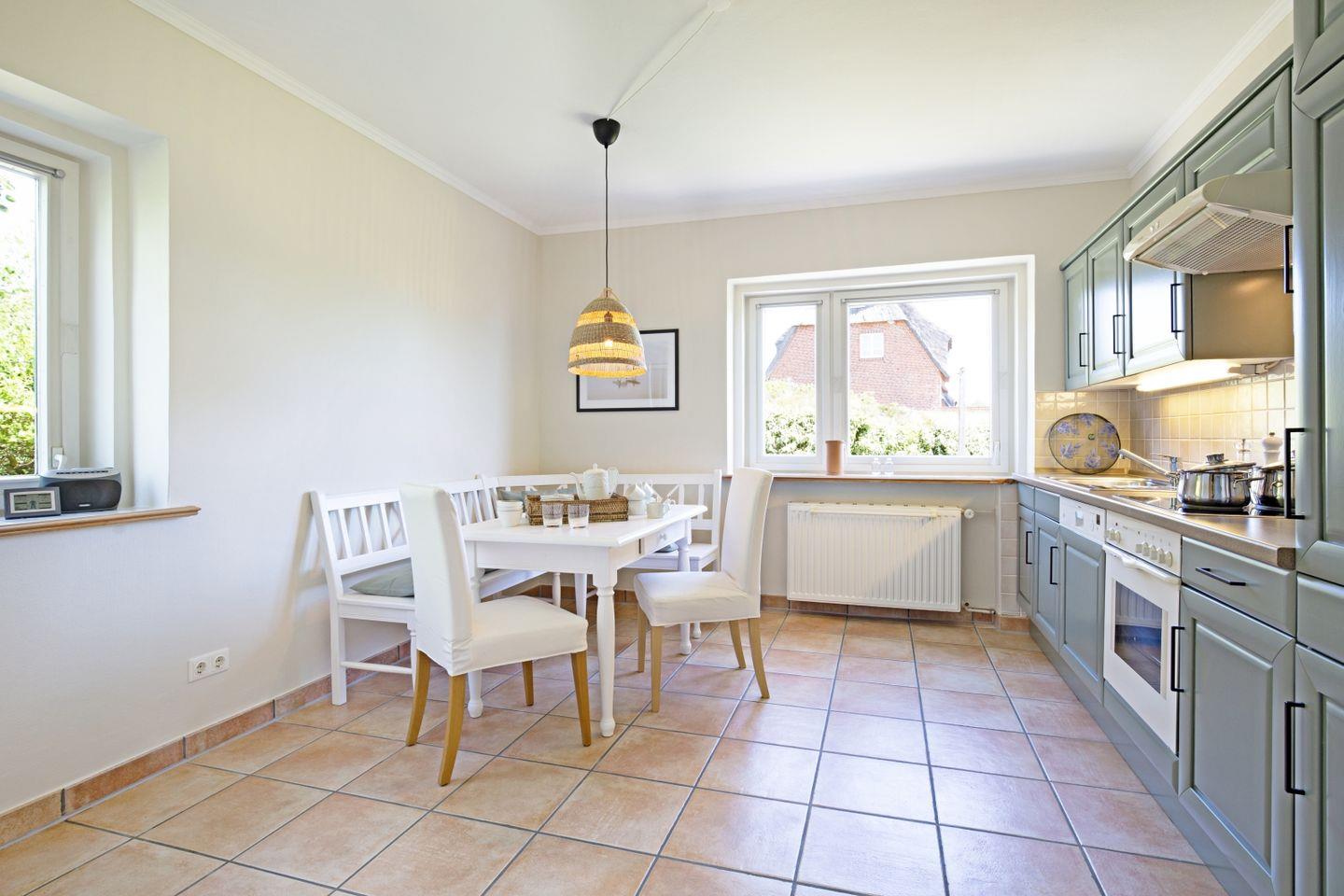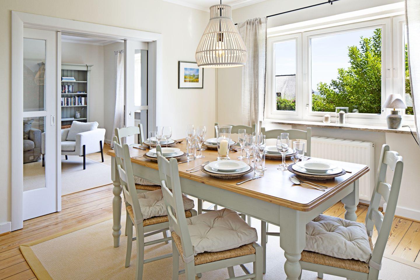 Das Feriendoppelhaus (160 m²) für bis zu 6 Personen verfügt über ein hell eingerichtetes Wohnzimmer, eine große geschlossene Küche, ein separates Schlafzimmer mit Doppelbett und zwei Schlafzimmer mit Einzelbetten. Alle Schlafräume befinden sich in der 1. Etage.
