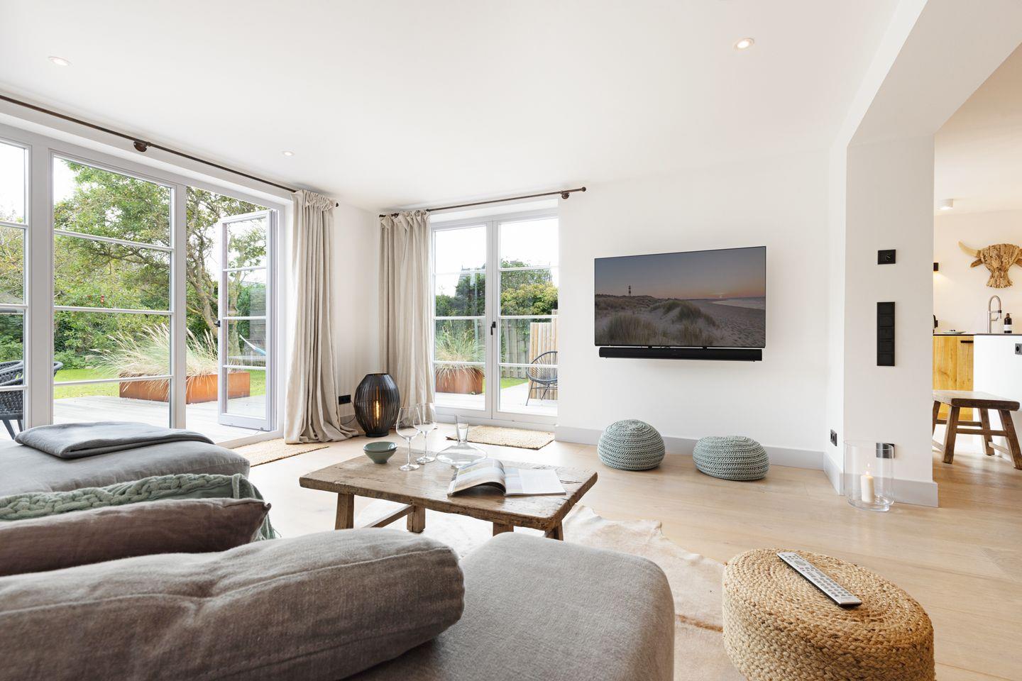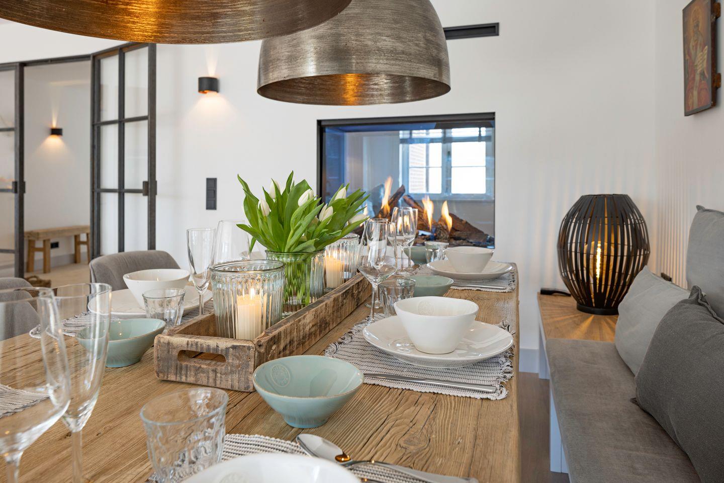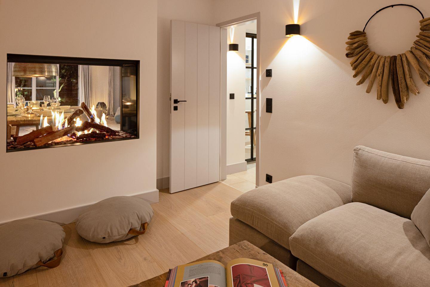 Im Sommer lädt die fast 60?m² große Terrasse mit exklusiven Gartenmöbeln oder der Garten mit Hängematte zum Entspannen ein. Ein separates Kaminzimmer dient als ruhiger Rückzugsort.