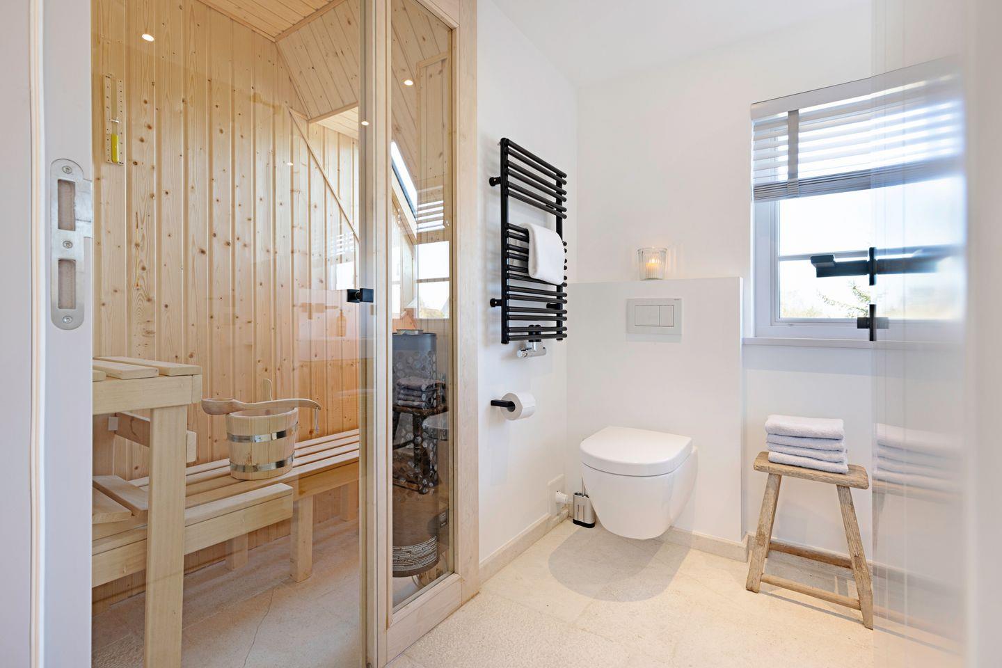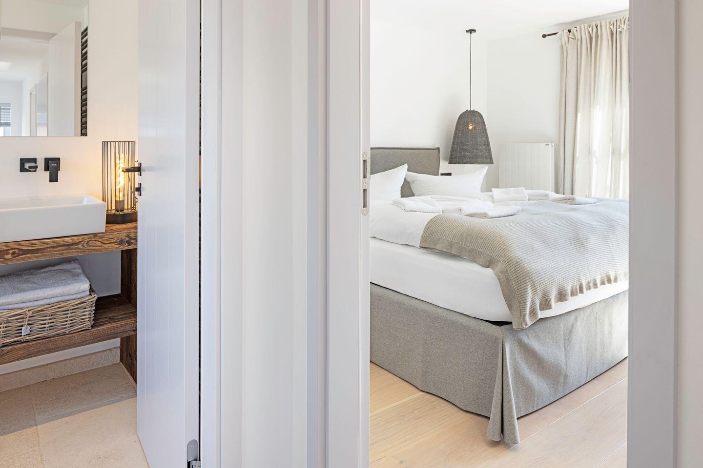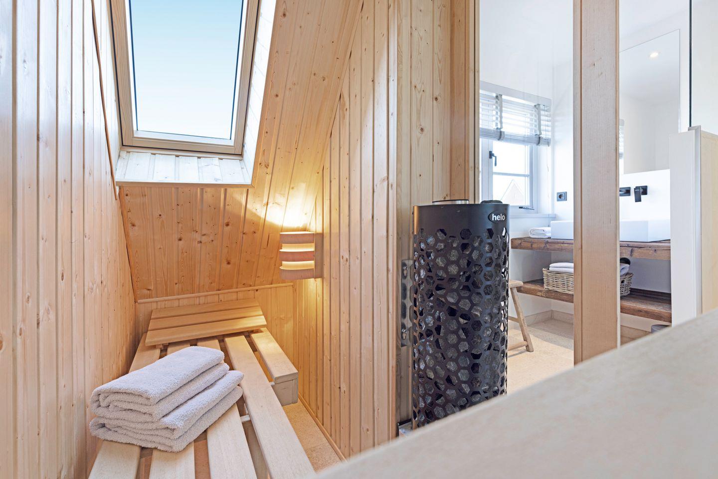 Im 1. Obergeschoss befinden sich zwei Schlafzimmer: das Hauptschlafzimmer mit Doppelbett und eigenem Balkon, ideal nach einem Saunagang in der kleinen Sauna für zwei Personen, sowie ein weiteres Schlafzimmer mit zwei Einzelbetten. Zwei Bäder stehen ebenfalls zur Verfügung.