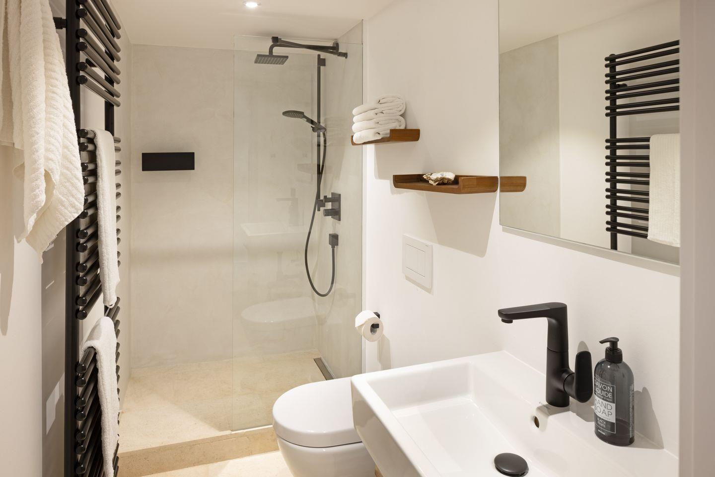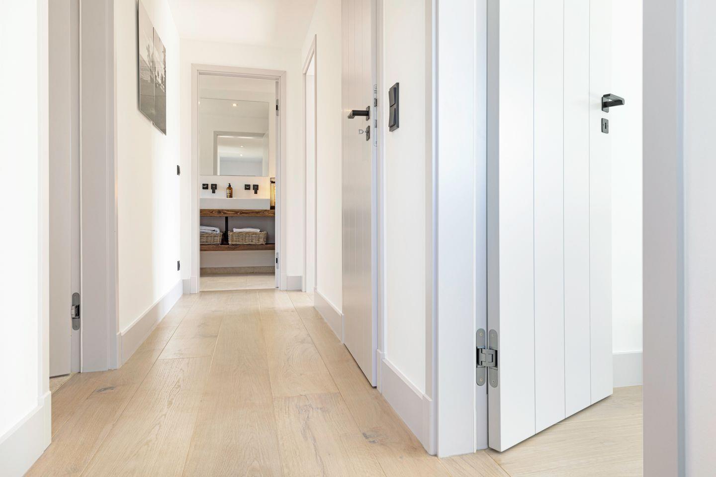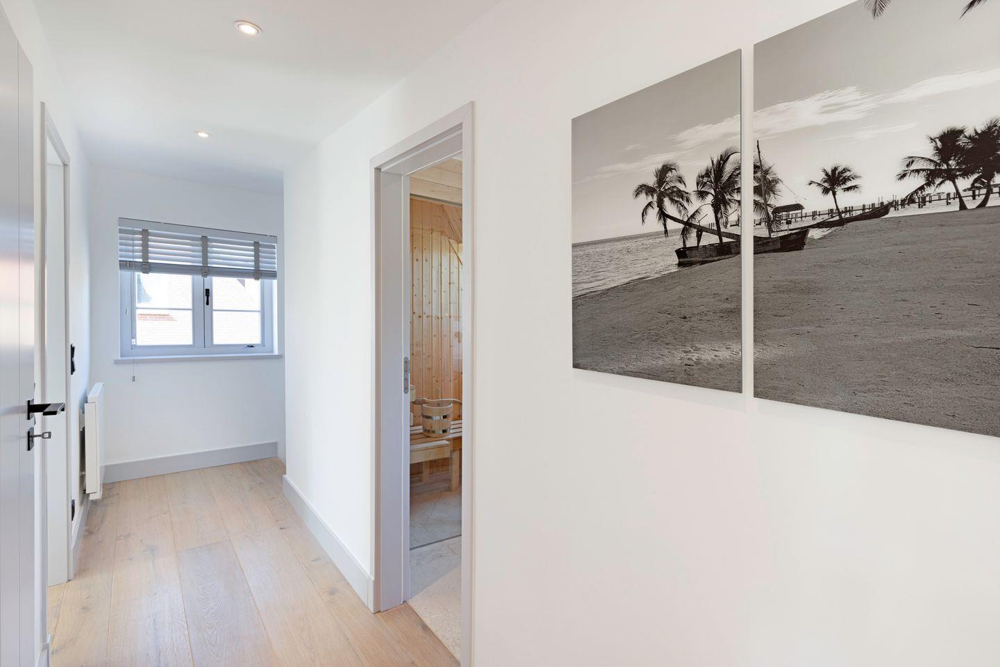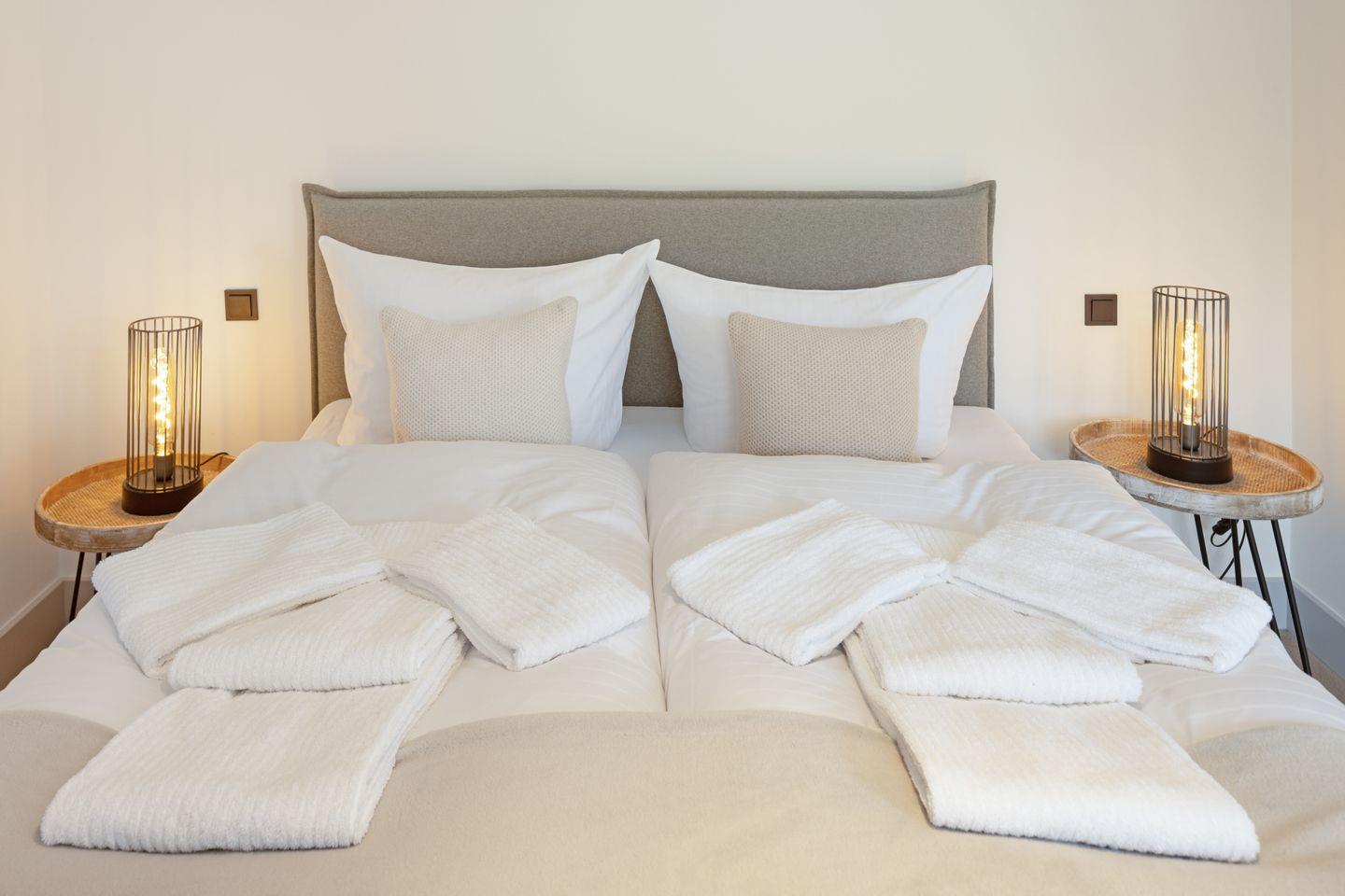Im 1. Obergeschoss befinden sich zwei Schlafzimmer: das Hauptschlafzimmer mit Doppelbett und eigenem Balkon, ideal nach einem Saunagang in der kleinen Sauna für zwei Personen, sowie ein weiteres Schlafzimmer mit zwei Einzelbetten. Zwei Bäder stehen ebenfalls zur Verfügung.