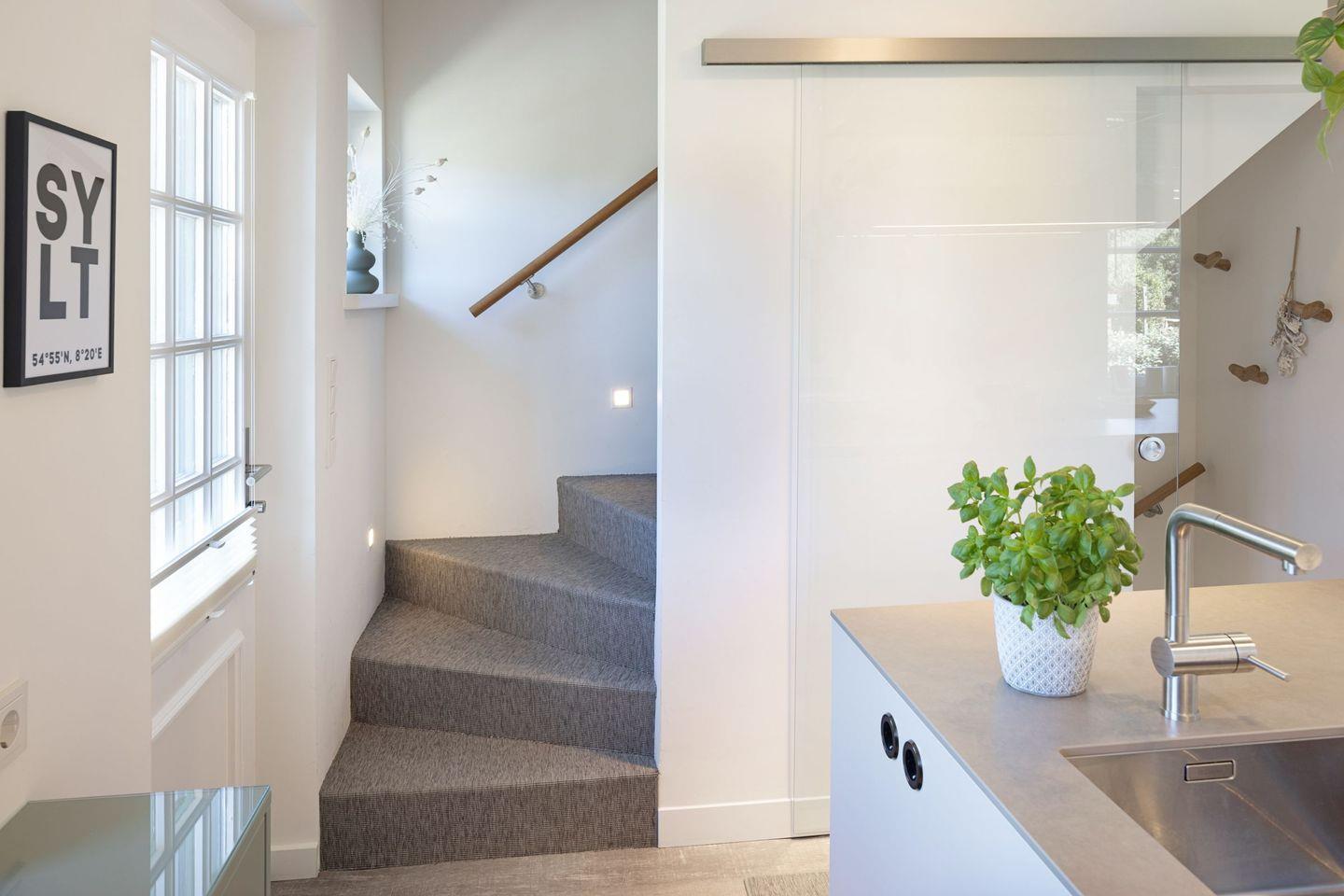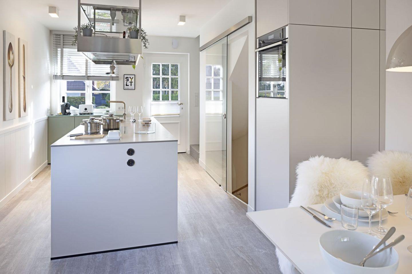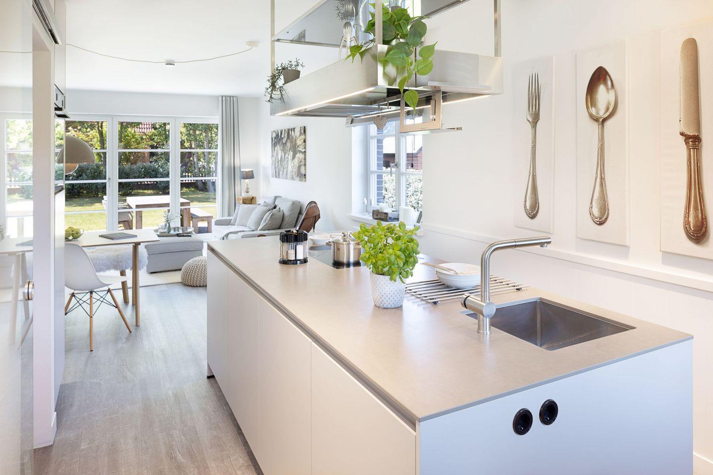 Ihre moderne Kücheninsel mit allen Möglichkeiten zum Kochen, lädt zum Verweilen ein. Ihr vierbeiniger Familienhund ist ein gern gesehener Gast.