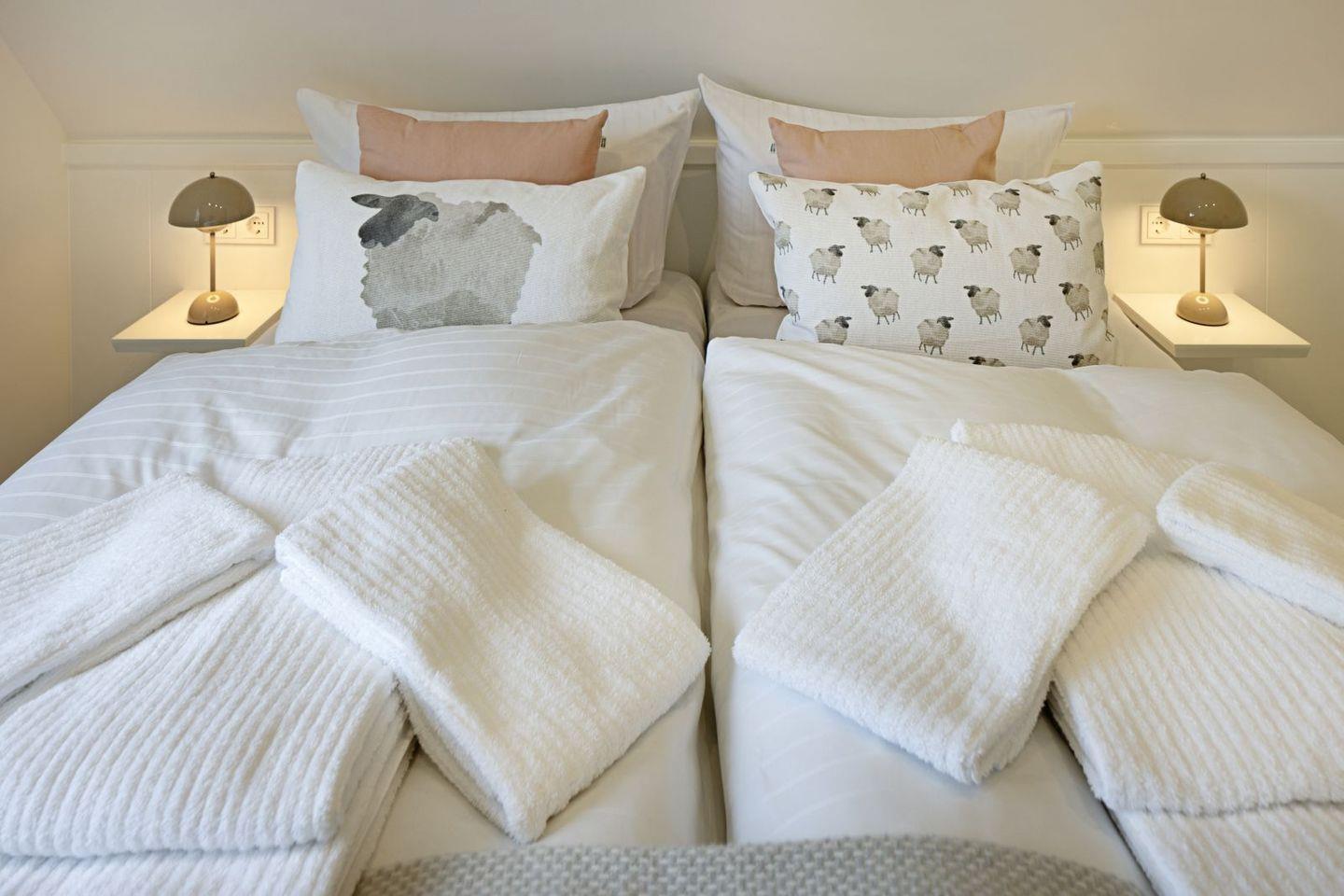 Sie können sich auf zwei Schlafzimmer ( im 1. Stock ) mit jeweils einem Doppelbett aufteilen.