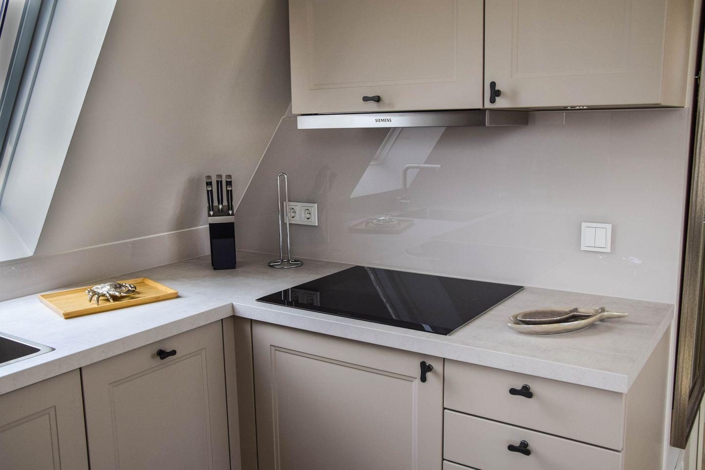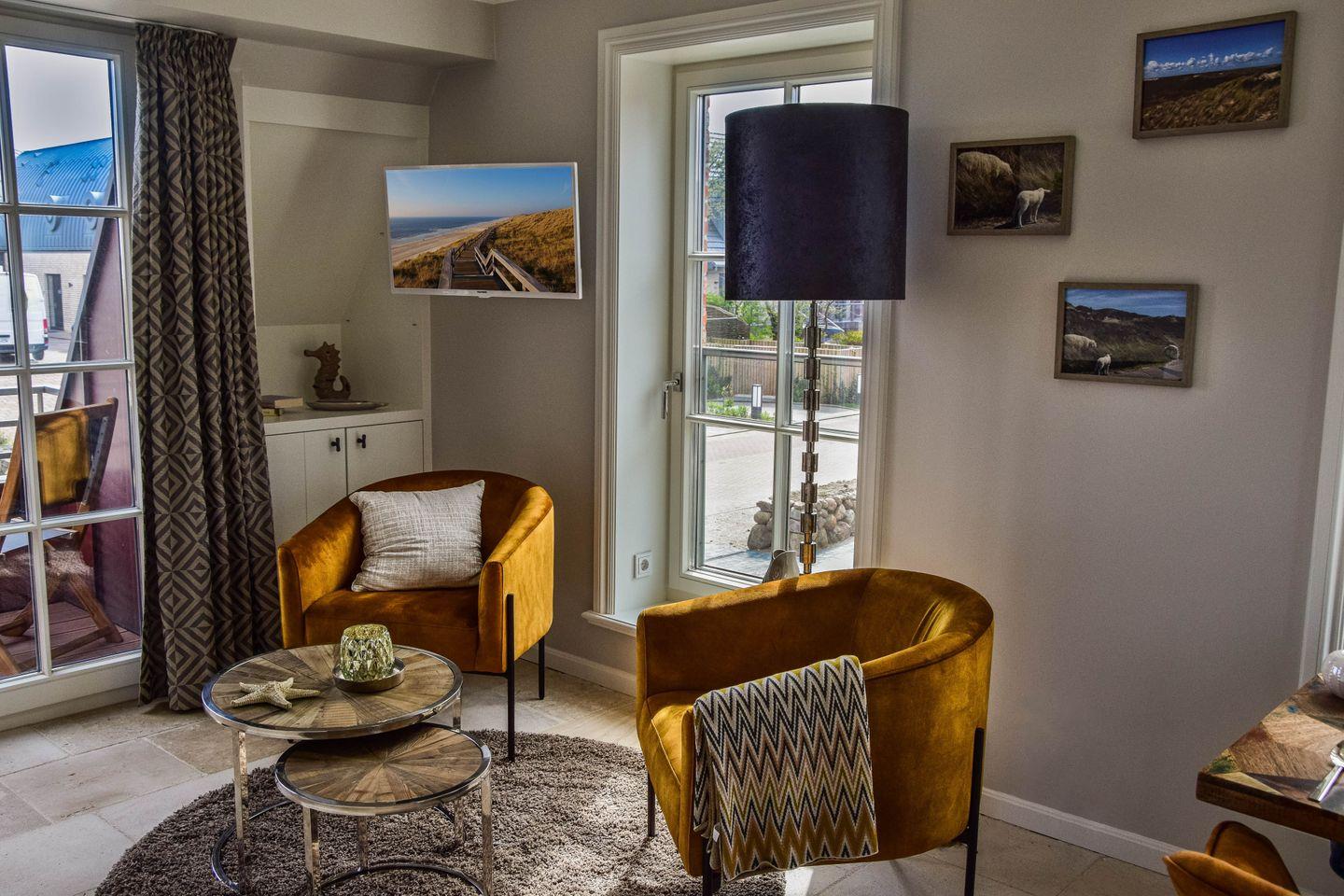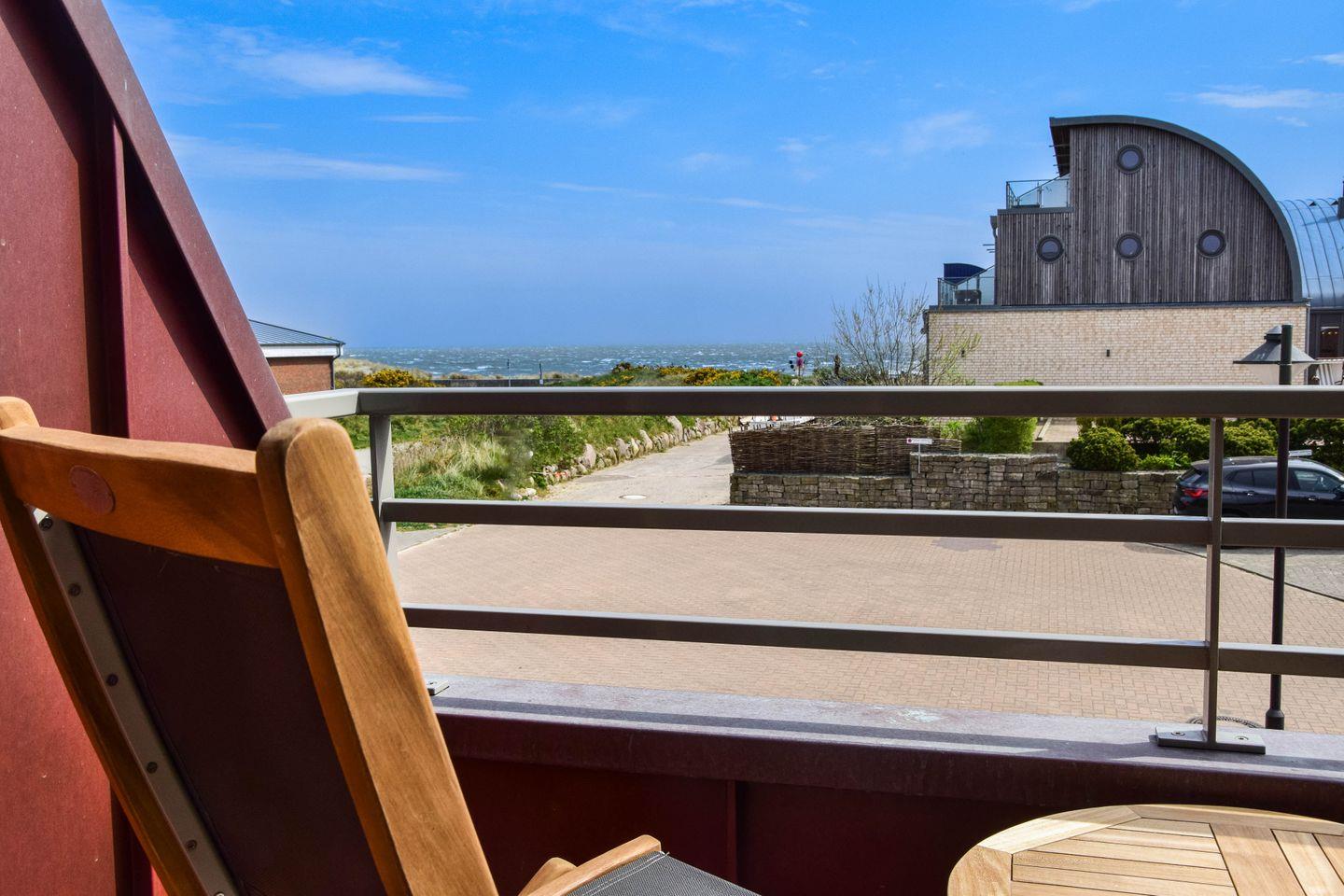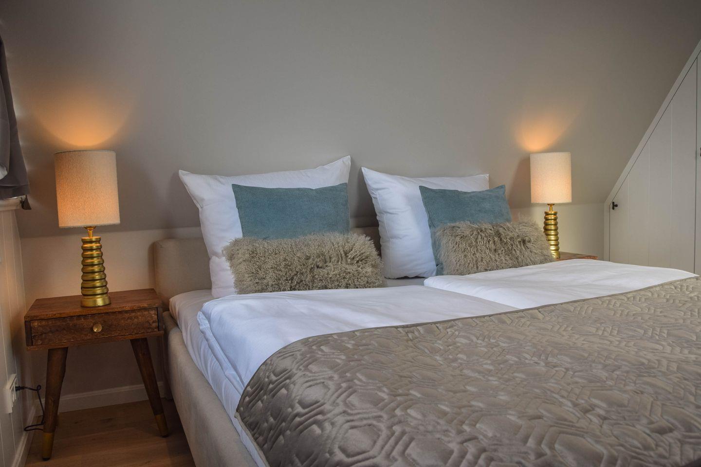 Ganz ungestört auf zwei Etagen im Dachgeschoss gelegen, empfängt Sie das charmante Maisonette-Apartment mit lässiger Eleganz. Limestone-Böden und Eichenholzdielen schmeicheln Auge und Barfüßen, das Bad verwöhnt Sie mit Tageslicht und feinster Ausstattung, wertige Schreinereinbauten bieten Ihren liebsten Sachen viel Platz – und die exklusive Möblierung atmet Liebe zum Detail und Gespür für gelungenes Design. Noch fesselnder ist nur der Meerblick, mit dem Sie dieses Refugium reichlich verwöhnt. Ob von der geschützten Loggia, vom Wohnbereich mit der offenen Küche oder direkt vom kuschligen Bett durchs Dreiecksgiebelfenster unterm Spitzdach aus: Hier begleitet Sie die See mit ihrem Spiel von Licht und Wellen durch jeden wunderbaren Urlaubstag.