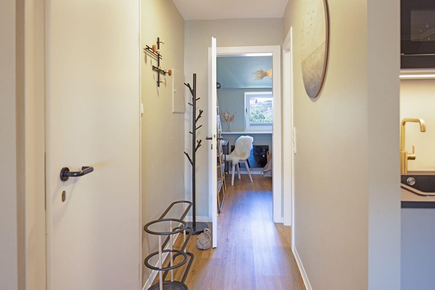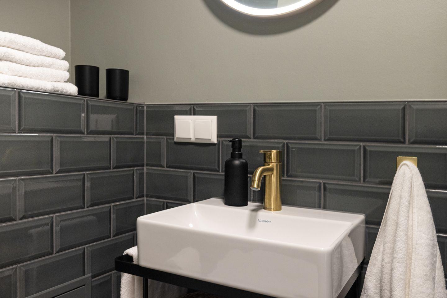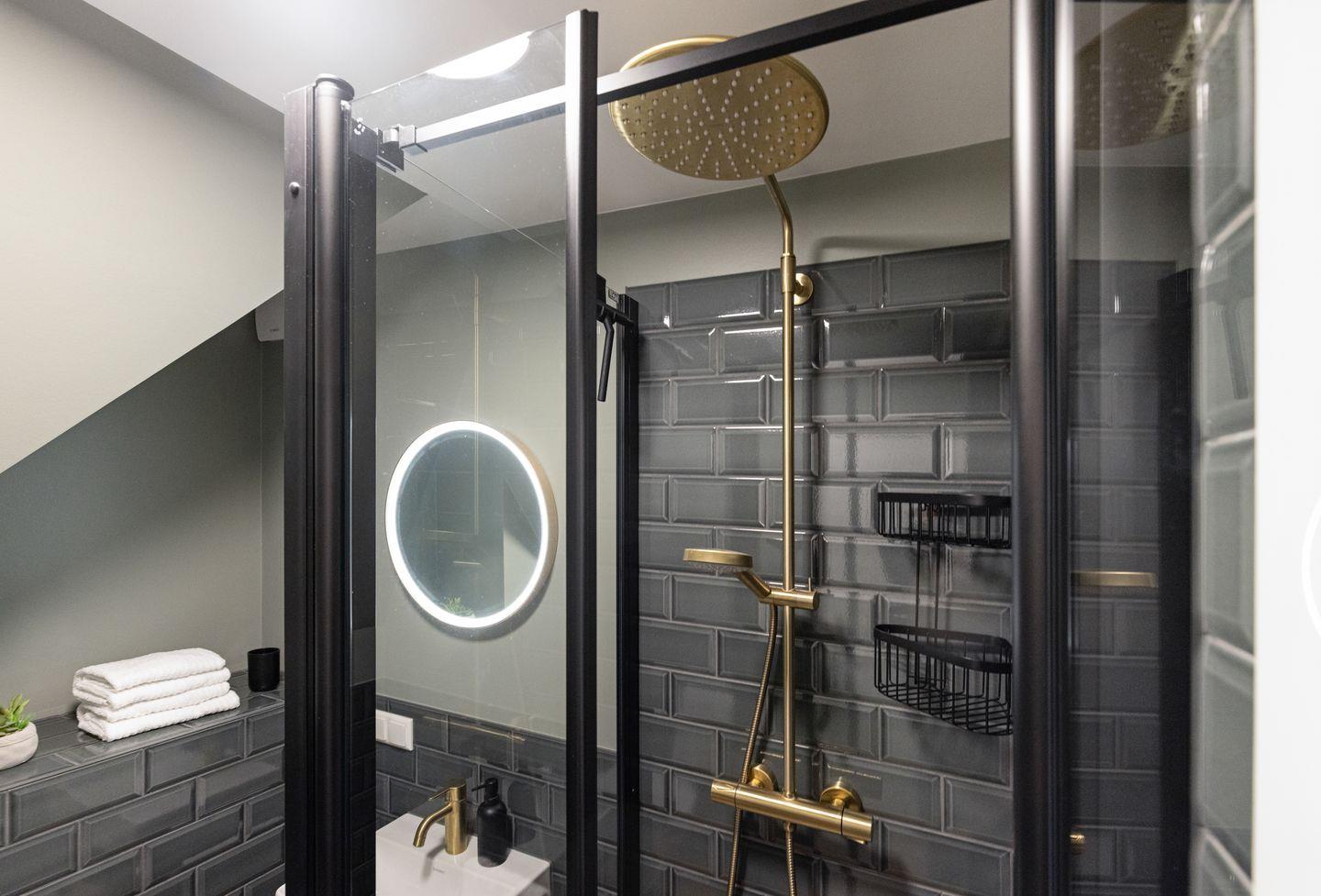Das separate Schlafzimmer verfügt über ein komfortables Doppelbett (180x200 cm), einen großen Schreibtisch und einen Spiegel alles für einen entspannten Aufenthalt. Das moderne Badezimmer ist mit einer Dusche und einem Fön ausgestattet.