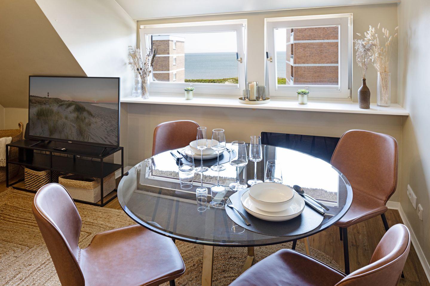 Diese 40 m² große Ferienwohnung Hideaway unter Reet eignet sich ideal für Paare, die Ruhe und Entspannung suchen. Das modern eingerichtete Wohnzimmer verbindet Wohn-, Ess- und Küchenbereich in einem offenen, gemütlichen Raum und bietet dank der großen Fenster einen direkten Blick auf das Meer. Die Küche ist komplett ausgestattet und lässt keine Wünsche offen.