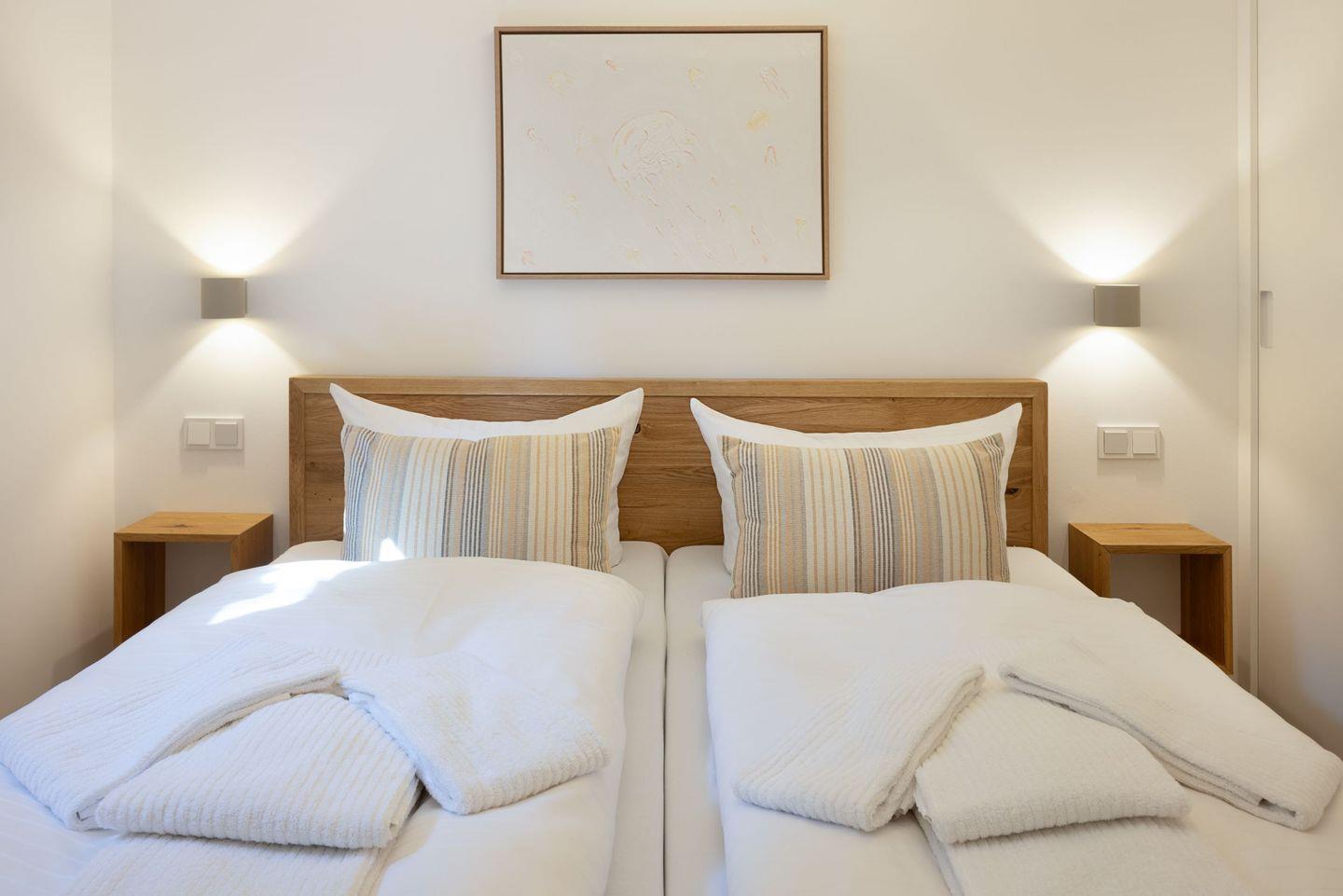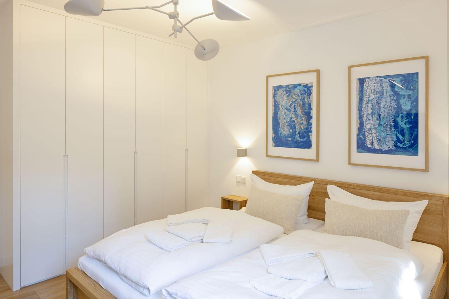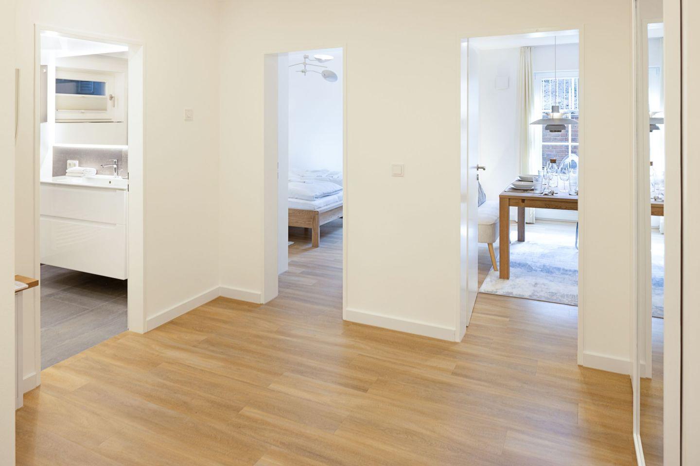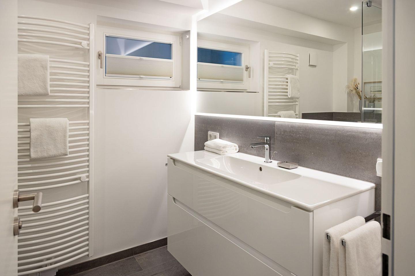 Ein Bad mit Regendusche für den Spa Moment, ein zusätzliches separates WC, schnelles Glasfaserinternet (500 Mbit/s) und Fußbodenheizung bieten höchsten Komfort. Die 15 m² große, windgeschützte Südterrasse ist Ihr Platz für sonnige Frühstücke und laue Sommerabende.