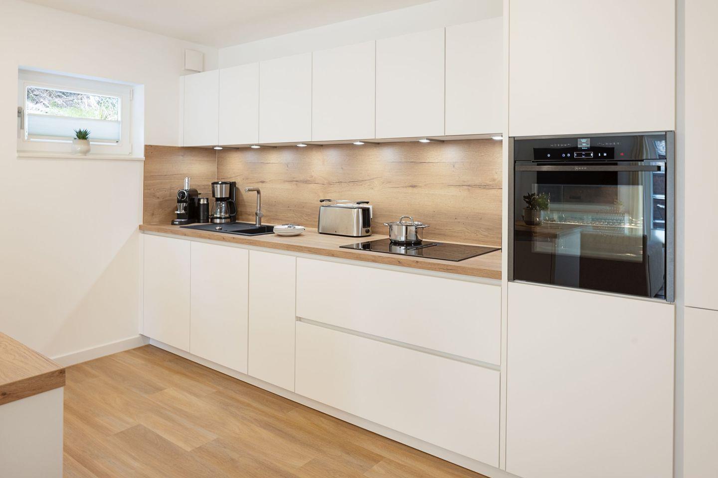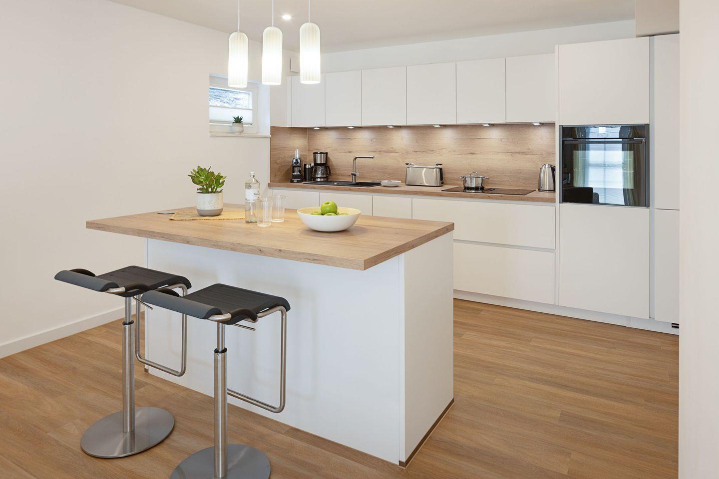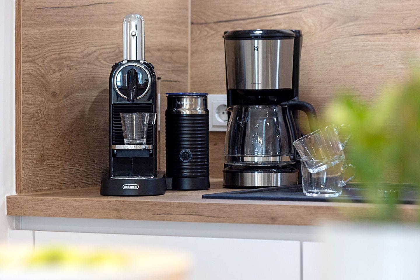 In der offenen Küche mit Barbereich finden Sie alles für kulinarische Genüsse – vom Induktionsherd mit integrierter Abluft über großen Kühlschrank mit Gefrierschrank, Geschirrspüler und Mikrowelle bis hin zu Kaffeemaschine, Gewürzen und komplettem Kochgeschirr.