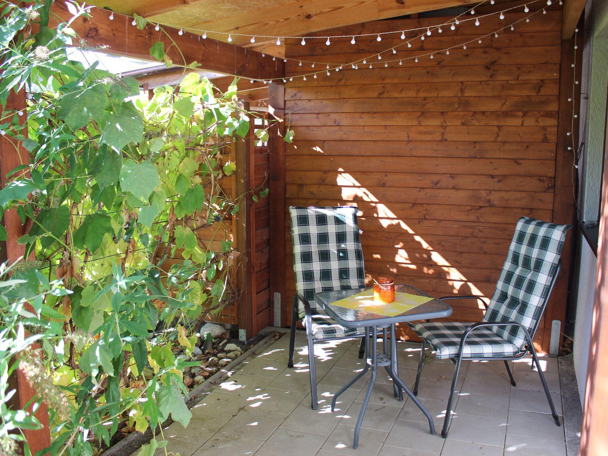 Richtung Garten, befindet sich eine kleine überdachte Terrasse. Bitte