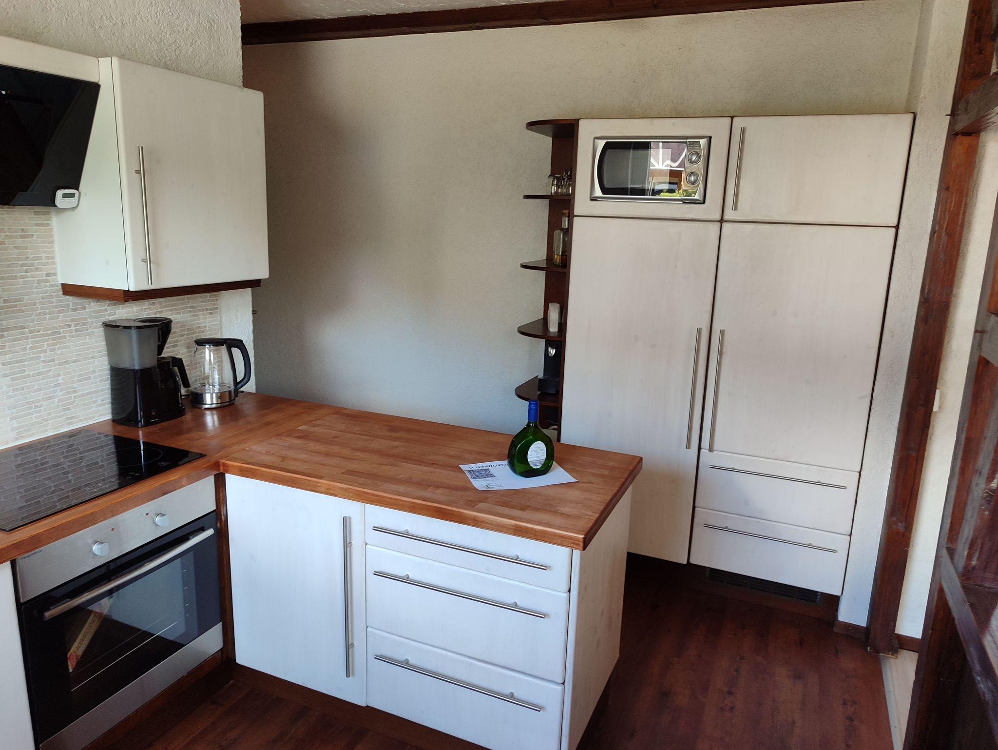 Die Küche (mit kleinem Balkon ) ist perfekt ausgestattet: Vom Backofen, Geschirrspüler, bis hin zum Wasserkocher, Toaster und Mikrowelle bietet die Küche Selbstversorgern jeden Komfort.