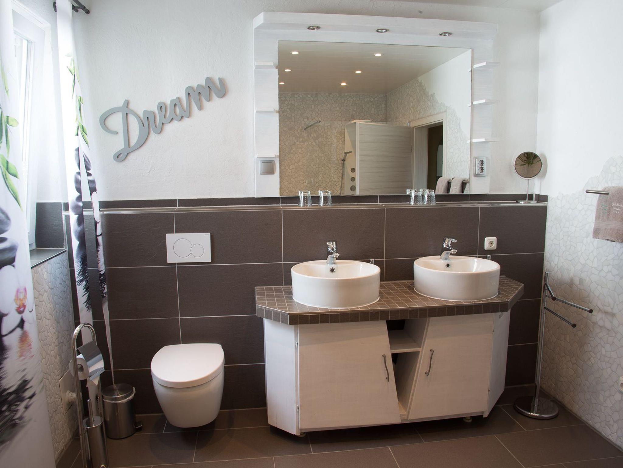 Im neuen Badzimmer finden Sie alles, was Sie zum frisch machen benötigen: Zwei Waschbecken, WC, freistehende Badewanne, Walk-in-Dusche und Handtücher stehen dort für Sie bereit. Gerade bei einer Belegung mit mehreren Personen ist mit Sicherheit das separate Gäste-WC ein kleiner Luxus.