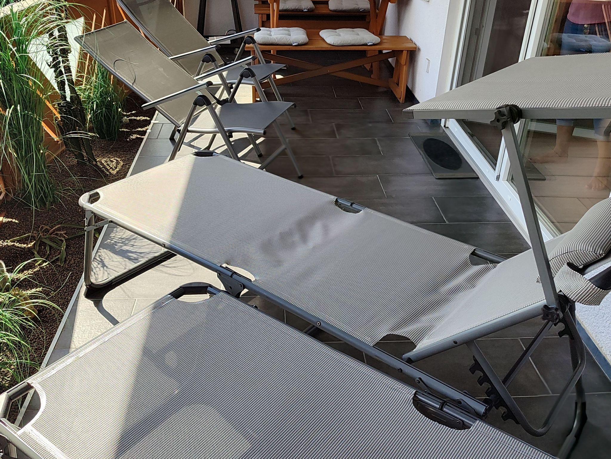 Gepflegte Böden, Vorhänge und Leuchten machen die Unterkunft sehr wohnlich. Eine Sofa-Garnitur, eine Essecke im toskanischen Stil und ein Flachbild-TV (mit FireStick) erwarten Sie im Wohnzimmer. Der Südbalkon ist möbliert mit rückengerechten XXL-Sonnenliegen, Relax-Sesseln, Sonneschirm, Essgarnitur und Grillmöglichkeit.