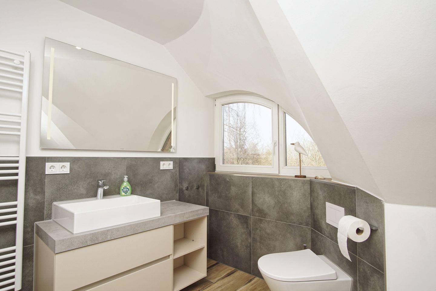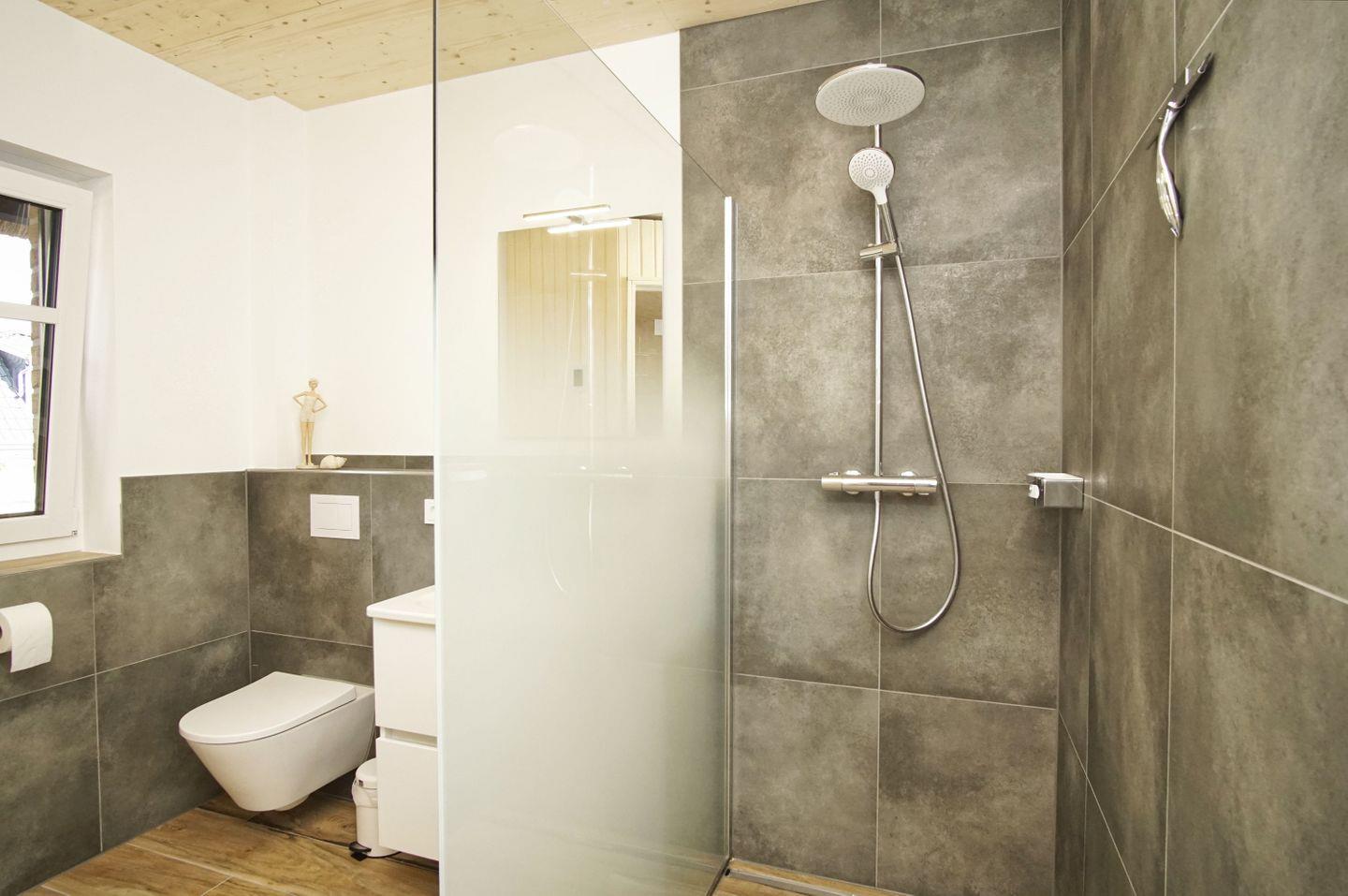 BAD // ein Badezimmer im EG mit bodengleicher Dusche, Sauna, Waschbecken, WC und Fenster, zweites Badezimmer im OG mit bodengleicher Dusche, Waschbecken, WC und Fenster ++