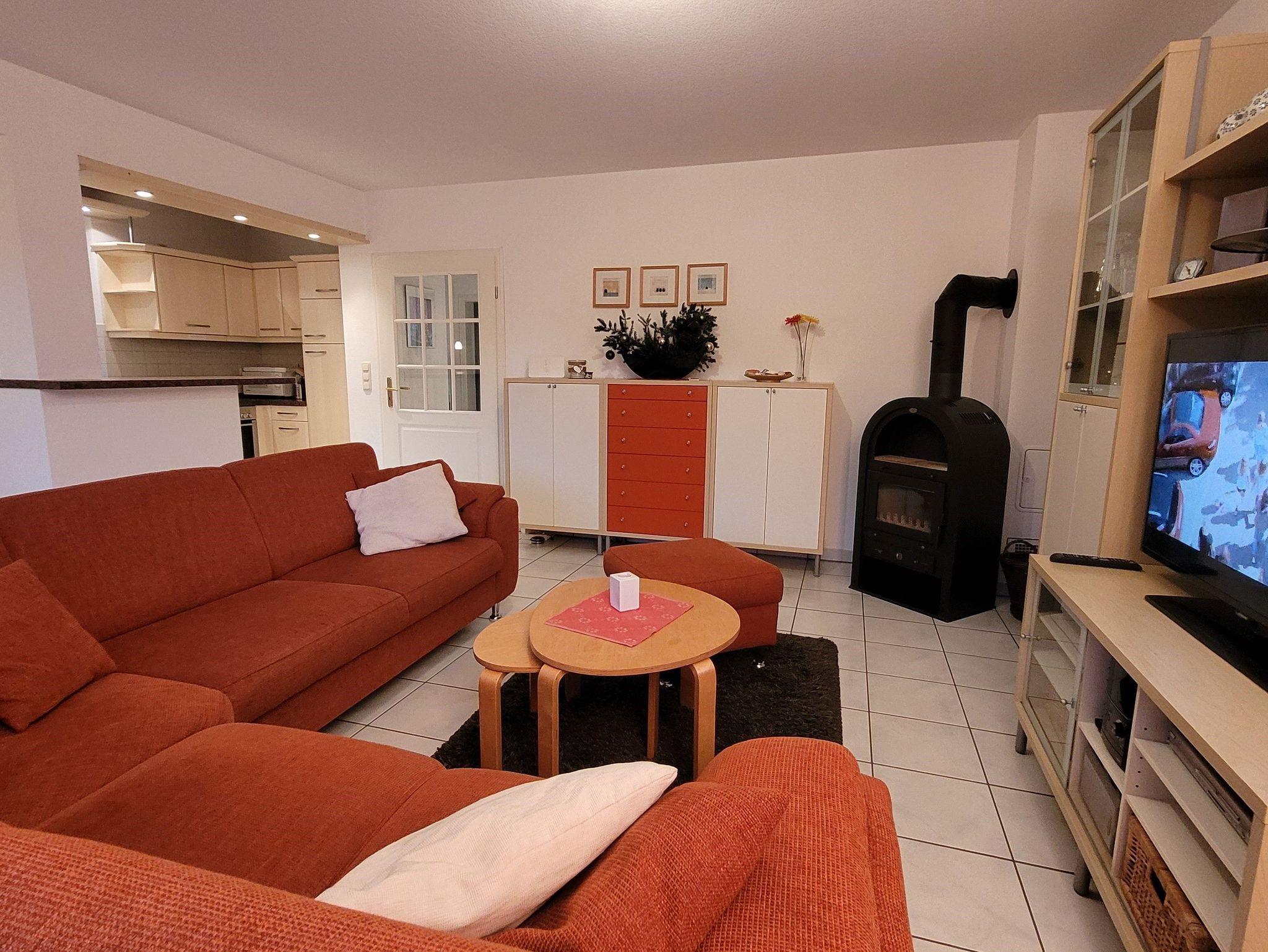 Die großzügige Ferienwohnung im Erdgeschoss mit gehobenem Ambiente betreten Sie über einen eigenen Hauseingang. Sie verfügt über ein großes Wohnzimmer mit gemütlicher Couchlandschaft und Kaminofen sowie einen hellen Essbereich mit integrierter Markeneinbauküche. An den mit hellen Villeroy&Boch-Fliesen ausgelegten sonnigen Wohnraum schließt sich eine große, nach Südwesten ausgerichtete überdachte Terrasse mit Gartenmöbeln an, auf der Sie entspannt die lauen Sommerabende genießen können. Die moderne Küche in hellem Ahorn besteht aus einem Cerankochfeld mit Backofen, Geschirrspüler, Mikrowelle, Kühl-Gefrierkombination, Kaffeemaschine, Wasserkocher, Toaster sowie reichlich Geschirr, Töpfen uvm..