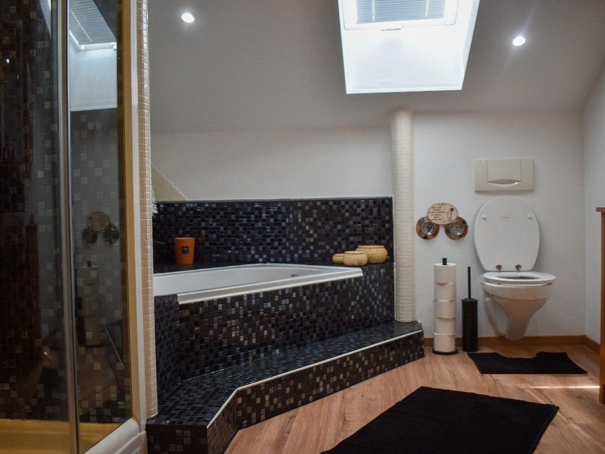 Das Badezimmer ist ausgestattet mit einer Eckbadewanne, Dusche und WC.
