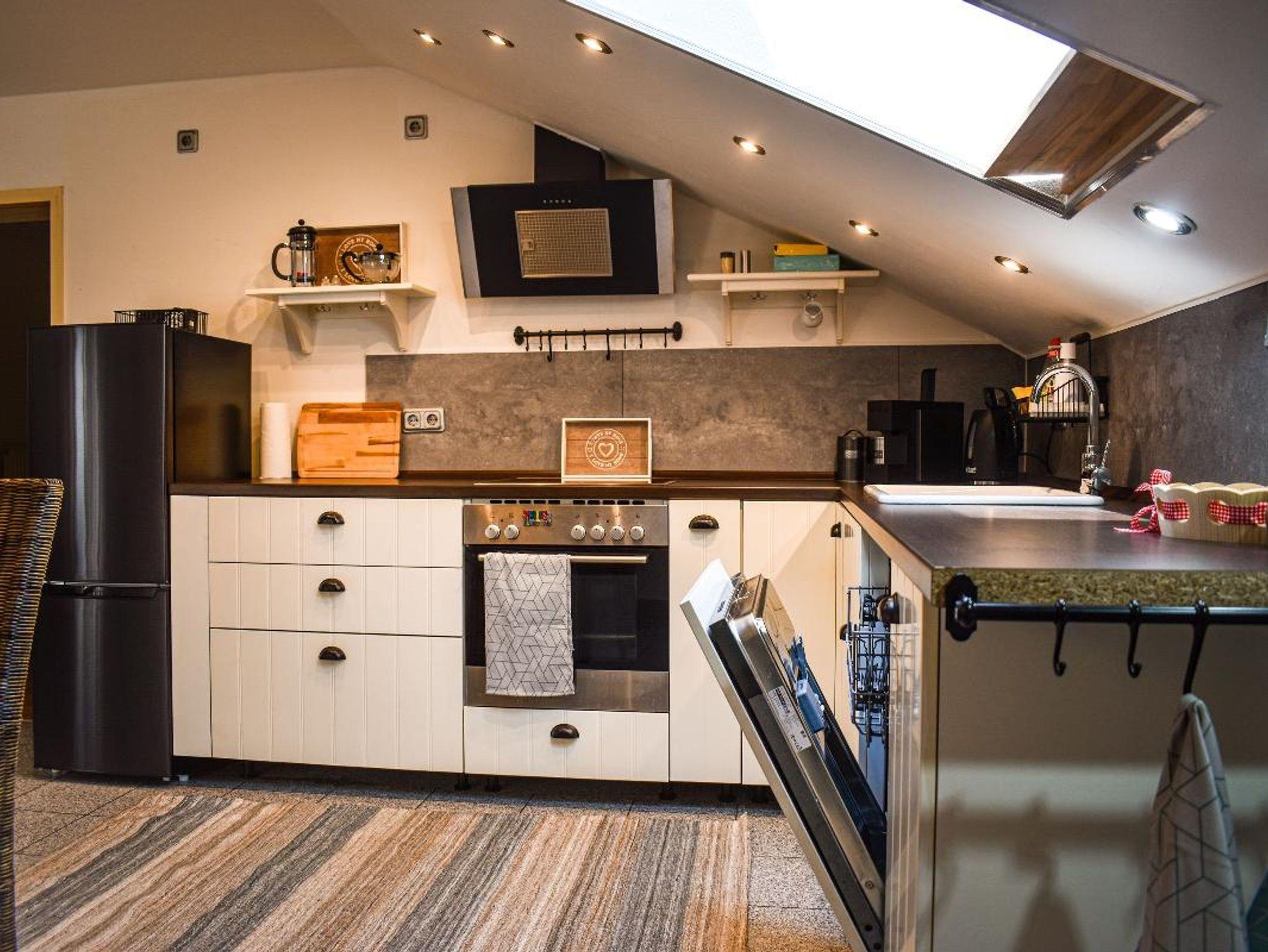 Die Küche mit Geschirrspüler, Cerankochfeld, Backofen und Kühlschrank mit Gefrierfach lässt keine Wünsche offen. Kaffeemaschine, Wasserkocher und ein Toaster sind ebenfalls vorhanden.