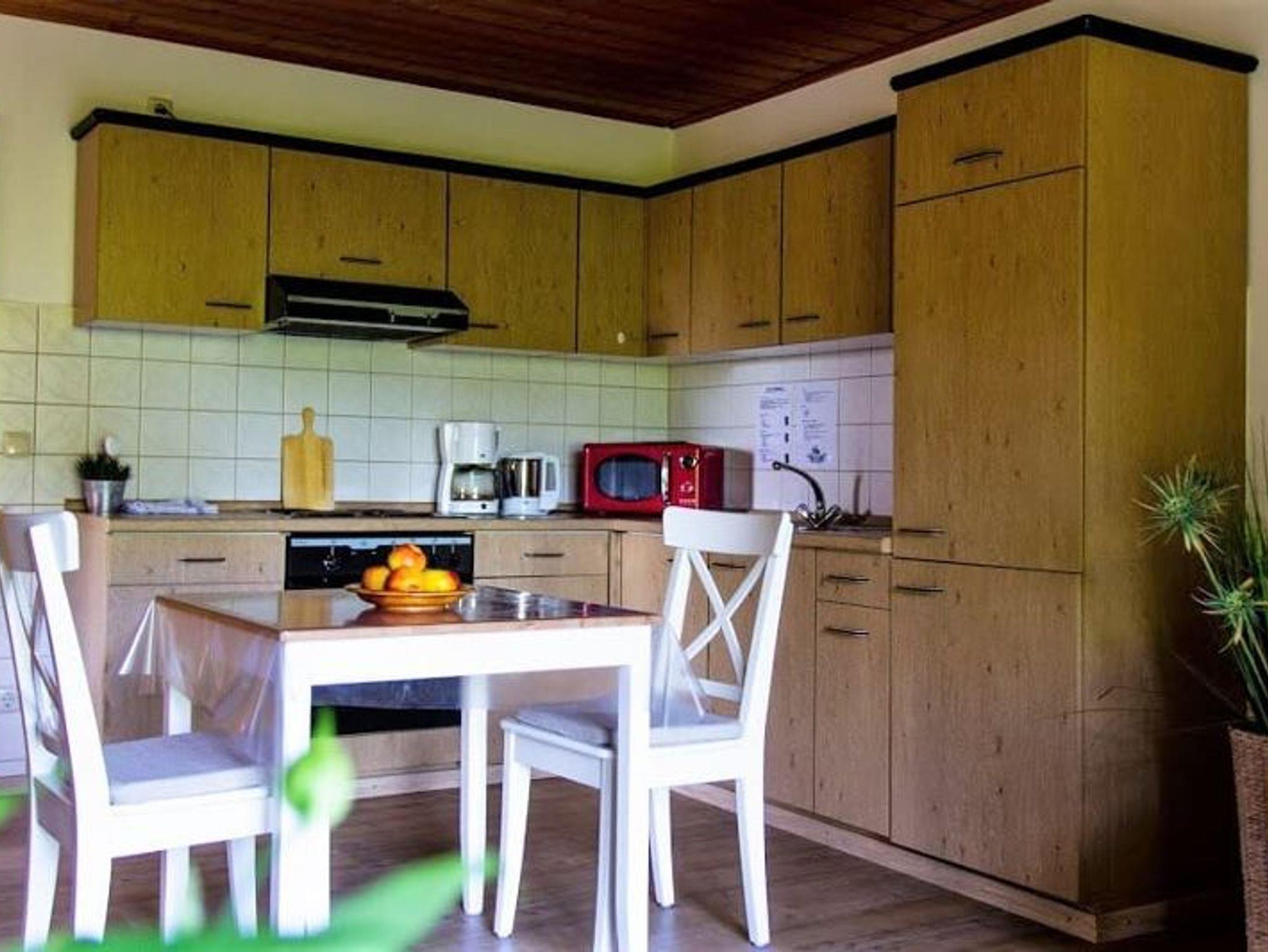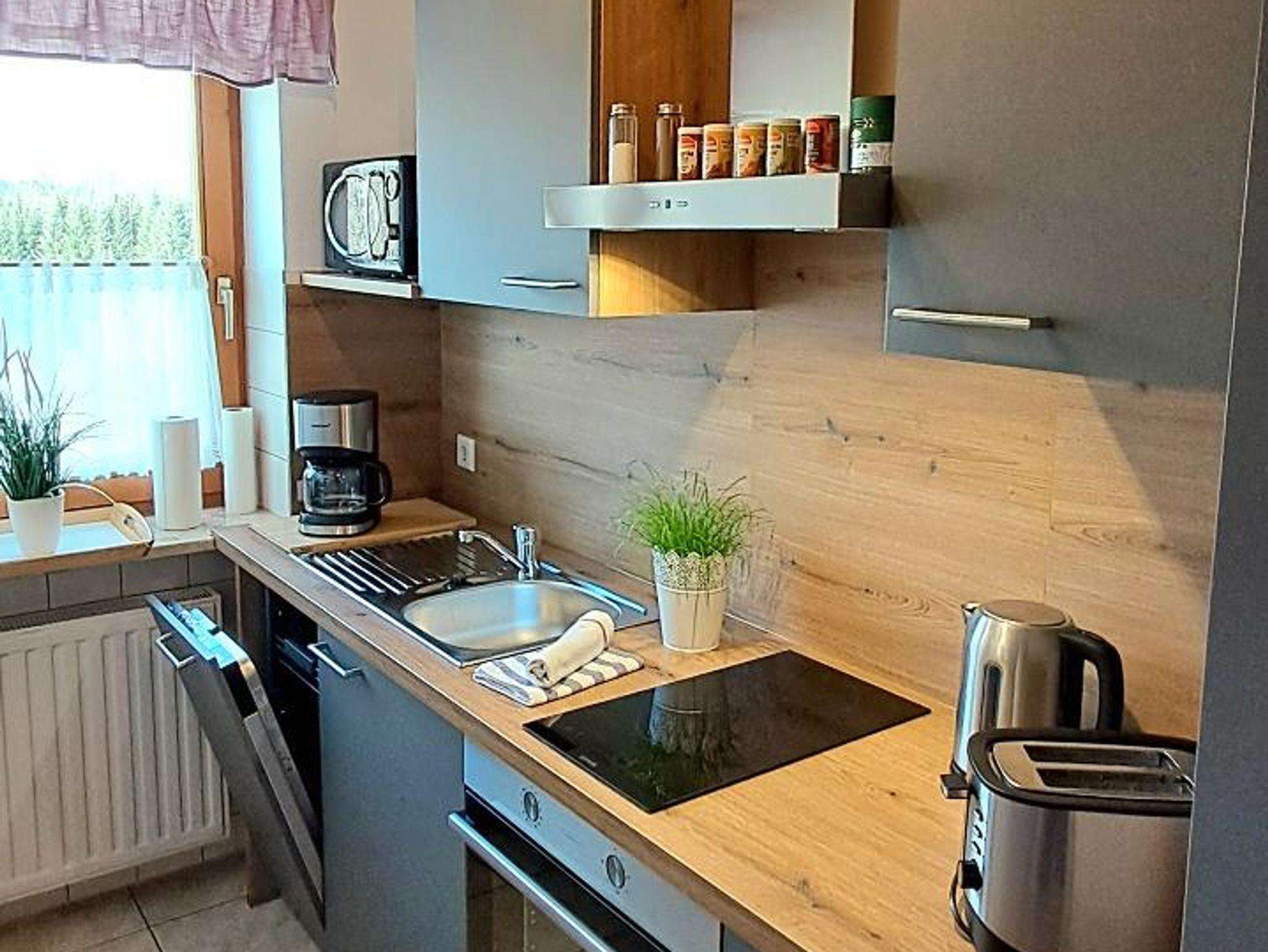 Die komplett ausgestattete Küche mit Kühlschrank, Herd, Backofen, Mikrowelle, Dunstabzug, Radio, Wasserkocher, Toaster und Kaffeemaschine lässt keine Wünsche offen.