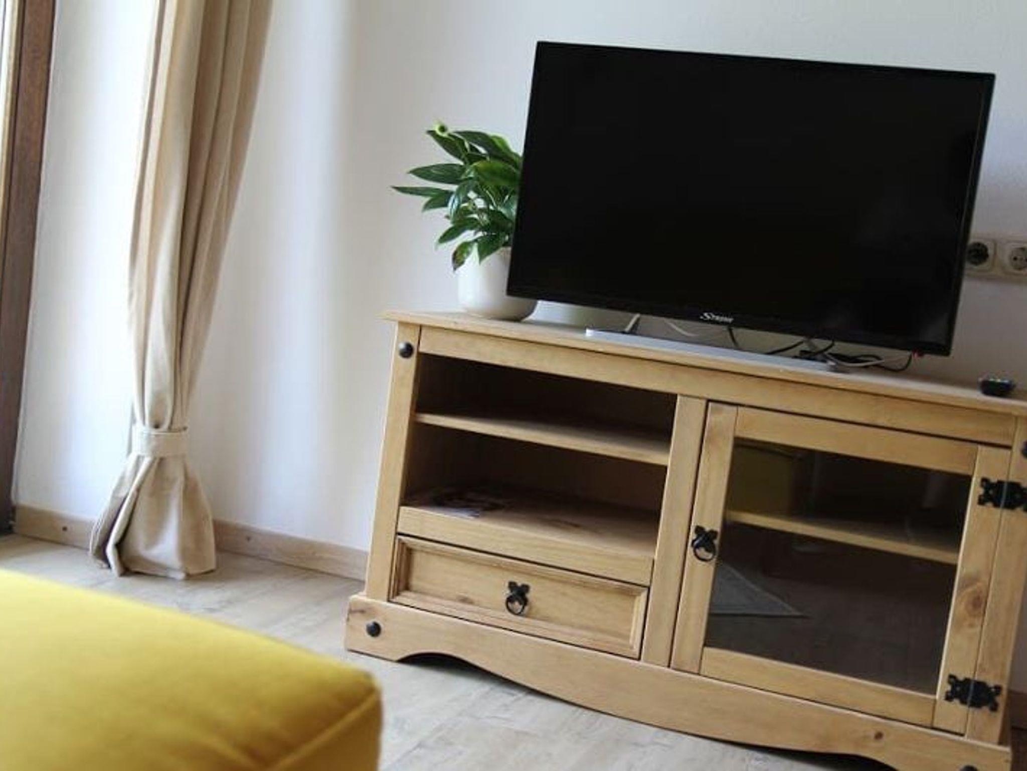 Das helle Wohnzimmer mit gemütlichen Sofa, Flachbild-TV und Zugang zur Südterrasse lädt zum Verweilen ein.