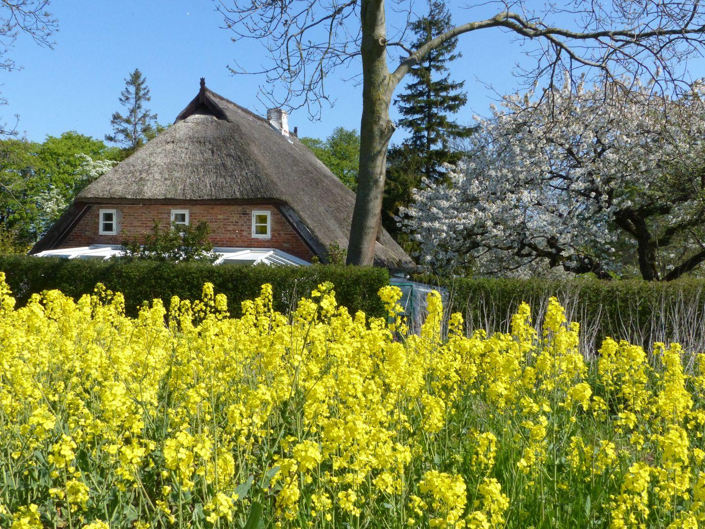 Das Anwesen mit 2 reetgedeckten Häusern stammt aus der Mitte des 19.Jh. und liegt in einem 3000 qm großen Garten, durch den ein kleiner Bachlauf fließt. Uralte Obstbäume und unzählige Blühpflanzen erfreuen den Naturliebhaber vom Frühling bis in den Herbst. Die beiden Wohnungen im Backsteinhaus sind individuell im Landhausstil ausgestattet. Es gibt separate Eingänge und Terrassen, Sat-TV und Telefon und einen Parkplatz. Die kleine Reethaushälfte befindet sich auf dem gleichen Grundstück wie das Backsteinhaus, verfügt über eine eigene Terrasse sowie einen Gartenanteil.