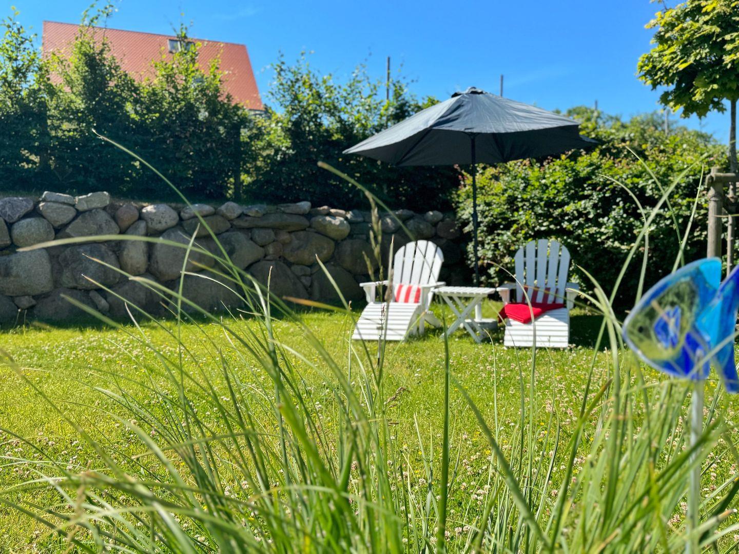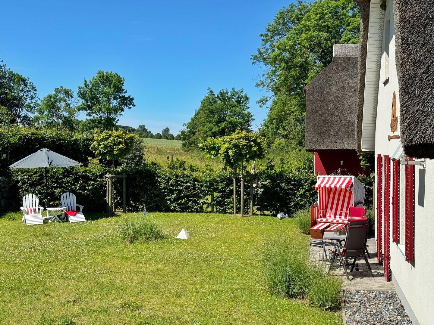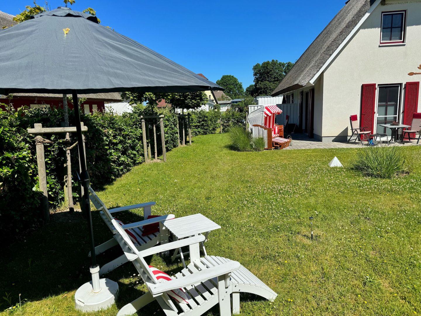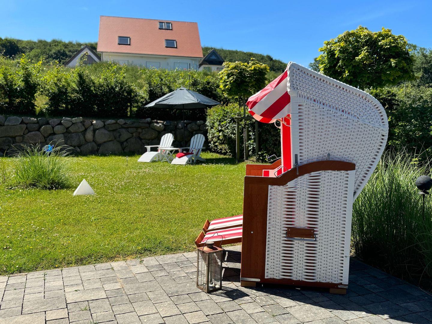 Zum Haus gehören Terrassen mit Gartenmöbeln, ein Strandkorb, Liegestühle, Gasgrill und ein Carport für den Pkw mit einem Schuppen für Fahrräder.