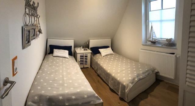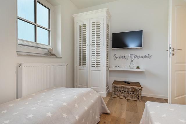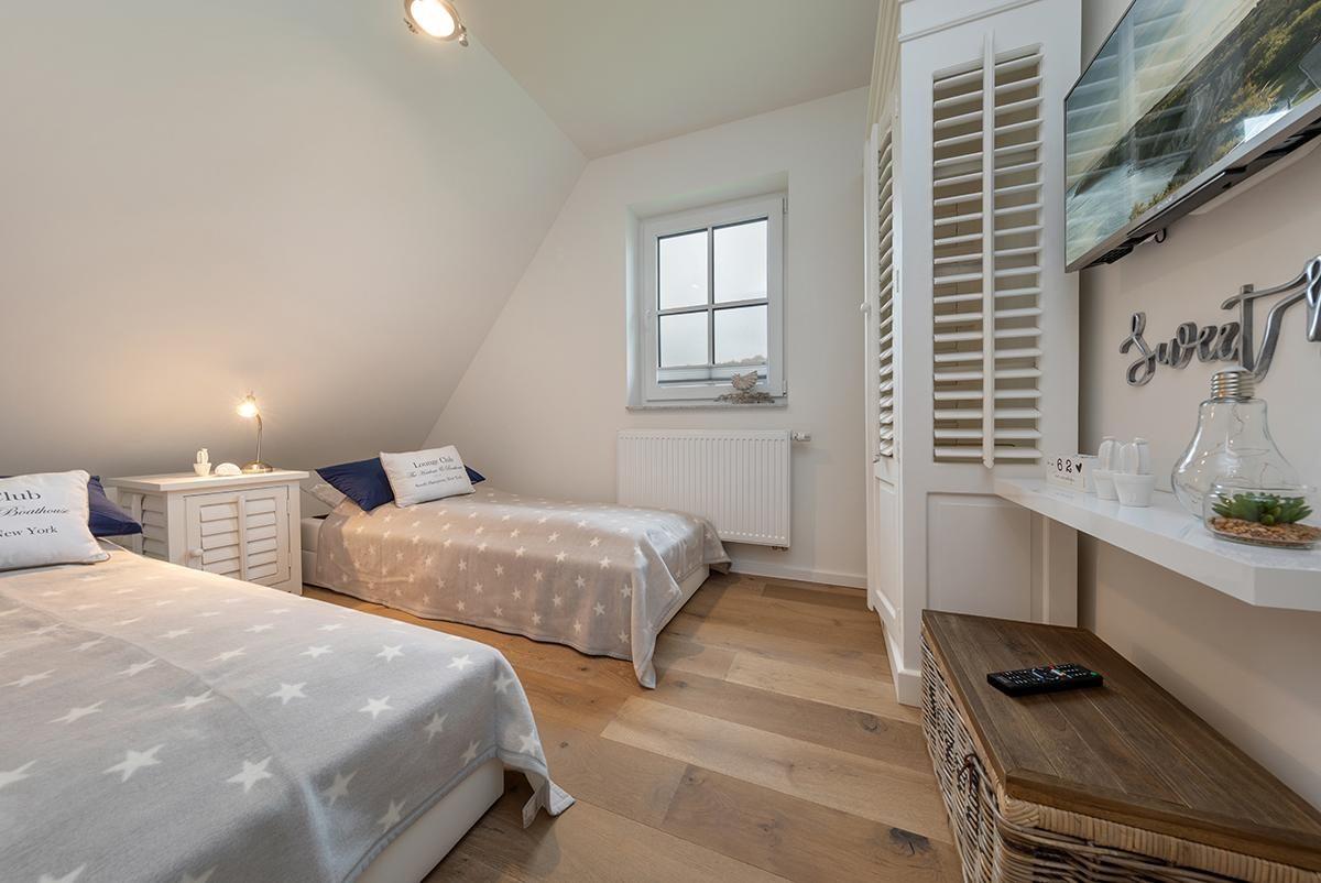 Im Obergeschoß befinden sich die beiden Schlafzimmer. Das eine Schlafzimmer verfügt über ein bequemes Boxspring-Doppelbett und das andere Schlafzimmer über zwei Boxspring-Einzelbetten. Auch dort gibt es TV-Geräte.