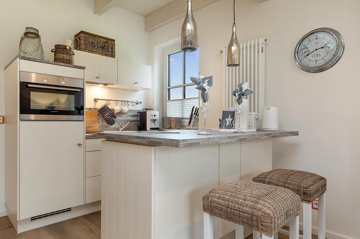 Der Wohnbereich ist in hellen Farben und Holzoptik gemütlich und modern eingerichtet. Die moderne Einbauküche verfügt über Geschirrspüler, Ceranherd, Backofen, Kühlschrank mit Gefrierfach, Wasserkocher, Kaffeemaschine, Kaffeevollautomat, Toaster, Eierkocher, Waffeleisen, Mixer und zahlreiche Küchenutensilien.
