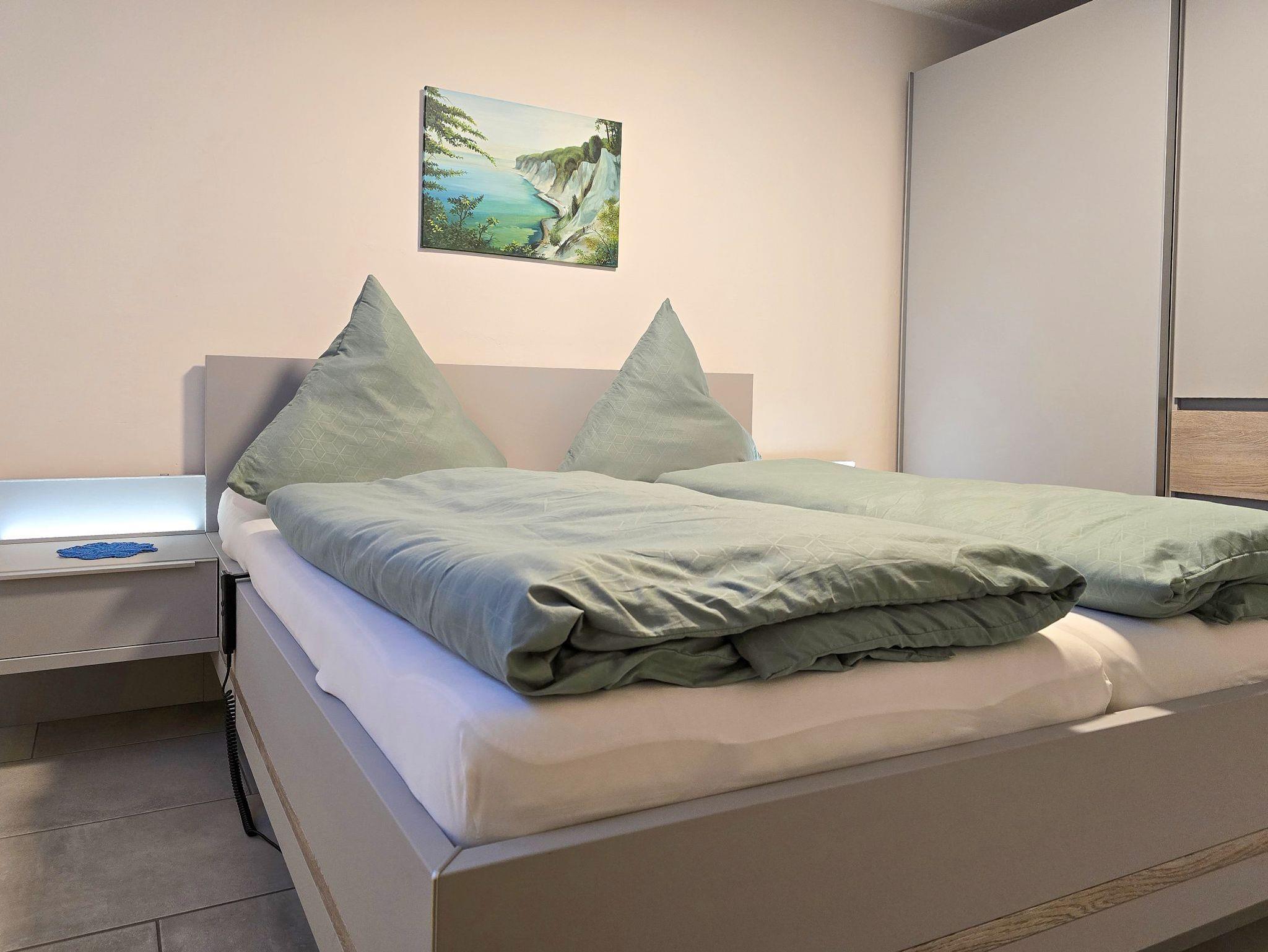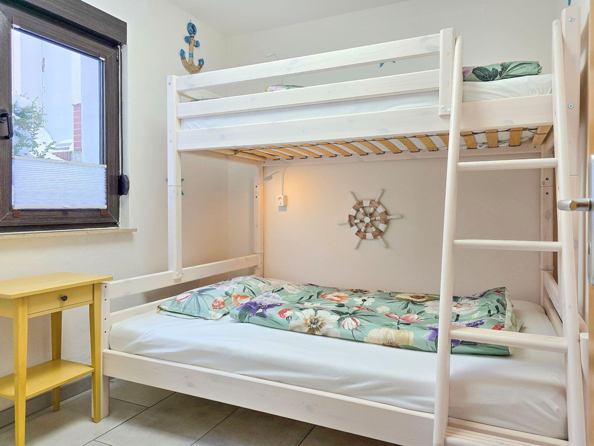 - Ein Schlafzimmer mit Doppelbett und großem Kleiderschrank und Kommode. Ein weiteres Schlafzimmer mit Etagenbett. Das untere Bett hat ein Größe von 1,40 x 2 Meter, die obere Liegefläche von 0,90 x 2 Meter und kann bis max. 60 Kg belastet werden.