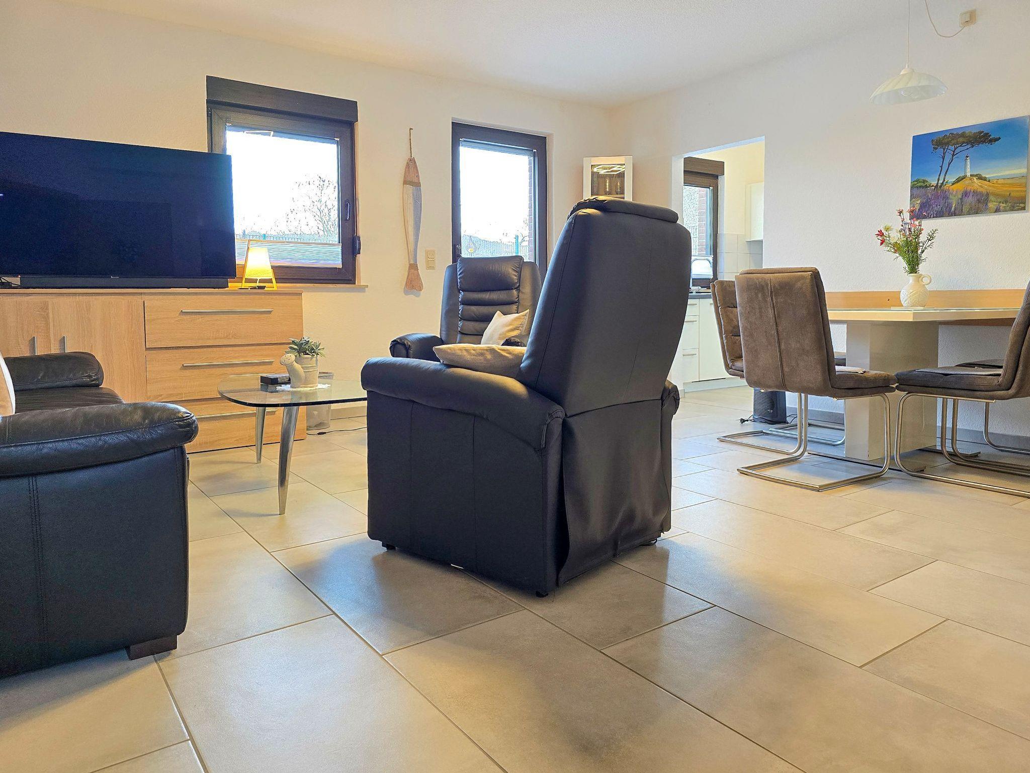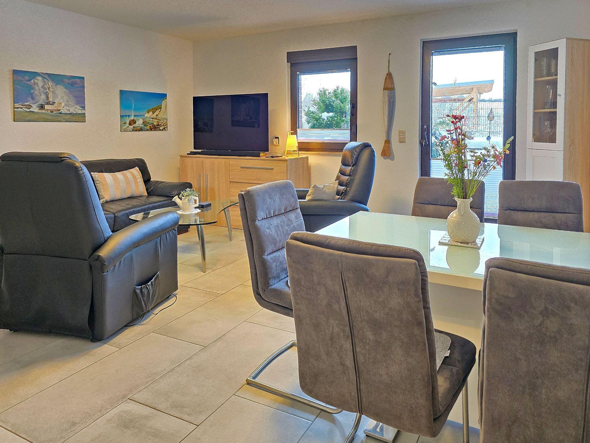 - Im Wohn-Essbereich erwartet Sie ein gemütliches Sofa mit Sesseln, ein großer Flachbild-TV, Blu-ray-Player, Radio und ein Esstisch mit 5 Stühlen. Des Weiteren gibt ein Schrankbett für die 5. Person.