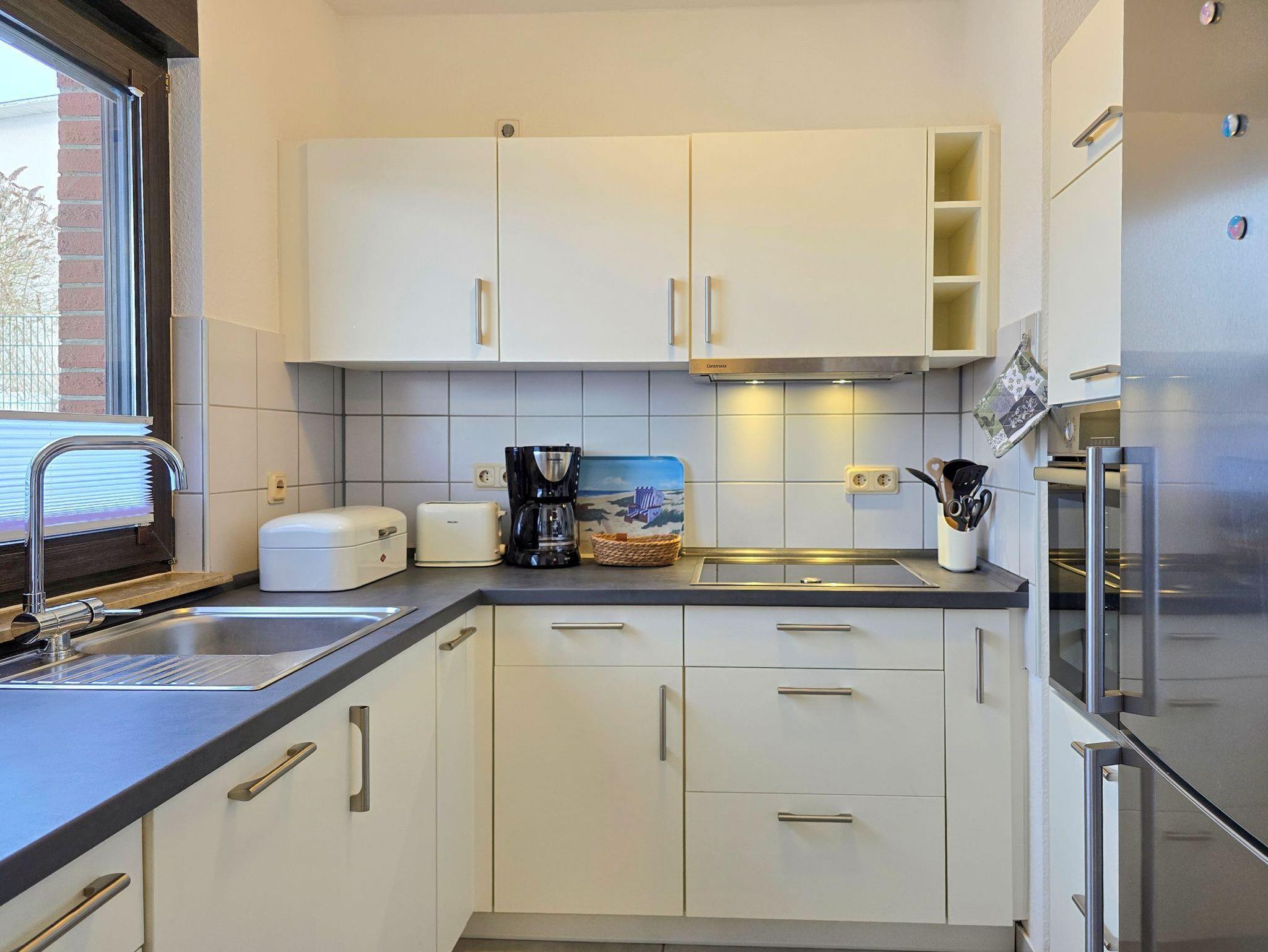 - Die Küche ist offen zum Wohnbereich mit Ceranherd (Induktion), Backofen, Kühlschrank, großem Tiefkühlschrank, Geschirrspüler, Mikrowelle und verfügt über diverse Küchenutensilien.