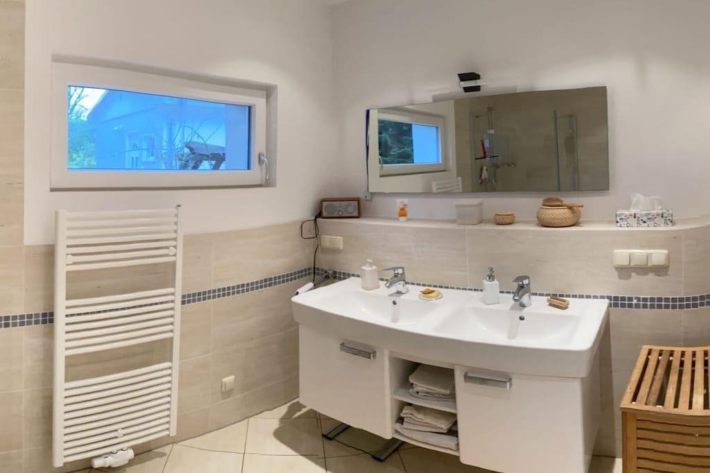 The holiday home "Atelier" (97 sqm) is located 50 meters above the harbor of Lohme and offers you a unique view of the Baltic Sea and the famous Kap Arkona sunsets. The house has two separate bedrooms with a double bed (160*200) or two single beds. There is also a sofa bed (140*200) in the living room. There is a WiFi connection, TV, radio and CD player. The fitted kitchen is equipped with high-quality appliances (fridge/freezer, washing machine, oven, ceramic hob, microwave, dishwasher, coffee machine, kettle, toaster, etc.). The bathroom has a shower, double washbasin, toilet and bidet. The terrace (14 sqm) in the private garden (400 sqm) invites you to relax and unwind.