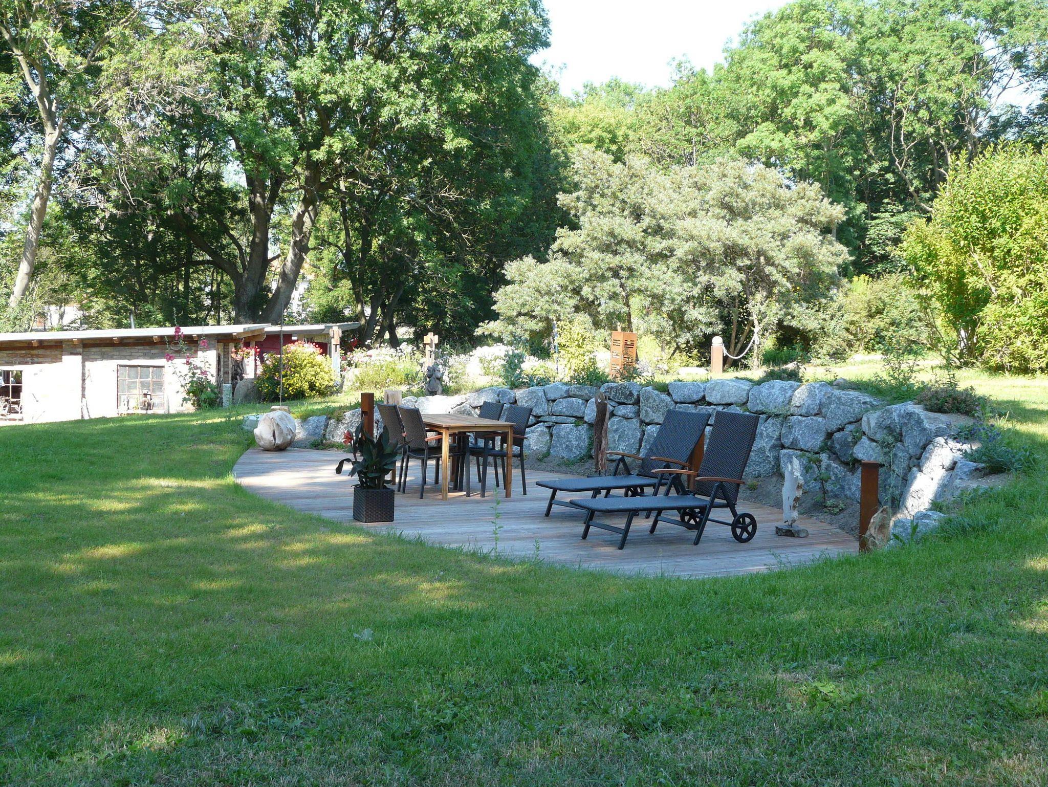 Zu jeder Wohnung gehört eine Außenterrasse mit Gartenmöbeln, Sonnenschirm und Grillmöglichkeit. Darüber hinaus finden Sie bei uns einen großen Natur- und Nutzgarten, in dem Sie neben vielfältig angelegten Beeten auch noch Wegrandblumen und Heilpflanzen sowie verschiedene Ruhezonen mit Sitzgruppen und Liegen zum Entspannen finden. Manchmal ganz offensichtlich, bisweilen recht versteckt können Sie im Garten Kunstobjekte des Hausherren entdecken und bei Gefallen käuflich erwerben.